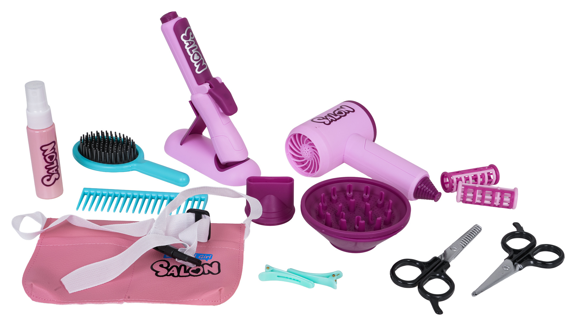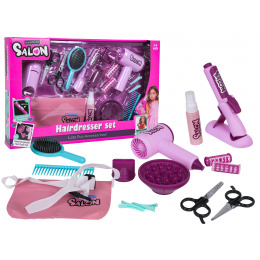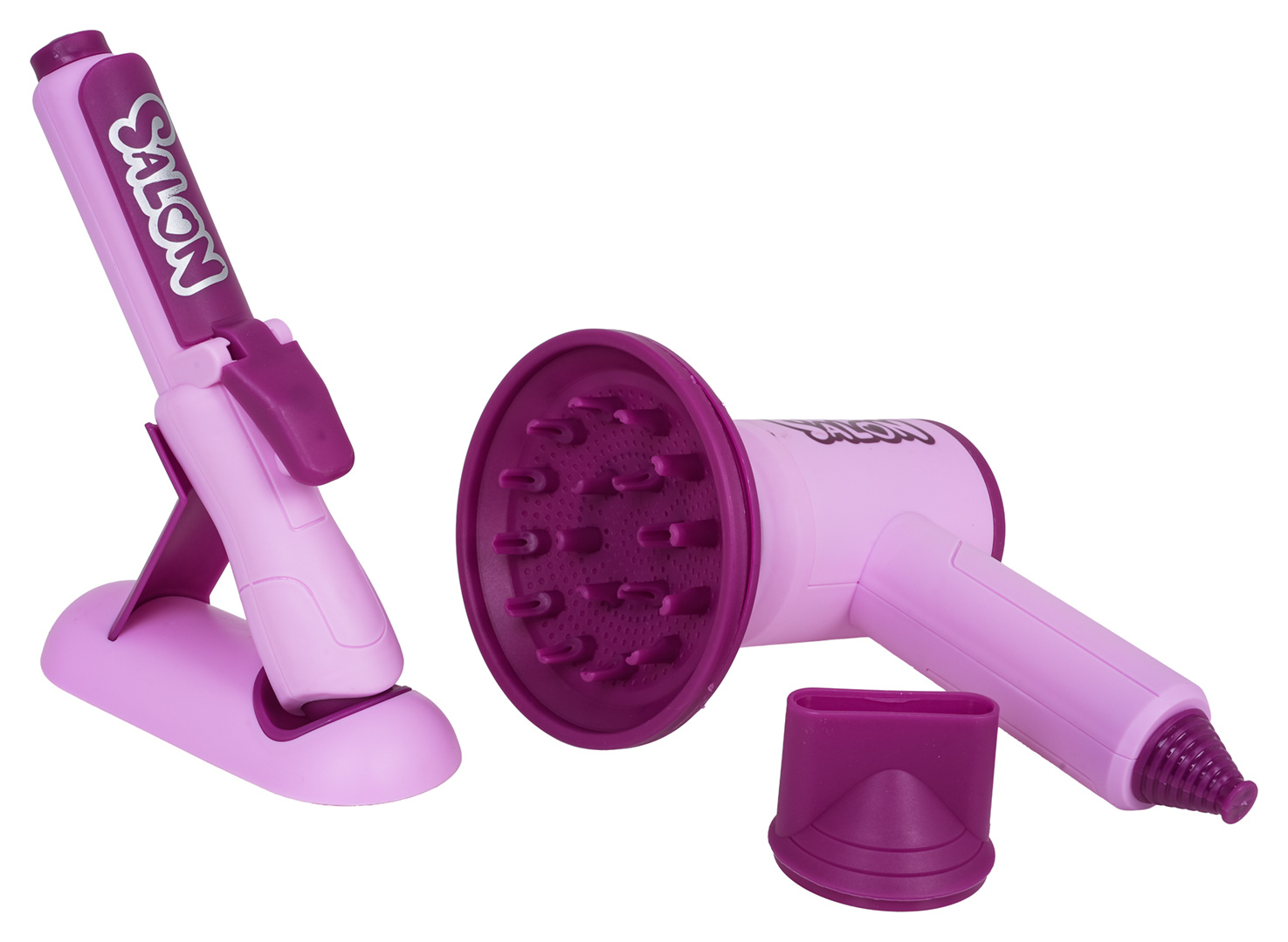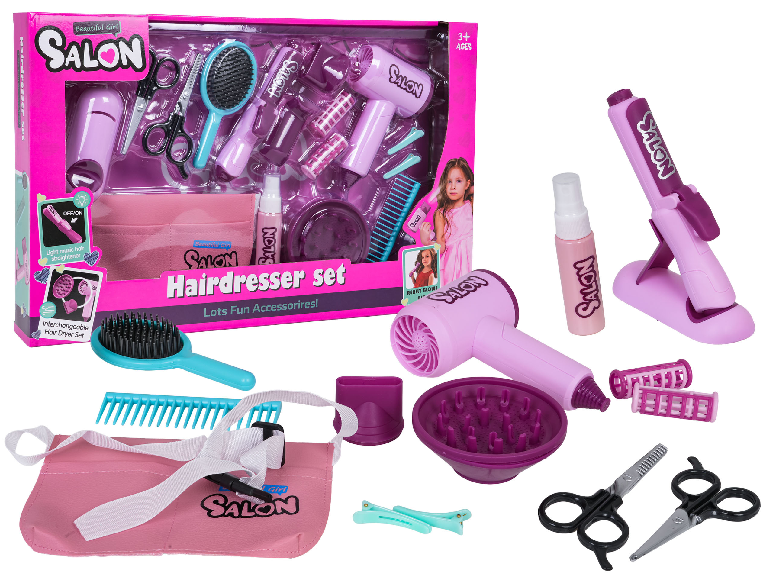Bohatě vybavená sada malé kadeřnice pro děti od tří let. Sada je vyrobena z nejkvalitnějšího plastu, s důrazem na detaily. Součástí sady je fén s vyměnitelnými nástavci, žehlička na vlasy, 2 sponky, hřebínek, dva druhy nůžek, kartáč, lahvička na vlasovou kosmetiku a 2 natáčky na vlasy. Všechny prvky sady lze umístit do kadeřnické tašky s páskem, vyrobené z růžové ekokůže. Žehlička na vlasy je napájena bateriemi typu 2 x AG13 (v balení), fén bateriemi typu 2 x AAA 1,5 V (nejsou součástí balení). Žehlička na vlasy má podsvícení a fén vydává zvuky sušení a má lehký proud vzduchu.