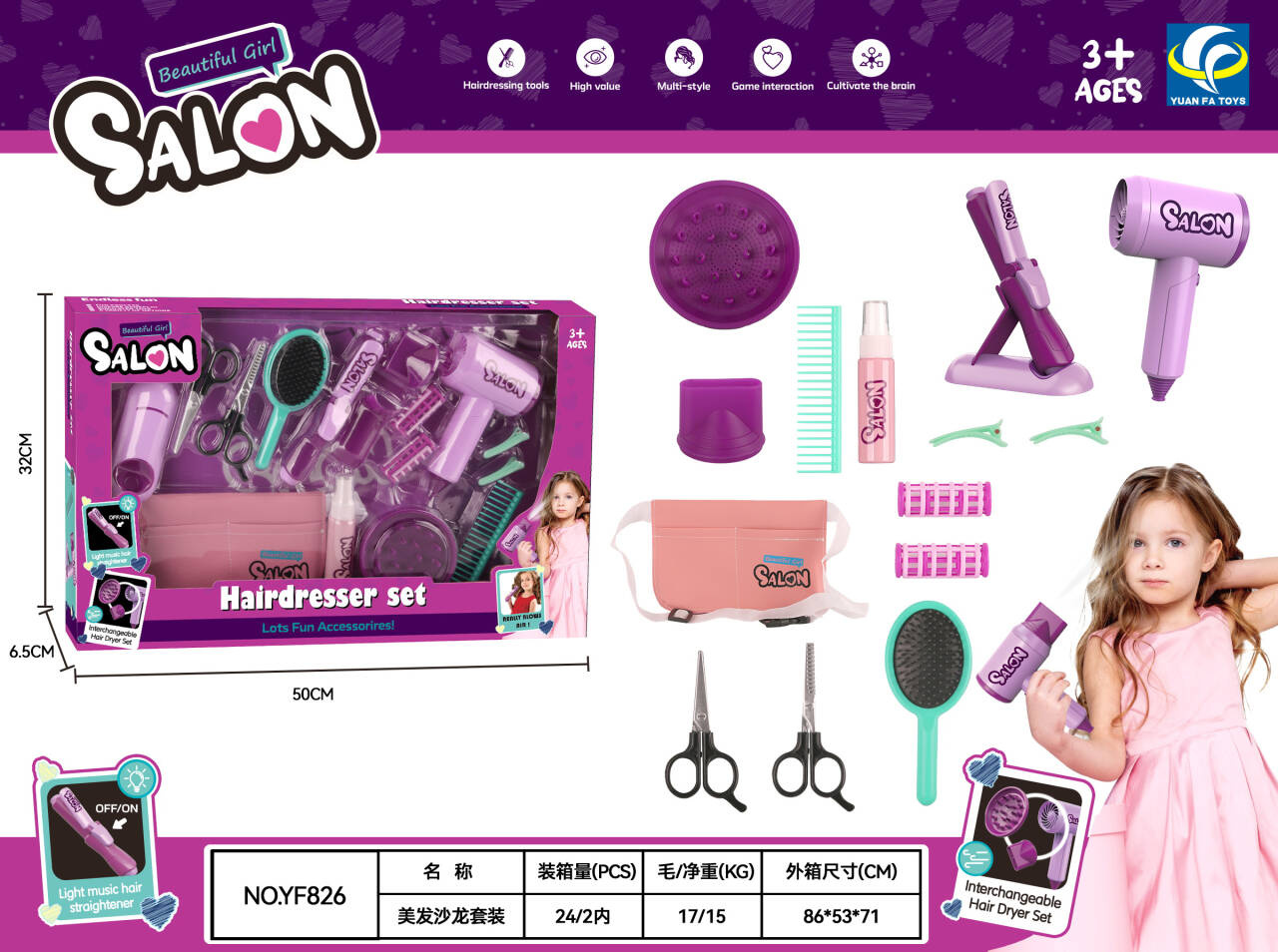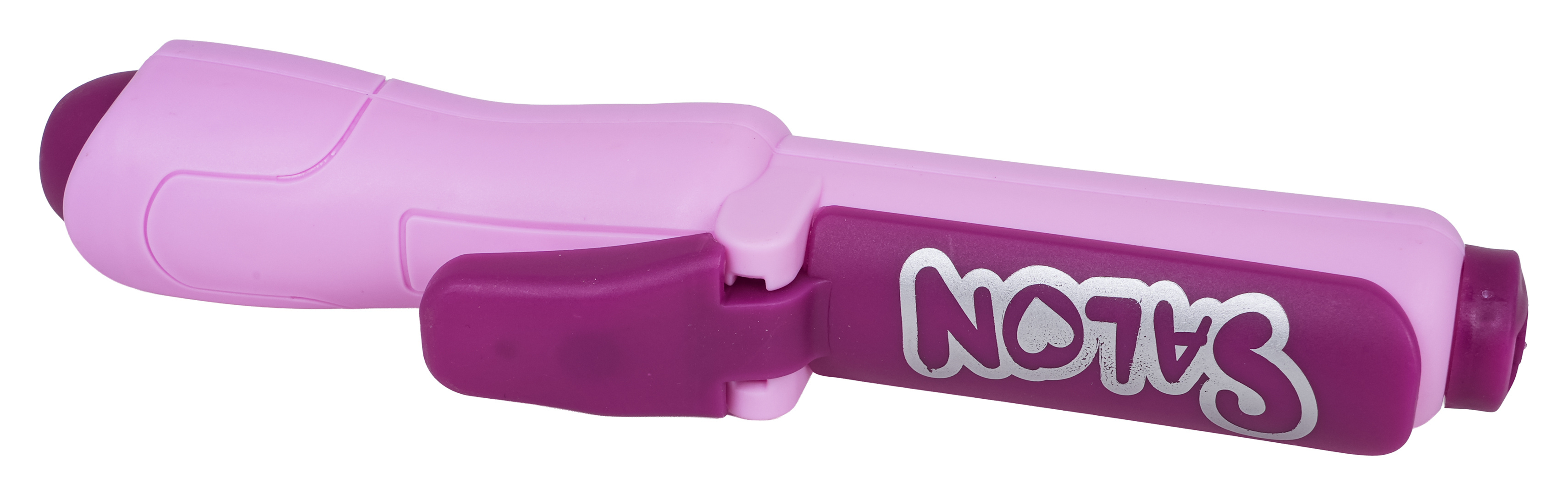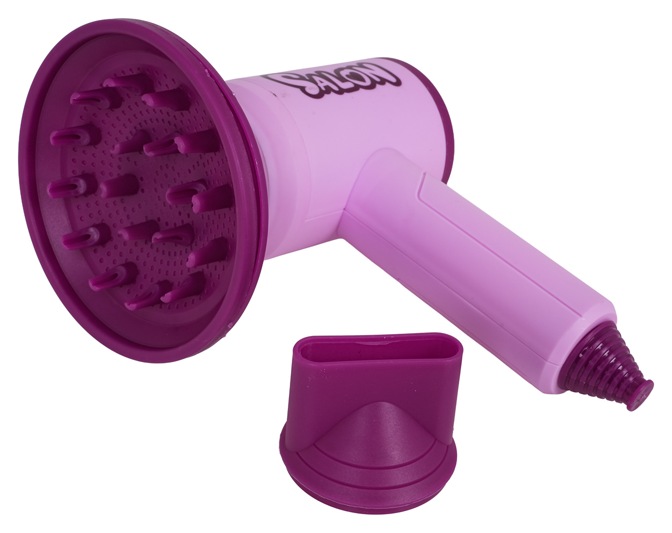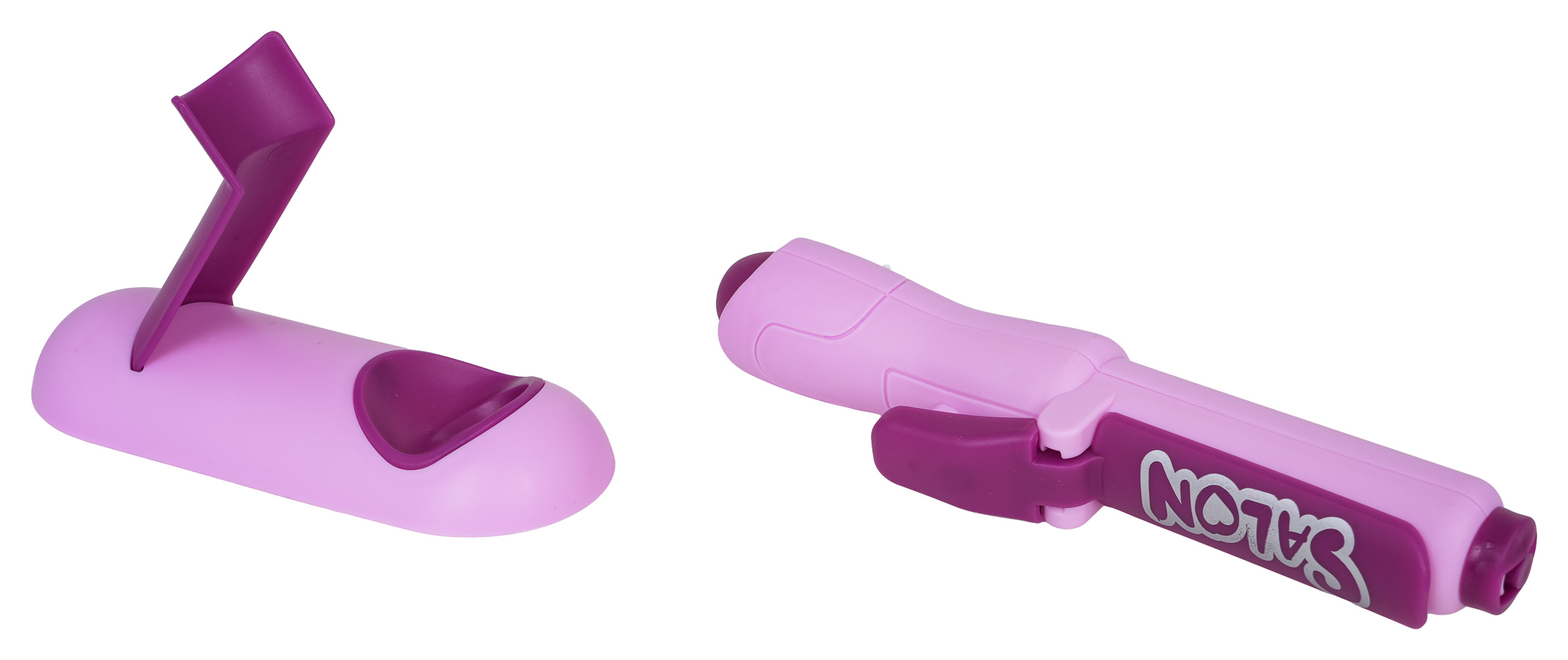 Bohatě vybavená sada malé kadeřnice pro děti od tří let. Sada je vyrobena z nejkvalitnějšího plastu, s důrazem na detaily. Součástí sady je fén s vyměnitelnými nástavci, žehlička na vlasy, 2 sponky, hřebínek, dva druhy nůžek, kartáč, lahvička na vlasovou kosmetiku a 2 natáčky na vlasy. Všechny prvky sady lze umístit do kadeřnické tašky s páskem, vyrobené z růžové ekokůže. Žehlička na vlasy je napájena bateriemi typu 2 x AG13 (v balení), fén bateriemi typu 2 x AAA 1,5 V (nejsou součástí balení). Žehlička na vlasy má podsvícení a fén vydává zvuky sušení a má lehký proud vzduchu.