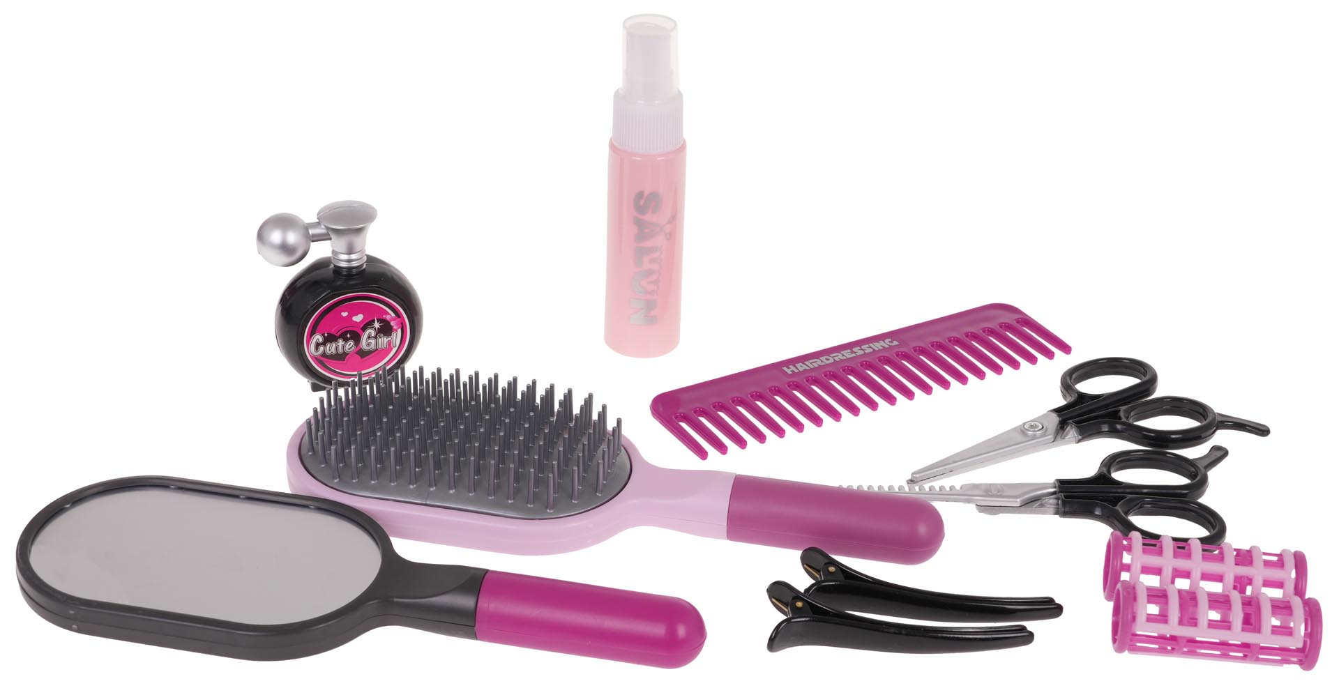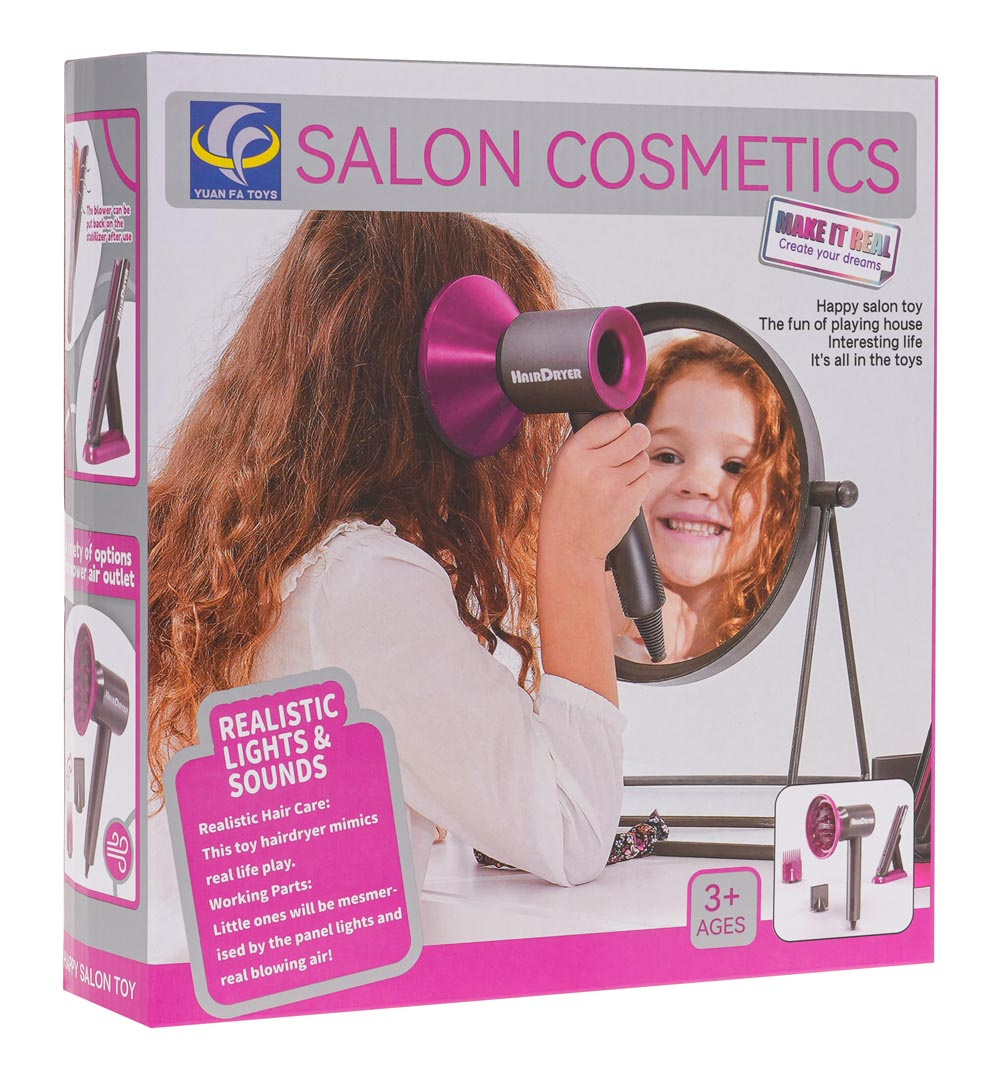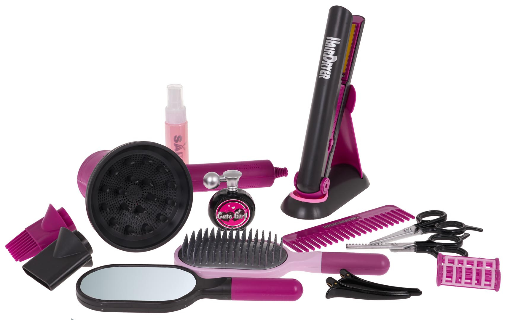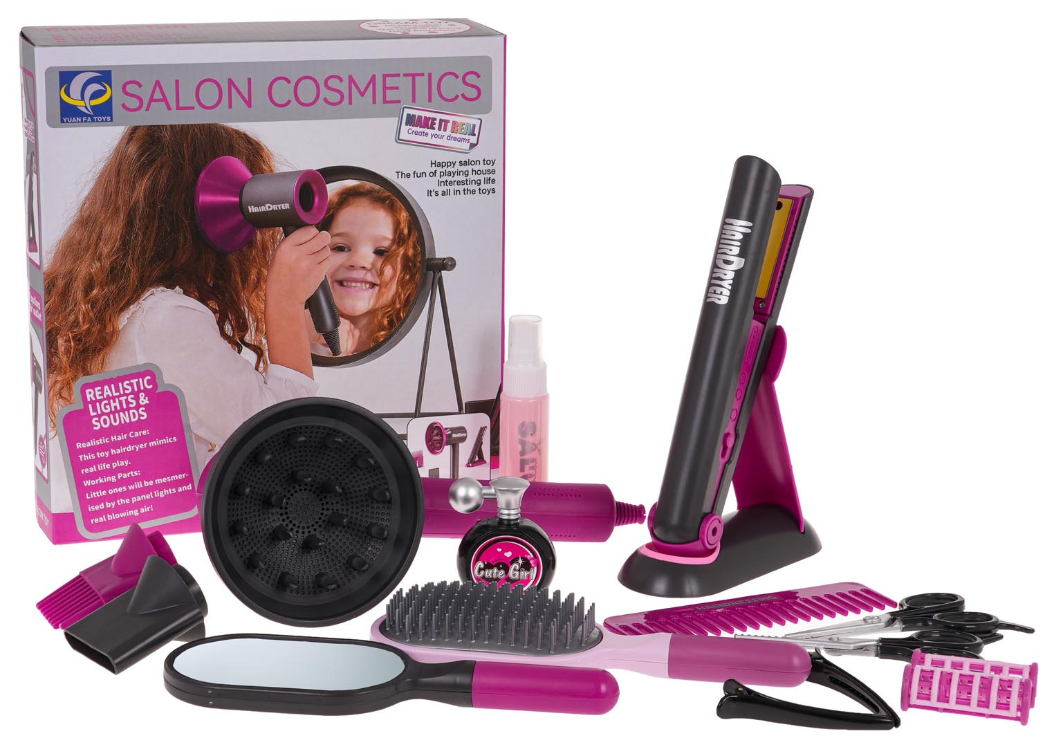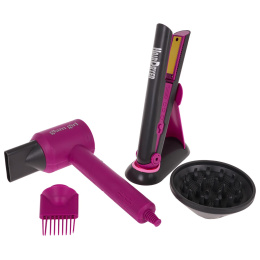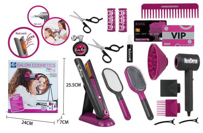 Interaktivní, bohatě vybavená kadeřnická sada s fénem s vyměnitelnými nástavci a žehličkou na vlasy na baterie, je určena pro děti od 3 let. V sadě najdeme širokou škálu nástrojů nezbytných pro práci kadeřníka, včetně fénu, žehličky na vlasy, nůžek, hřebenů na vlasy a dalších doplňků. Fén na vlasy vydává zvuk sušení a emituje proud vzduchu. Žehlička na vlasy má světelné efekty a zvuky doprovázející narovnávání vlasů. Fén na vlasy je napájen bateriemi typu 2 x AA (nejsou součástí balení), žehlička na vlasy bateriemi 2 x AAA (nejsou součástí balení).