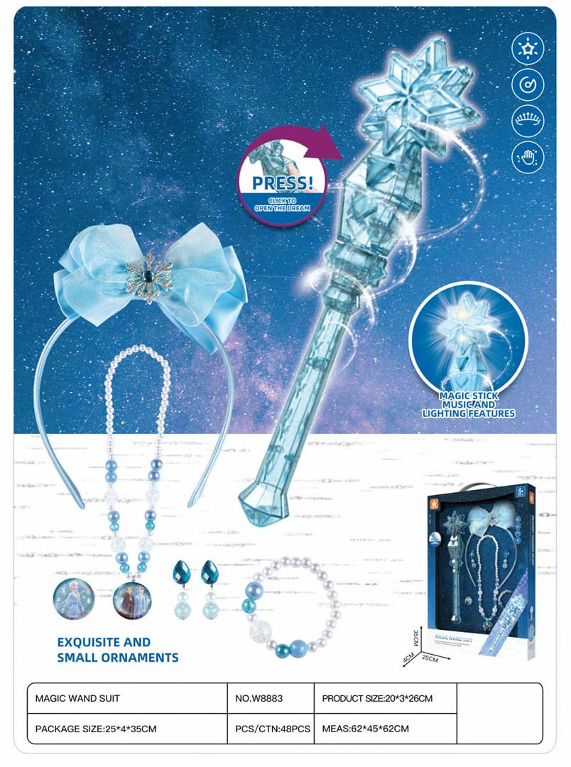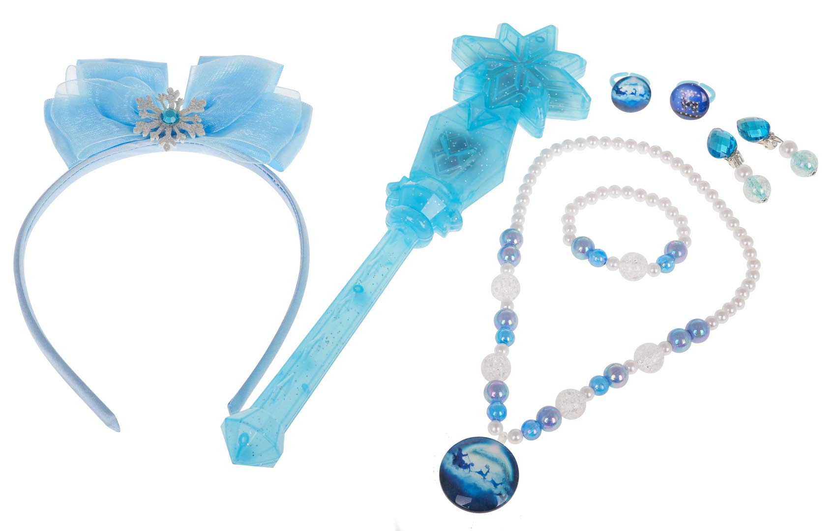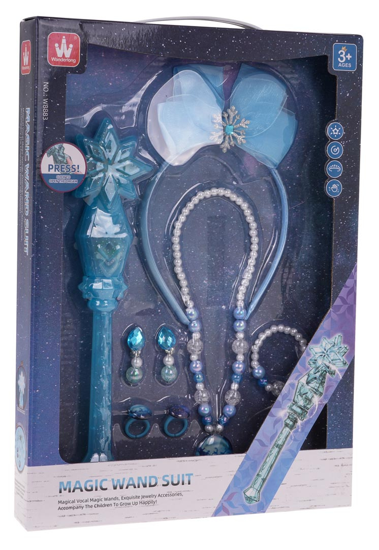 Vynikající, nádherně provedená sada malé princezny je určena pro děti od 3 let. Sada se skládá z čelenky, hůlky s efekty zvuku a světla, korálků, náramku, prstýnků a náušnic. Hůlka je napájena bateriemi typu 3 x AG13 (v balení).