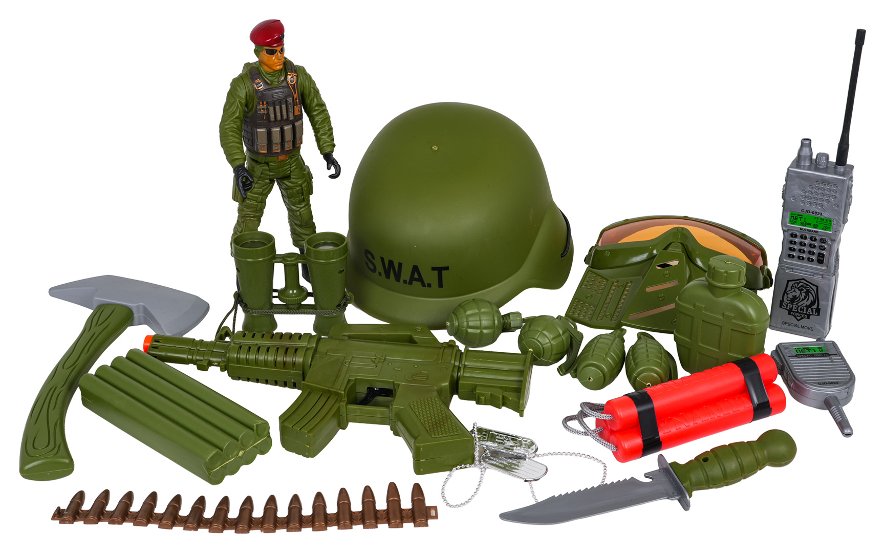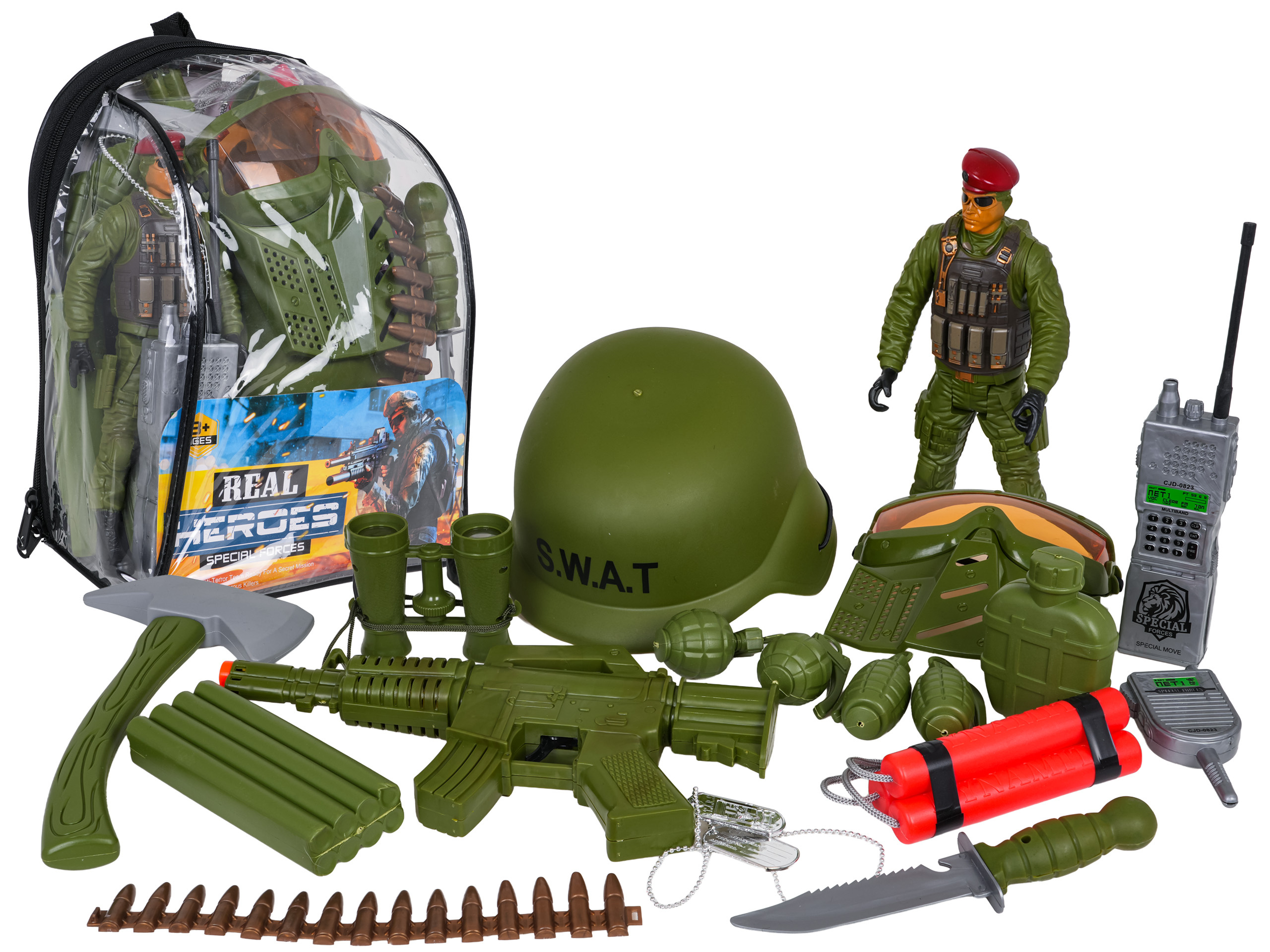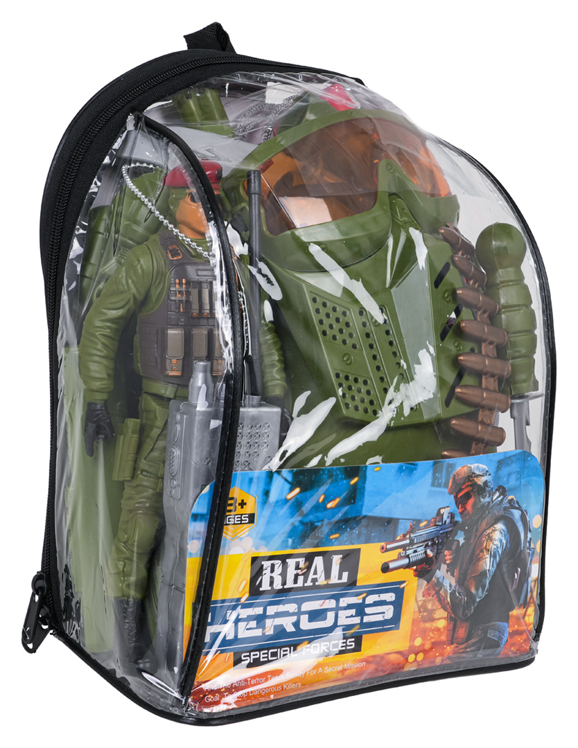 | - průhledný batoh, - helma, - brýle s maskou, - nůž, - vysílačka, - píšťalka, - polní láhev na vodu, - telefon, - sekyrka, - dalekohled, - karabina se zvukem výstřelu, - pás s náboji, - 4 granáty - figurka vojáka s pohyblivými rukama a nohama, - výbušnina, - identifikační známka. |