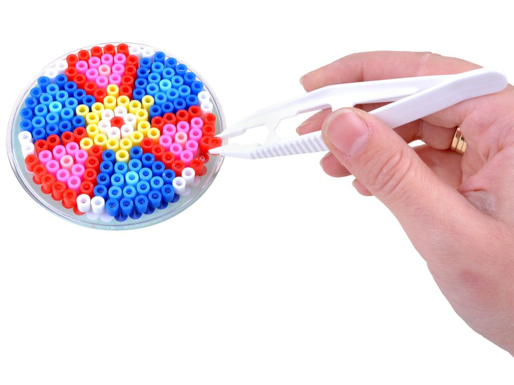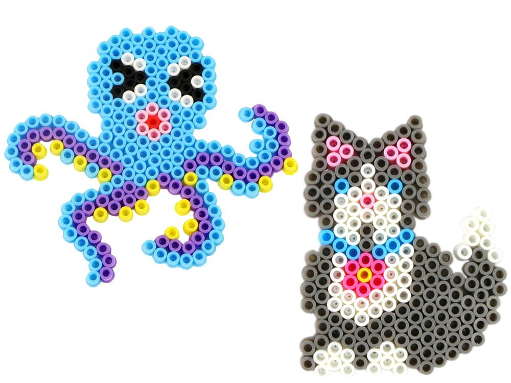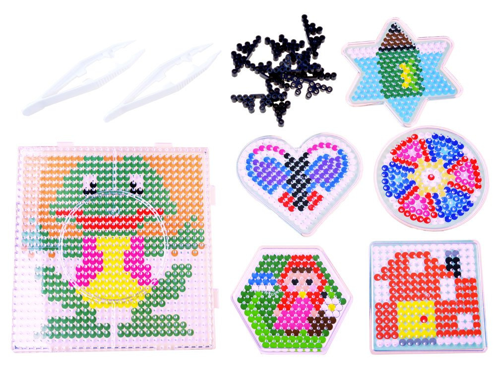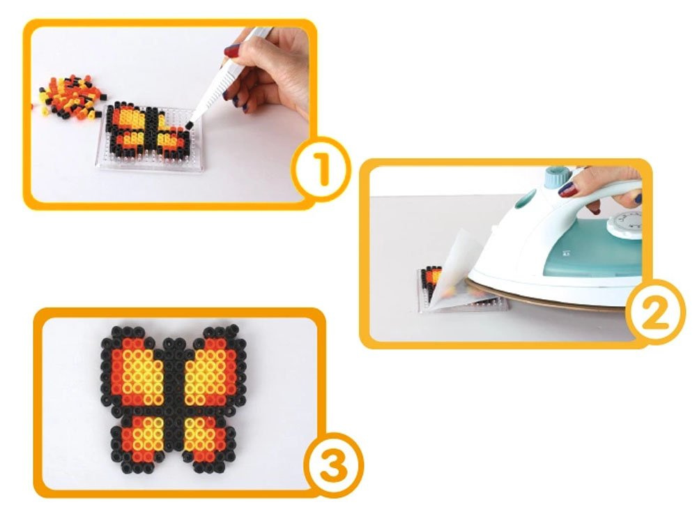 Na podložku umístěte vybraný vzor a poté korálky zažehlete žehličkou přes přiložený papír (žehlička by měla být nastavena na střední teplotu). Vymáčknutou mozaiku položte na několik minut pod těžký předmět a je hotovo!