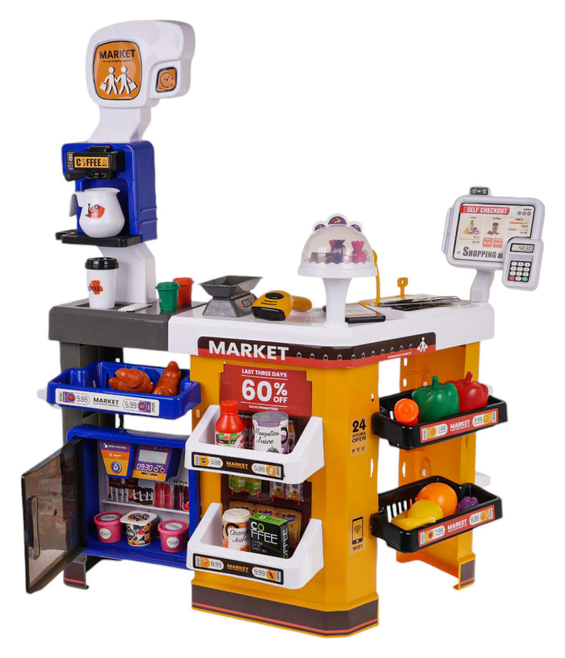 Bezpečný, barevný, interaktivní set supermarket – obchod, se skládá ze 64 prvků a je určen pro děti od 3 let. Sada má zvukový a světelný efekt (pokladna s čtečkou karet, skener). Pokladna je napájena dvěma bateriemi typu AA 1,5 V (nejsou součástí balení), skener je napájen dvěma bateriemi typu AAA 1,5 V (nejsou součástí balení). Obchod - market má otevírací pokladnu, čtečku karet, skener, mikrofon, váhu, poličky, ledničku a velmi mnoho atrap potravinových produktů. K sadě je také připojen velký nákupní vozík. Hra na obchod rozvíjí u Vašeho dítěte kreativní myšlení, pomáhá při učení počítání, třídění předmětů, procvičuje chování v každodenních situacích.