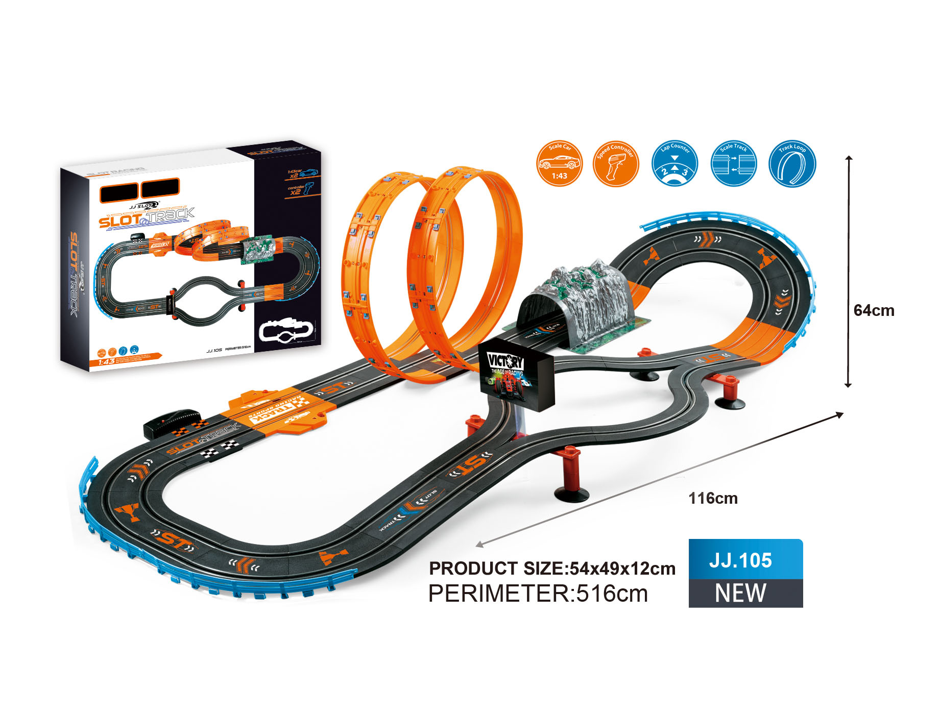 Velká závodní dráha s ostrými zatáčkami, smyčkami a autíčky na dálkové ovládání v měřítku 1:43 je vhodná pro děti od 6 let. Na trati mohou jezdit dva vozy současně. Směr jízdy a rychlost se ovládají dálkovým ovládáním. Každé vozidlo se ovládá samostatným dálkovým ovladačem. Dráha byla vyrobena z nejkvalitnějších materiálů, což zaručuje její odolnost a robustnost. Dráha obsahuje rovné úseky, ostré zatáčky se zábranami proti vypadnutí vozidla z dráhy, tunel a také dvě 360stupňové smyčky. Celková délka dráhy je 516 cm. Dálkové ovladače a vozidla jsou napájeny elektrickou energií 220 V-50 Hz, napájecí zdroj je součástí dodávky.