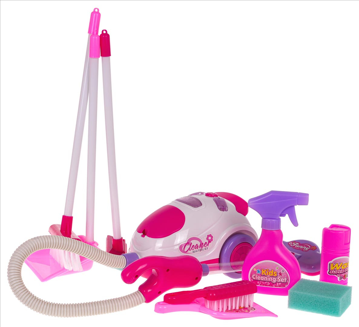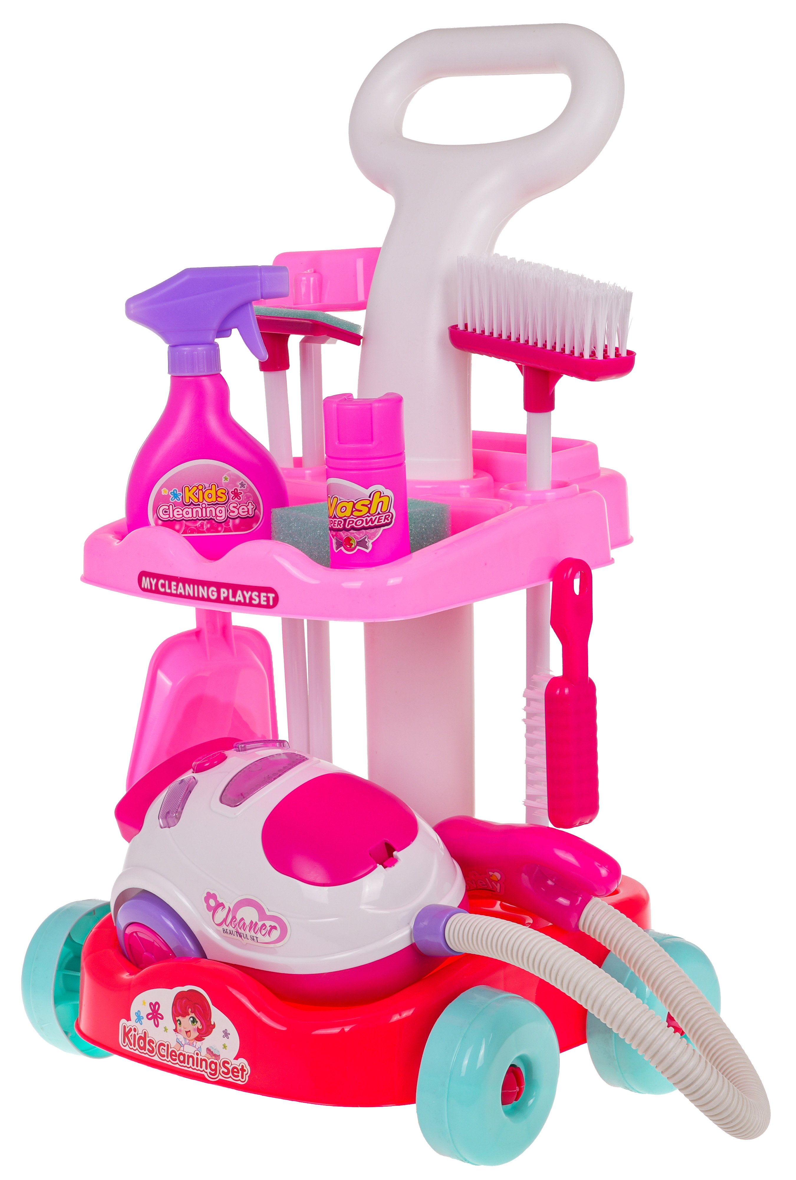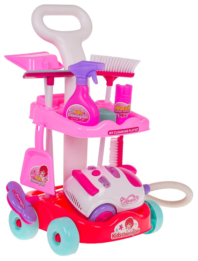 Bohatě vybavená úklidová sada s interaktivním vysavačem pro děti od 3 let. Sada byla vyrobena z nejkvalitnějšího plastu v živých barvách. Na sestavu se skládá vozík s rukojetí na tlačení a kolečky a dvěma poličkami, interaktivní vysavač, koště a úklidové doplňky. Vysavač je napájen bateriemi typu 3 x AA 1,5 V (nejsou součástí balení), vydává zvuky vysávání, má osvětlení a nasává drobné nečistoty z povrchu.