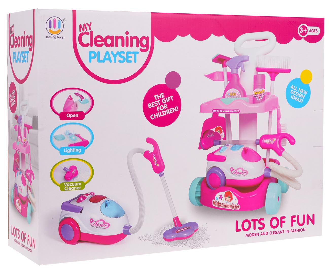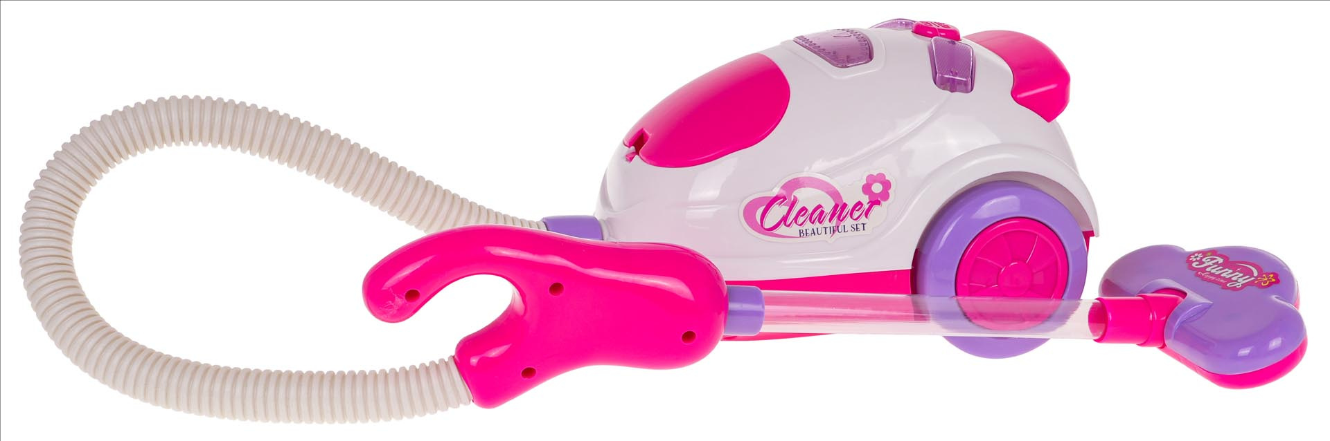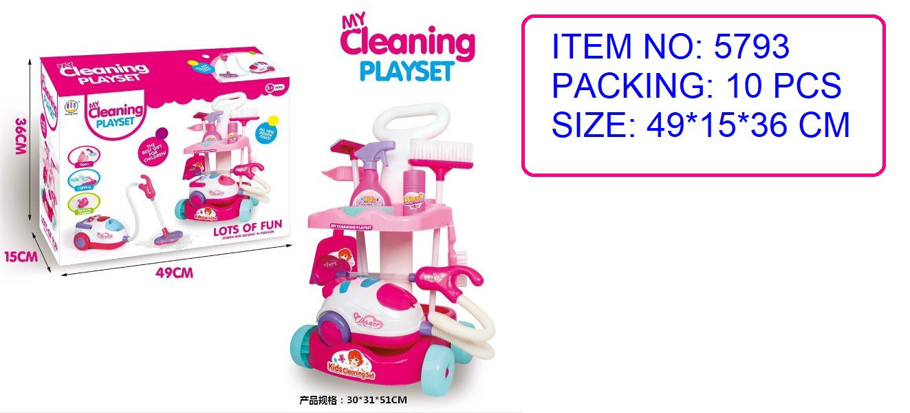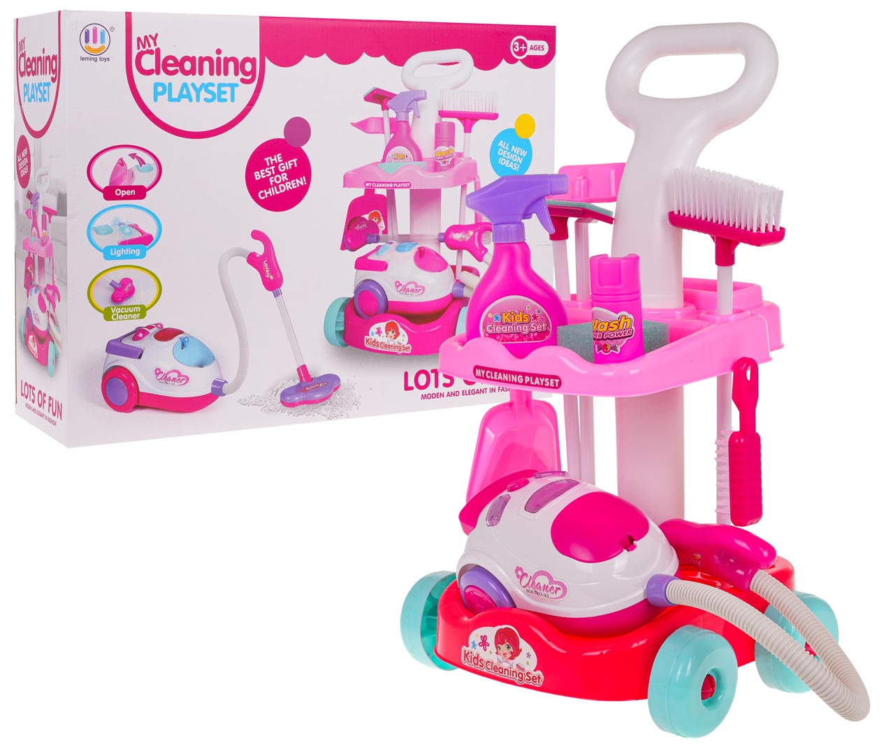 Bohatě vybavená úklidová sada s interaktivním vysavačem pro děti od 3 let. Sada byla vyrobena z nejkvalitnějšího plastu v živých barvách. Na sestavu se skládá vozík s rukojetí na tlačení a kolečky a dvěma poličkami, interaktivní vysavač, koště a úklidové doplňky. Vysavač je napájen bateriemi typu 3 x AA 1,5 V (nejsou součástí balení), vydává zvuky vysávání, má osvětlení a nasává drobné nečistoty z povrchu.