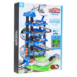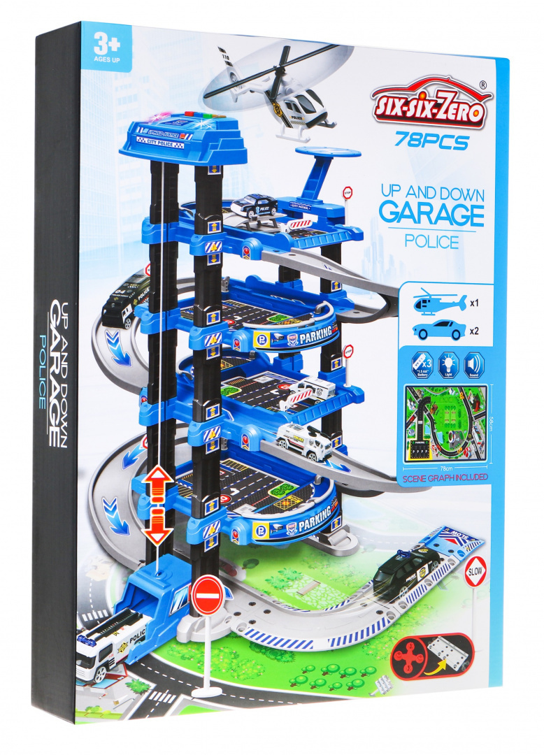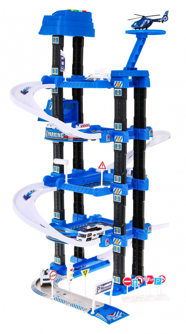 Velké víceúrovňové policejní parkoviště je vhodné pro děti od 3 let. Parkoviště se skládá z pěti úrovní, na které se dostanete výtahem nebo po skluzavce. Na cestě z úrovně do úrovně se dítě setká s mnoha atrakcemi. V dolní úrovni je dráha, po které mohou jezdit vozidla, výše v dalších úrovních jsou parkovací místa pro vozidla. Na samém vrcholu je přistávací plocha pro vrtulníky a výtah s blikajícími světly, zvuky, který jezdí nahoru a dolů. Sada obsahuje dvě vozidla, vrtulník, dopravní značky a také podložku s ulicemi a budovami pro parkování. Hračka je napájena 3 bateriemi AA 1,5 V, které nejsou součástí balení.
