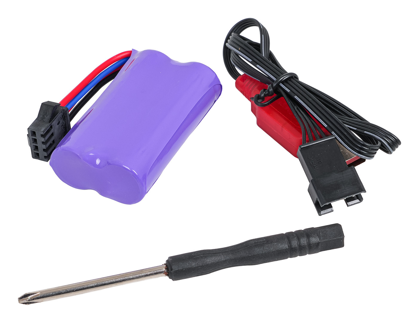 | - bílá vodní pistole, - akumulátor 7,4 V, - kabel pro nabíjení USB, - šroubovák. |