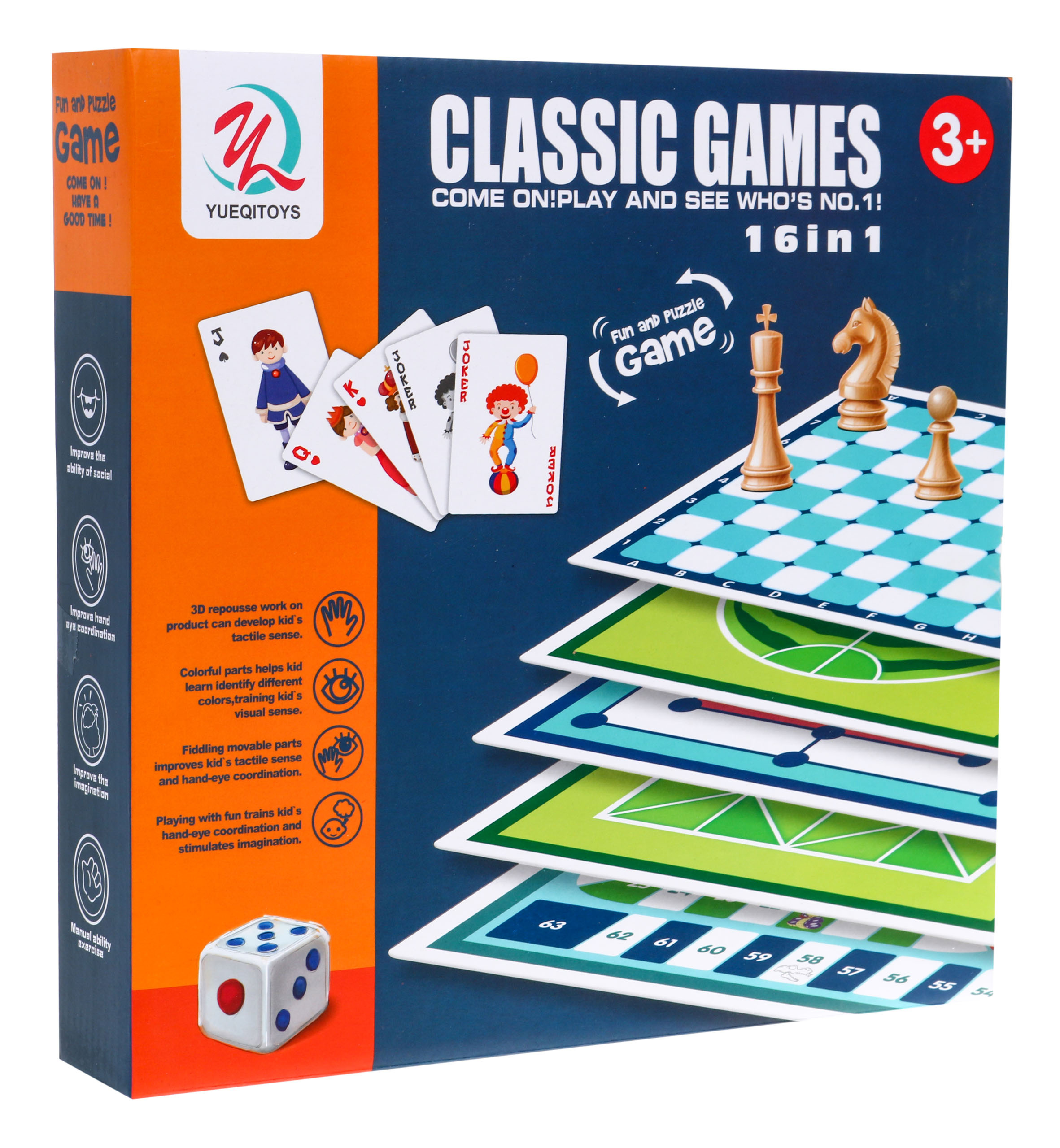 Herní set 16 v 1 je určen pro děti od 3 let. Skvělý způsob, jak společně strávit volný čas. Každý si v ní najde něco pro sebe, na výběr je až 16 her a spousta příslušenství potřebného k jejich hraní.