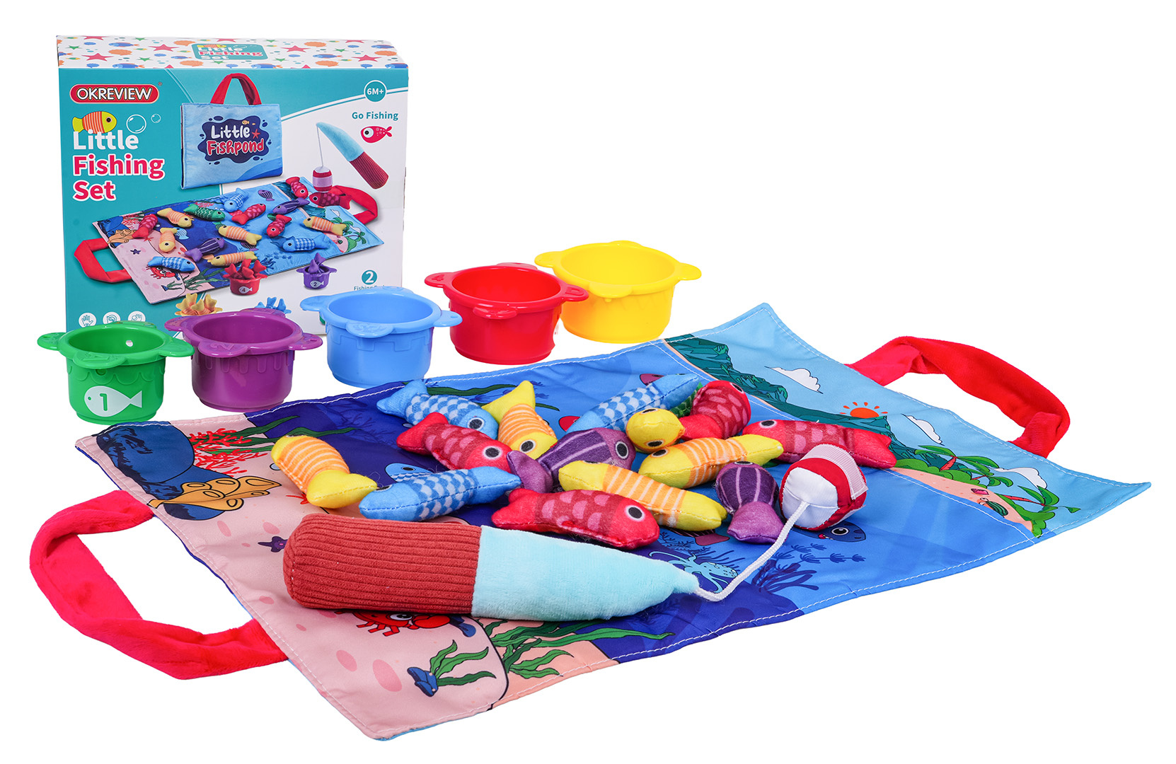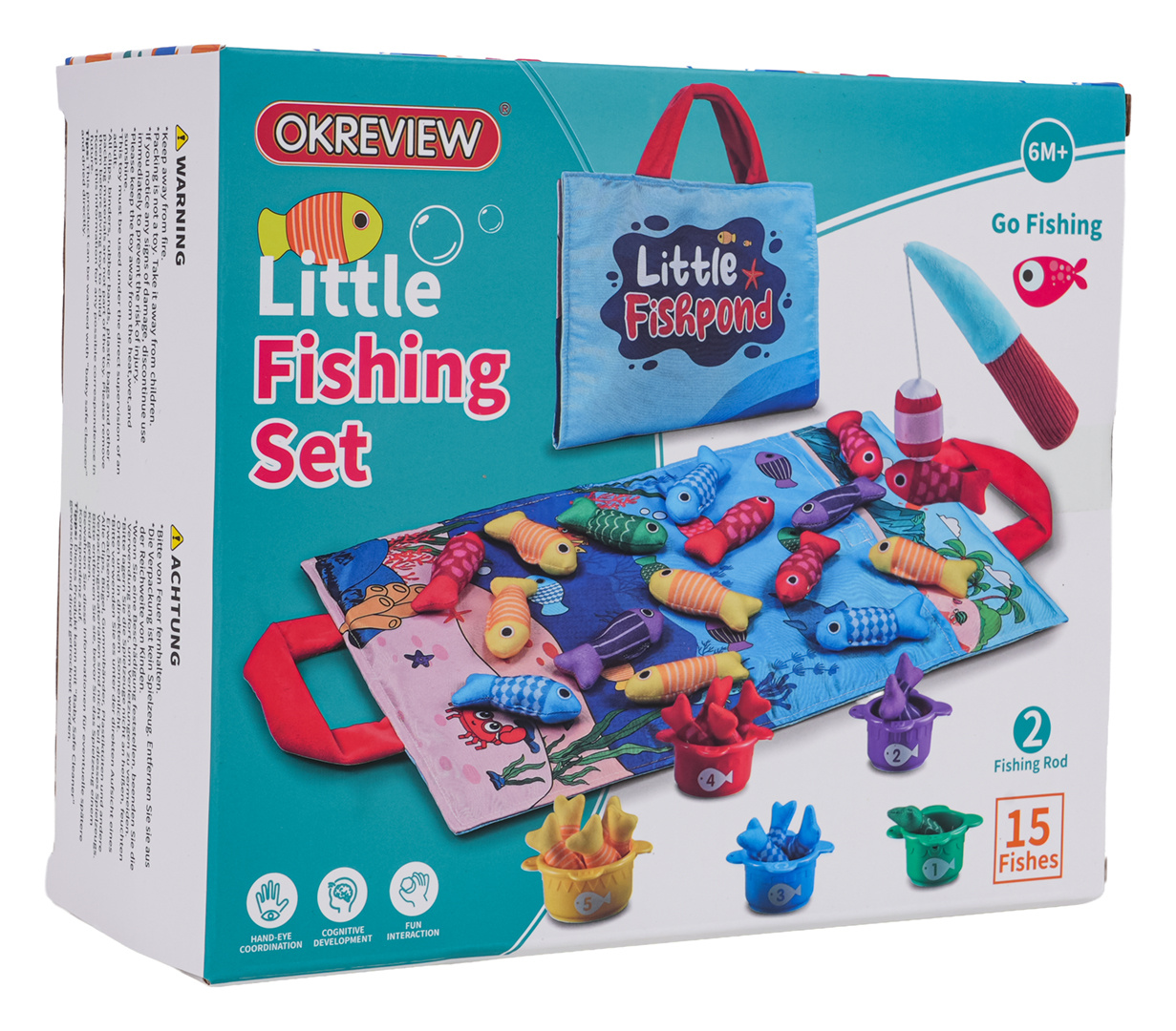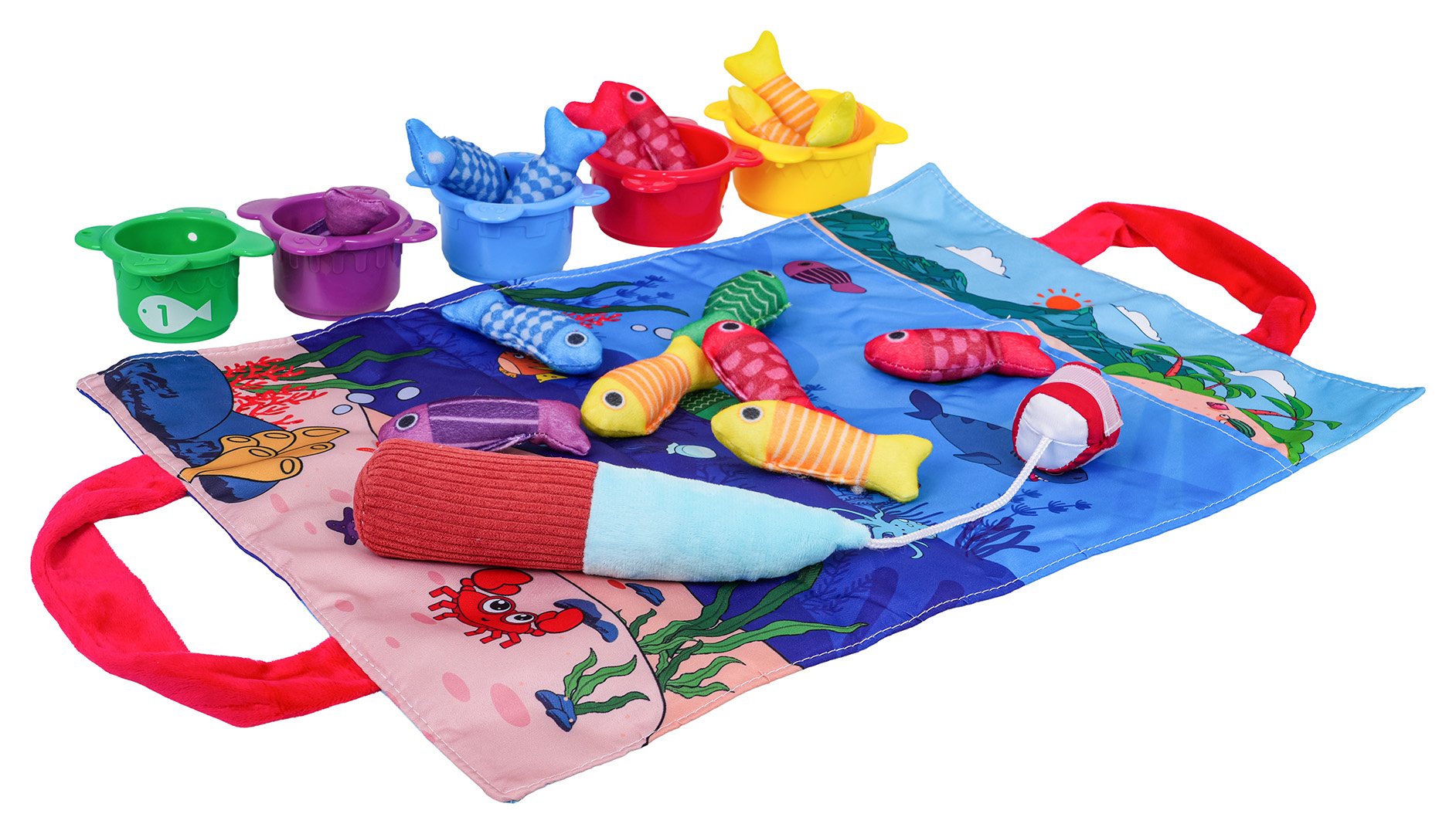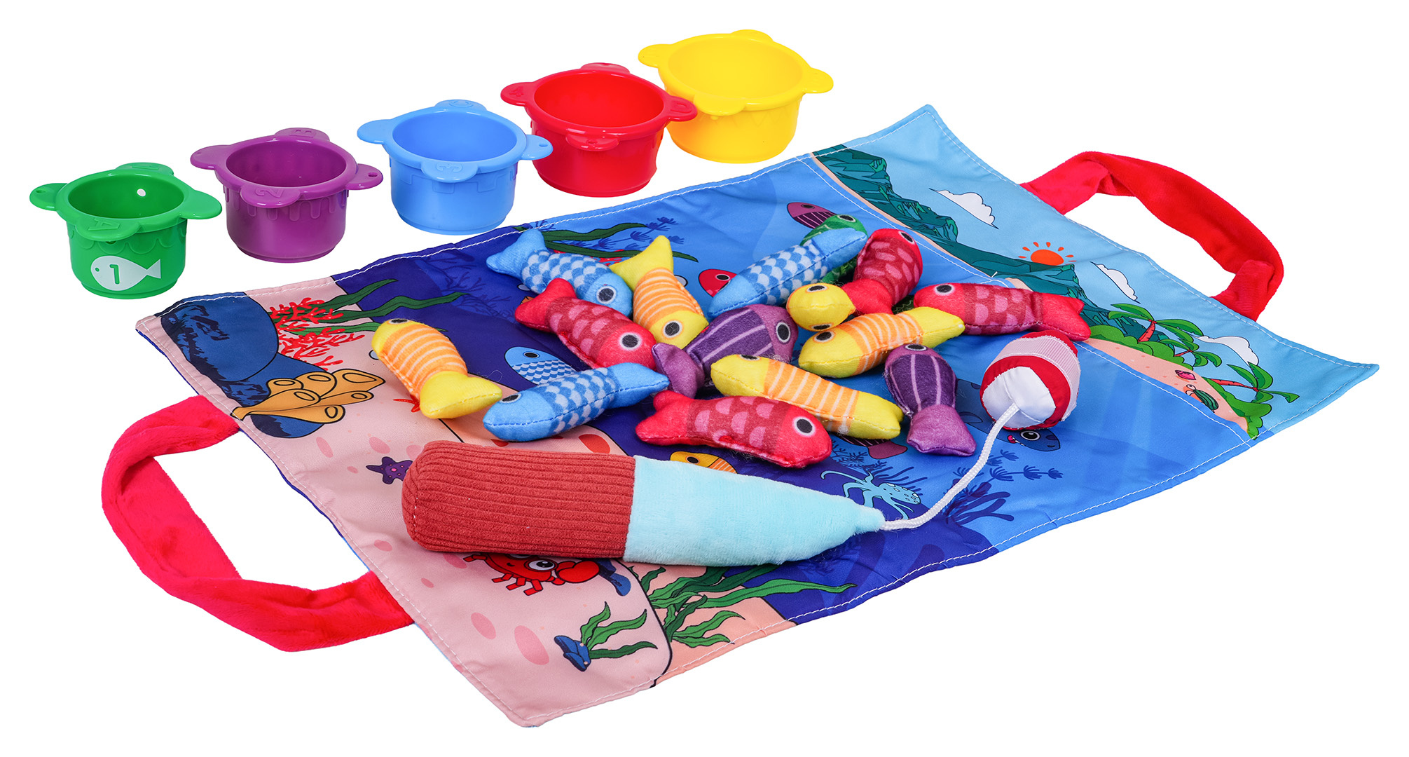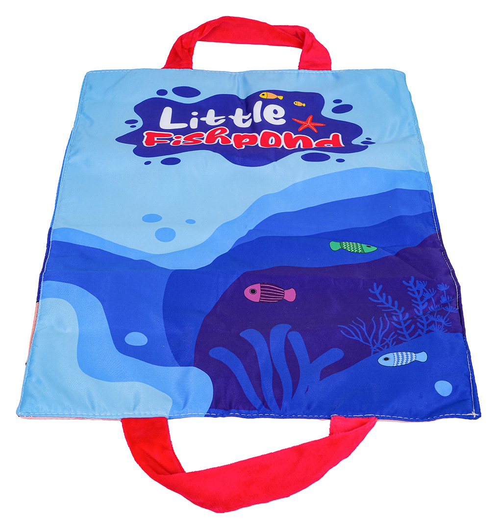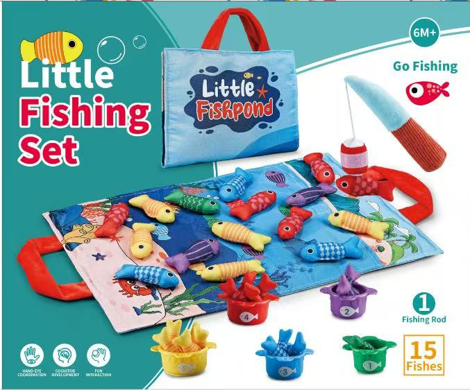 Měkká senzorická sada na lovení rybiček pro malé děti od šestého měsíce života. Sada je vyrobena z materiálů bezpečných pro děti v živých barvách, stimuluje dítě na mnoha úrovních. Živé barvy přitahují pozornost dítěte a povzbuzují ho k uchopení a hře. Sada obsahuje: látkovou podložku s obrázkem moře a mořských zvířátek, 15 měkkých barevných rybiček, 5 kelímků a prut na suchý zip. Rybičky jsou v 5 barevných variantách stejně jako hrnečky. Na kelímcích jsou čísla od 1 do 5. Miminko musí chytit rybičku a vložit ji do konkrétního kelímku, který odpovídá barvě rybičky. Počet rybiček v kelímku by měl odpovídat číslu na kelímku. Podložka má všité 2 rukojeti pro přenášení, můžete do ní vložit všechny prvky sady a vzít je všude s sebou. S touto sadou si malý cvičí koordinaci ruka-oko, stimuluje zrak, hmat, přesnost. Poznává tvary, barvy, učí se přiřazovat a počítat.