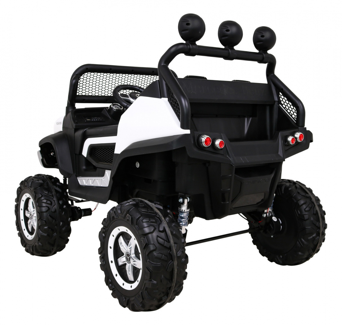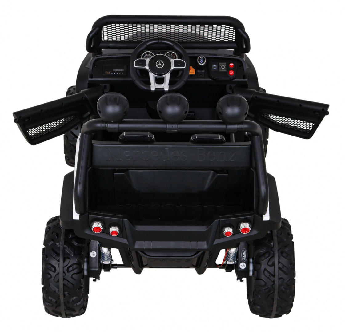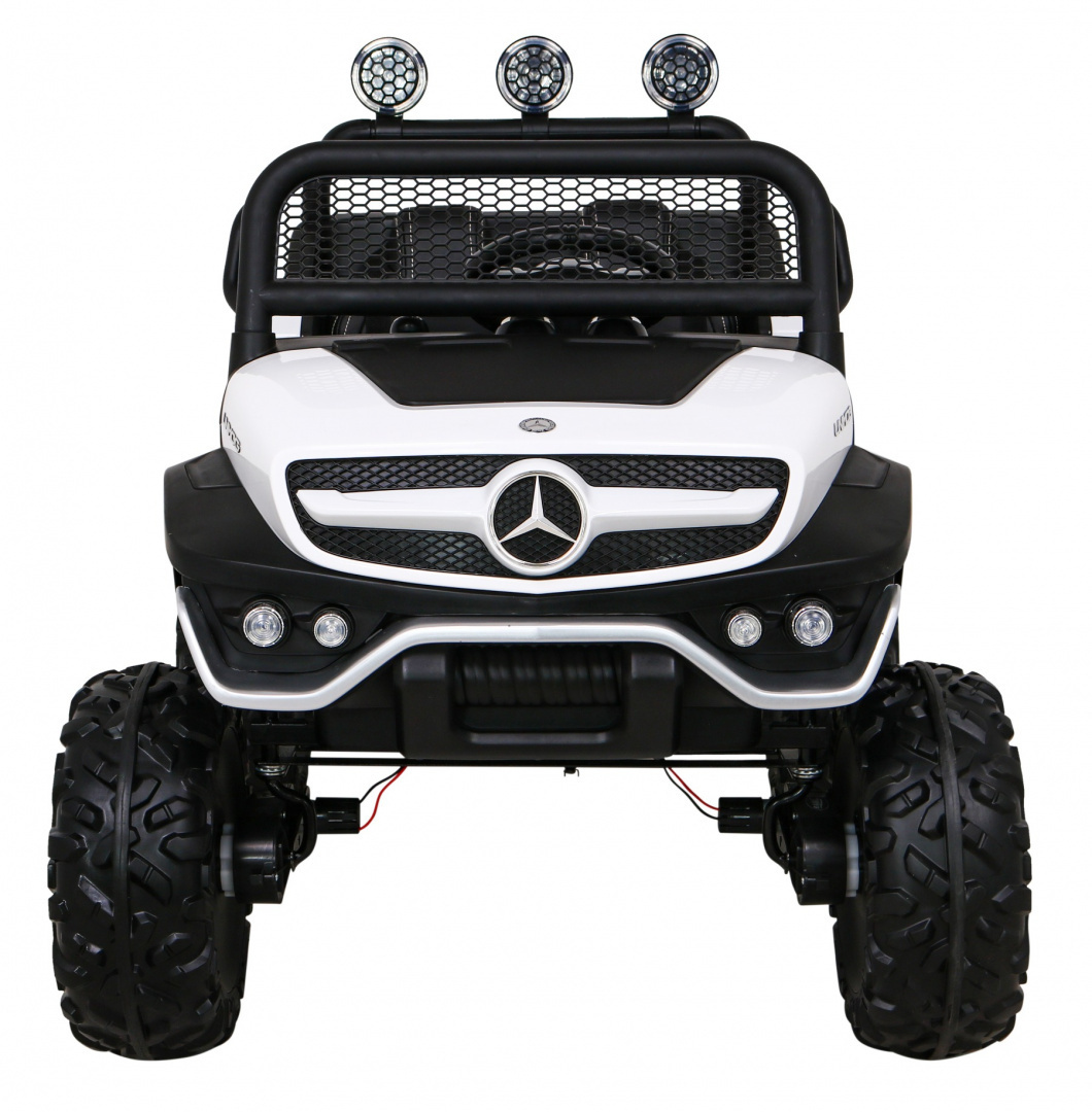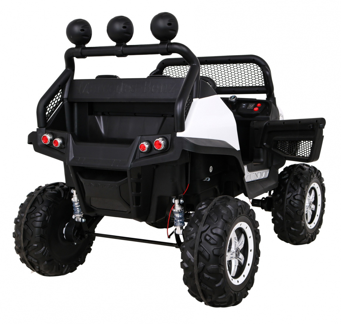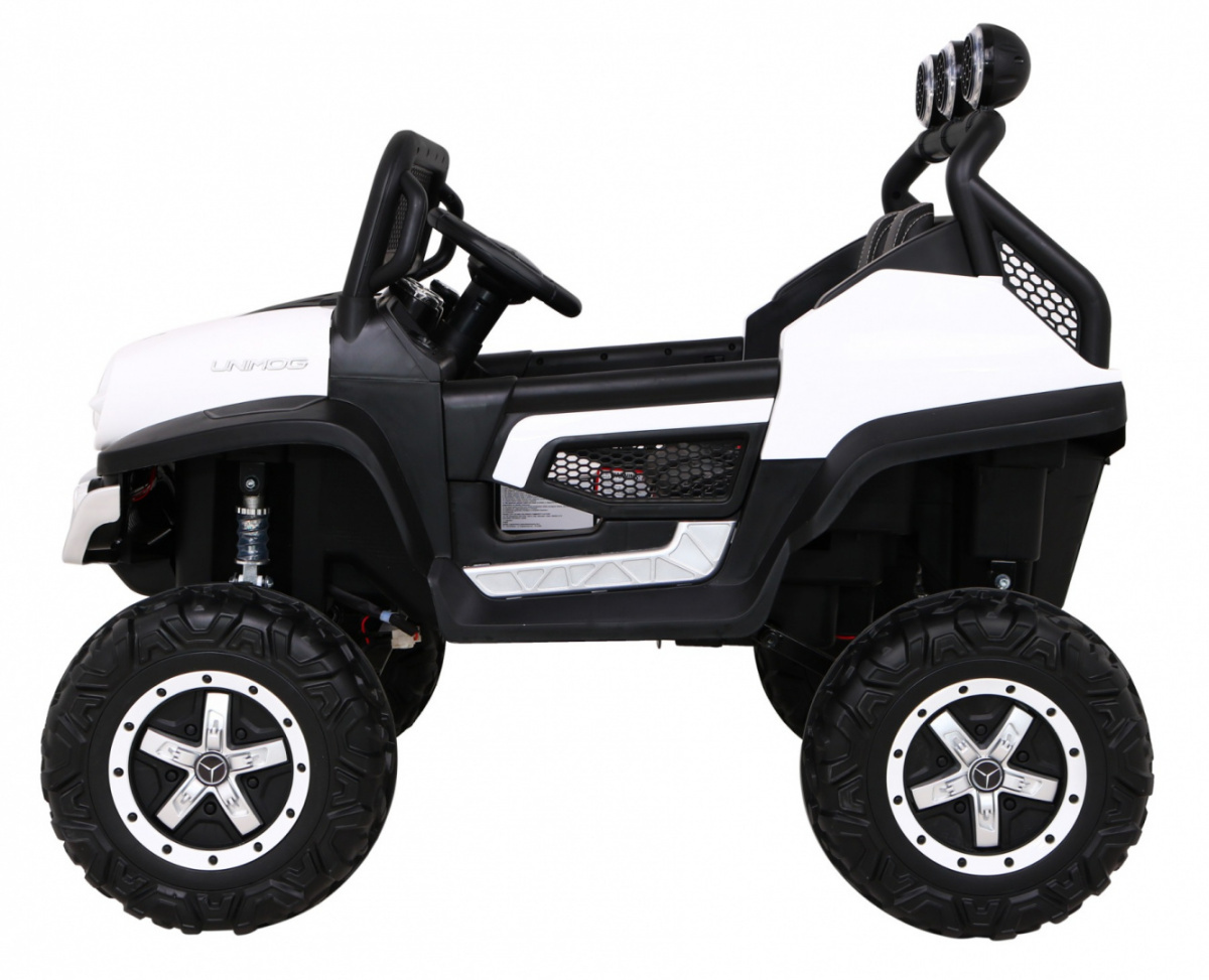 Mercedes Benz Unimog pro děti bílý + pohon 4x4 + dálkové ovládání + nosič zavazadel + pomalý start + MP3 LED