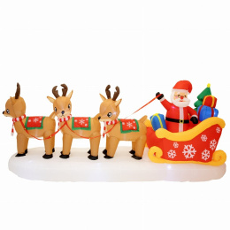 KRÁSNÁ OZDOBÁ - IDEÁLNÍ NÁPAD NA DÁREK Samonafukovací vánoční dekorace (vestavěná pumpa) LED diody osvětlující ozdobu - vestavěné uvnitř Materiál odolný vůči povětrnostním podmínkám Třída těsnosti - IP44 Délka napájecího kabelu: 2 m. Výška: 144 cm Šířka: 91 cm Hloubka: 390 cm VESTAVĚNÝ KOMPRESOR Sáně Santa Clause mají vestavěný kompresor, který je naplňuje vzduchem. Napětí: 12V, 2,5 A, 30 W Třída ochrany napájecího zdroje: II Třída ochrany ozdoby: III Dekorace je vybavena napájecím zdrojem, který má stupeň krytí IP44. Napájení: 12VDC 1.2A, 220-240 V Materiál: Polyester, plast