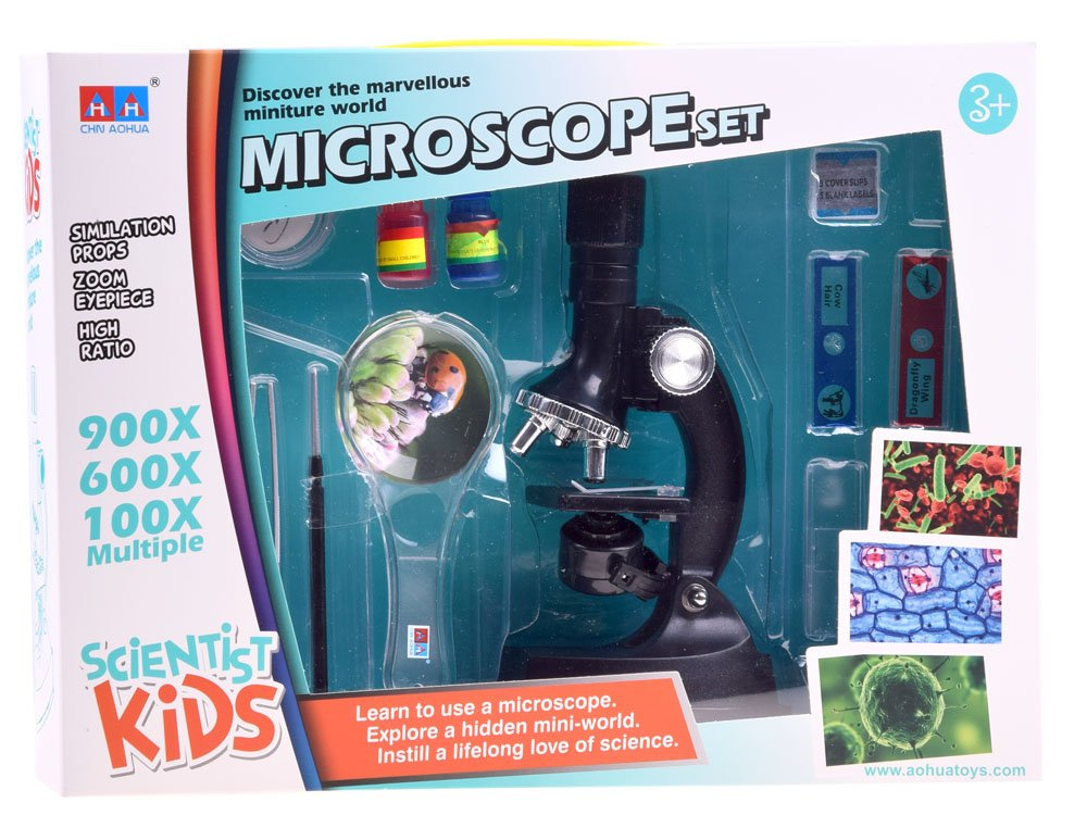 Objektivy umožňují zvětšení 100x/600x/900x, Mikroskop funguje na 2 baterie AA (nejsou součástí dodávky). Sada je vyrobena velmi pečlivě a přesně. Mikroskop z plastu. Mikroskop má zabudovanou žárovku, která osvětluje prohlížené vzorky. Dokonalá sada pro malé vědce. S tímto mikroskopem zažije vaše dítě nezapomenutelné hodiny plné nových objevů mikrosvěta. Prostřednictvím hry můžete rozvíjet zvídavost dítěte. Objevte jeho vášně.