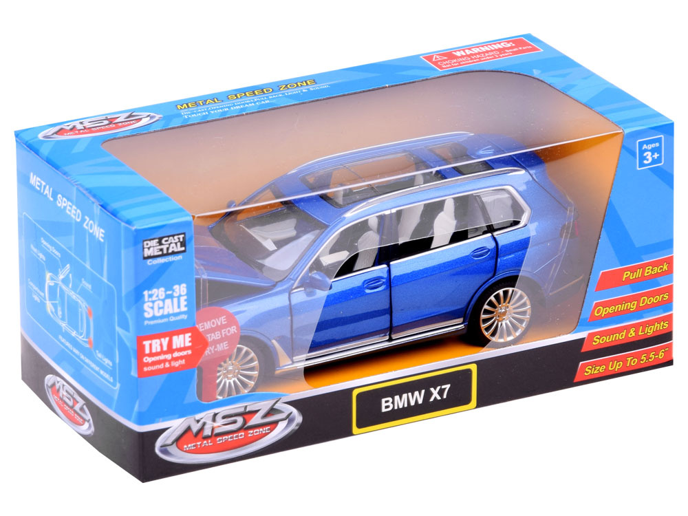 SUV BMW X7 1:32 auto určené pro jízdu ve městě. Vůz byl velmi pečlivě a esteticky zpracován s důrazem na nejmenší detaily, což jistě potěší každého malého řidiče. Auto má zvukové a světelné efekty, otevírací dveře, kufr a kapotu. Autíčko jezdí pohybem hračky dozadu po hladkém povrchu pomocí mechanismu Friction power nebo zrychluje pohybem hračky po hladkém povrchu.