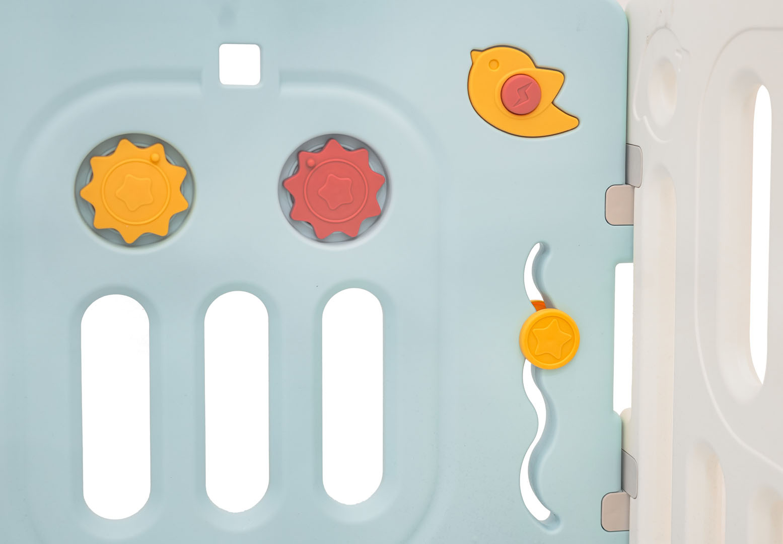 - manipulační prvky uvnitř ohrádky: posuvná kolečka, ozubená kola, pískátko v ptáčkovi a volantu, otočný volant.