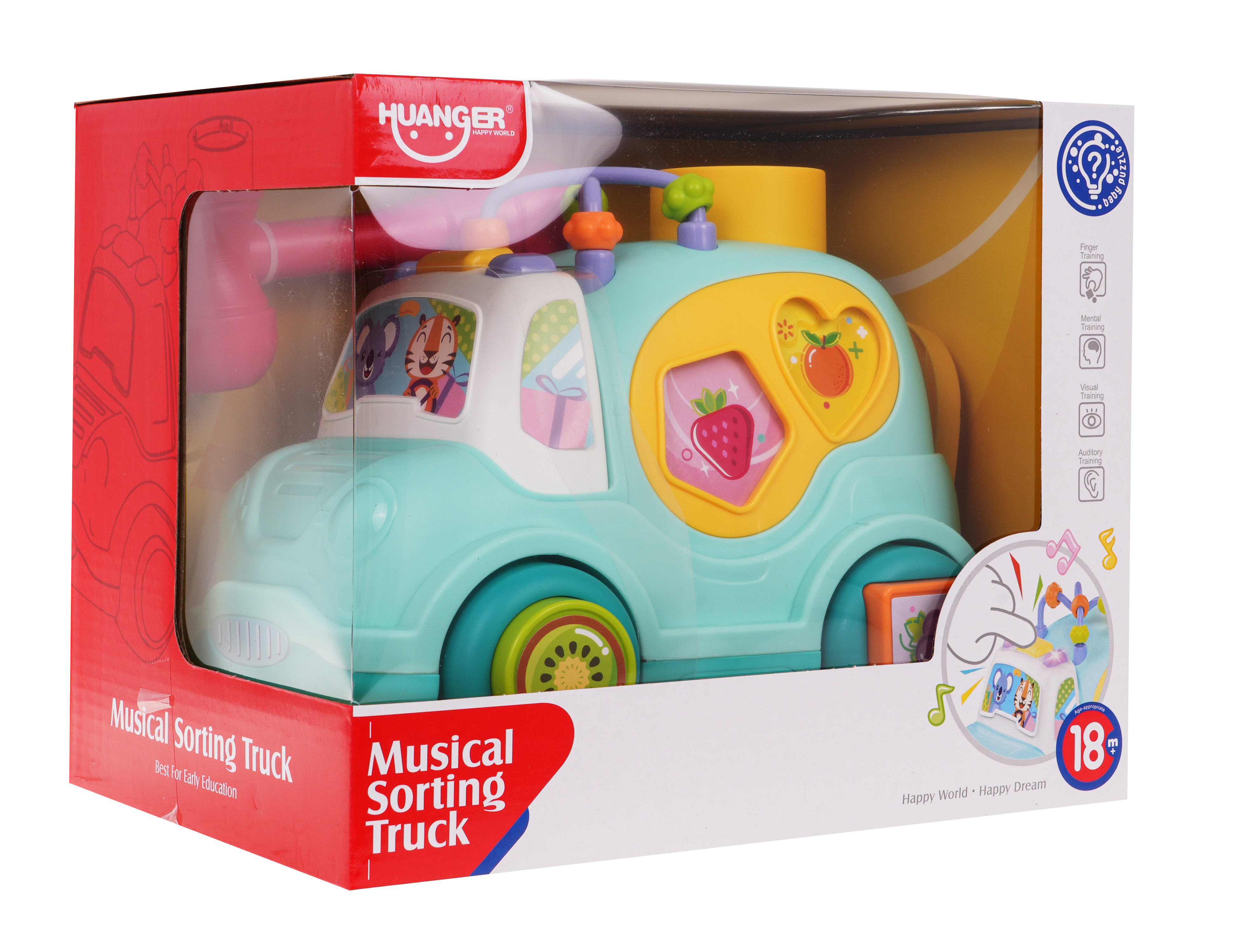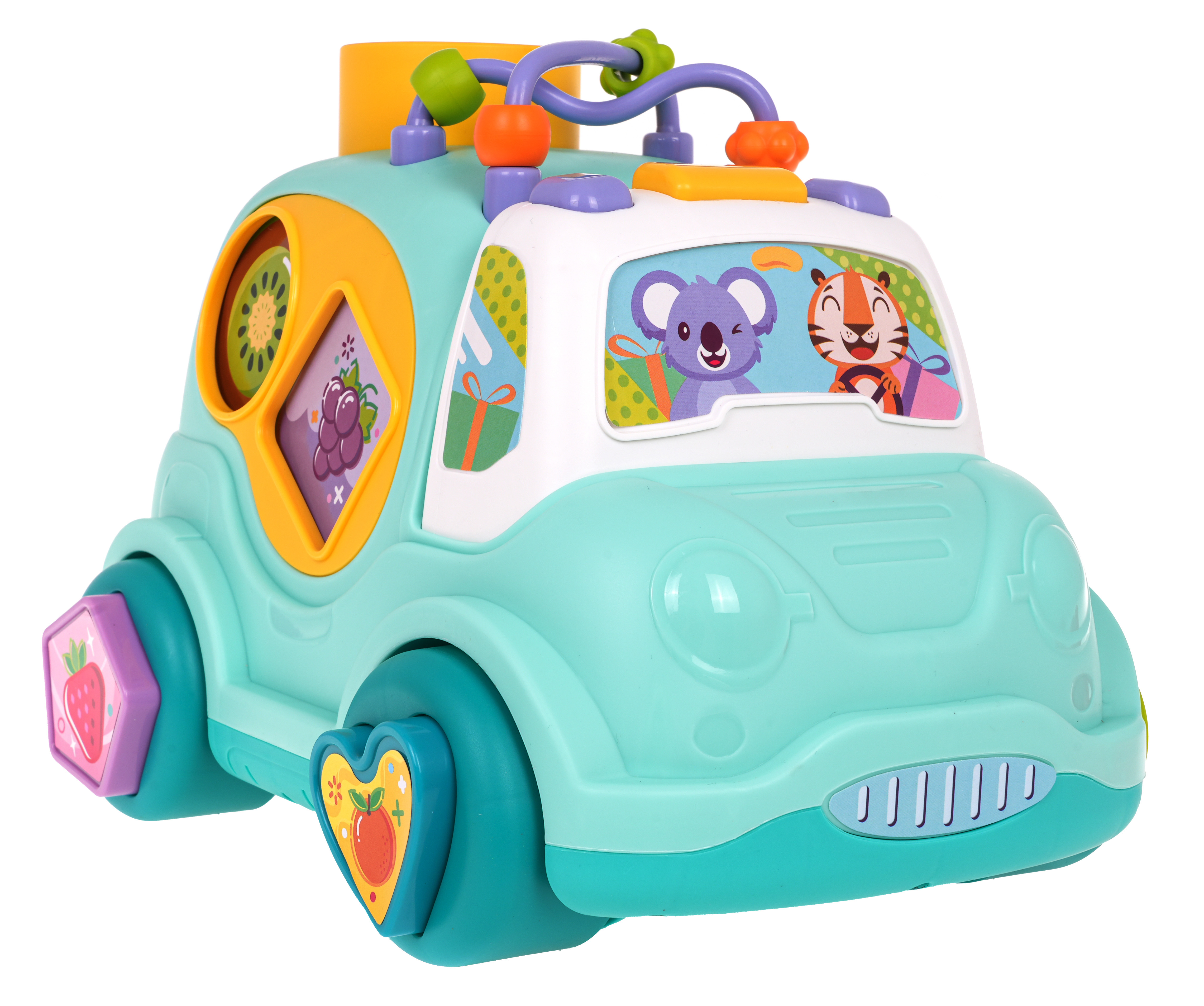 Interaktivní autobus s třídičem, zvukovými efekty a světlem pro děti od 18 měsíců. Autobus má třídič tvarů po stranách a na kolech. V sadě jsou 4 kostky k přiřazení. Na střeše je umístěn otvor pro zatloukání míčků kladivem do vnitřku vozidla (kladivo a míčky jsou součástí sady). Míčky mají uvnitř chrastítka. U vchodu se také nachází překládanka s korálky. Míčky ze středu vozidla můžeme vyjmout otevřením zadních dveří vozidla. Na horní části čelního skla se nachází tlačítko, které spouští zvukové efekty, jako jsou zvuky startování vozidla, klaksonu nebo veselé melodie. Efektům zvuku doprovázejí blikající světélka. Hračka je napájena bateriemi typu 2 x AA 1,5 V (nejsou součástí balení).
