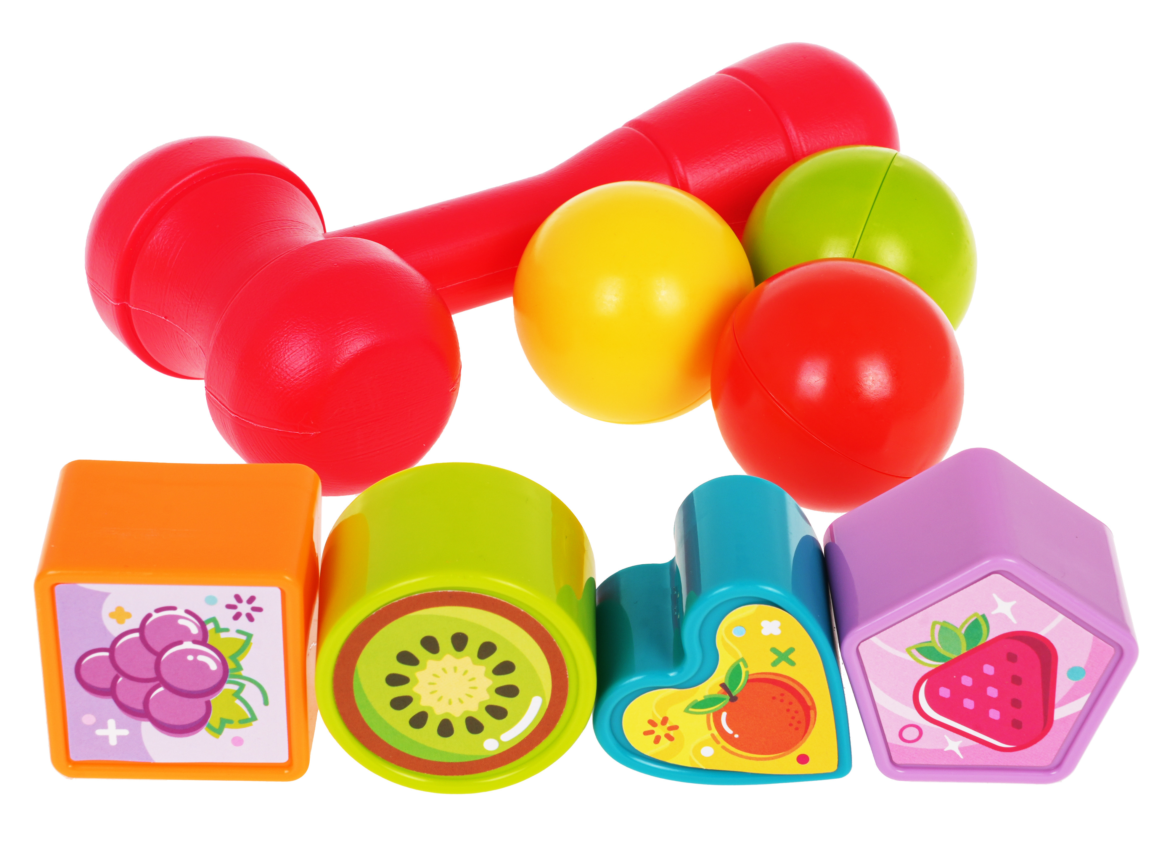 - míčky s chrastítky, kladívko a kostky v sadě,