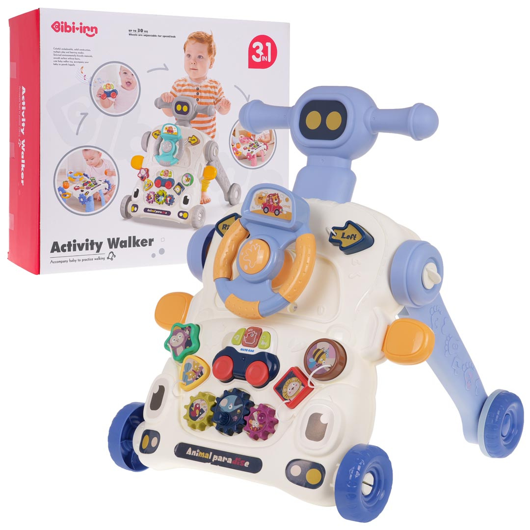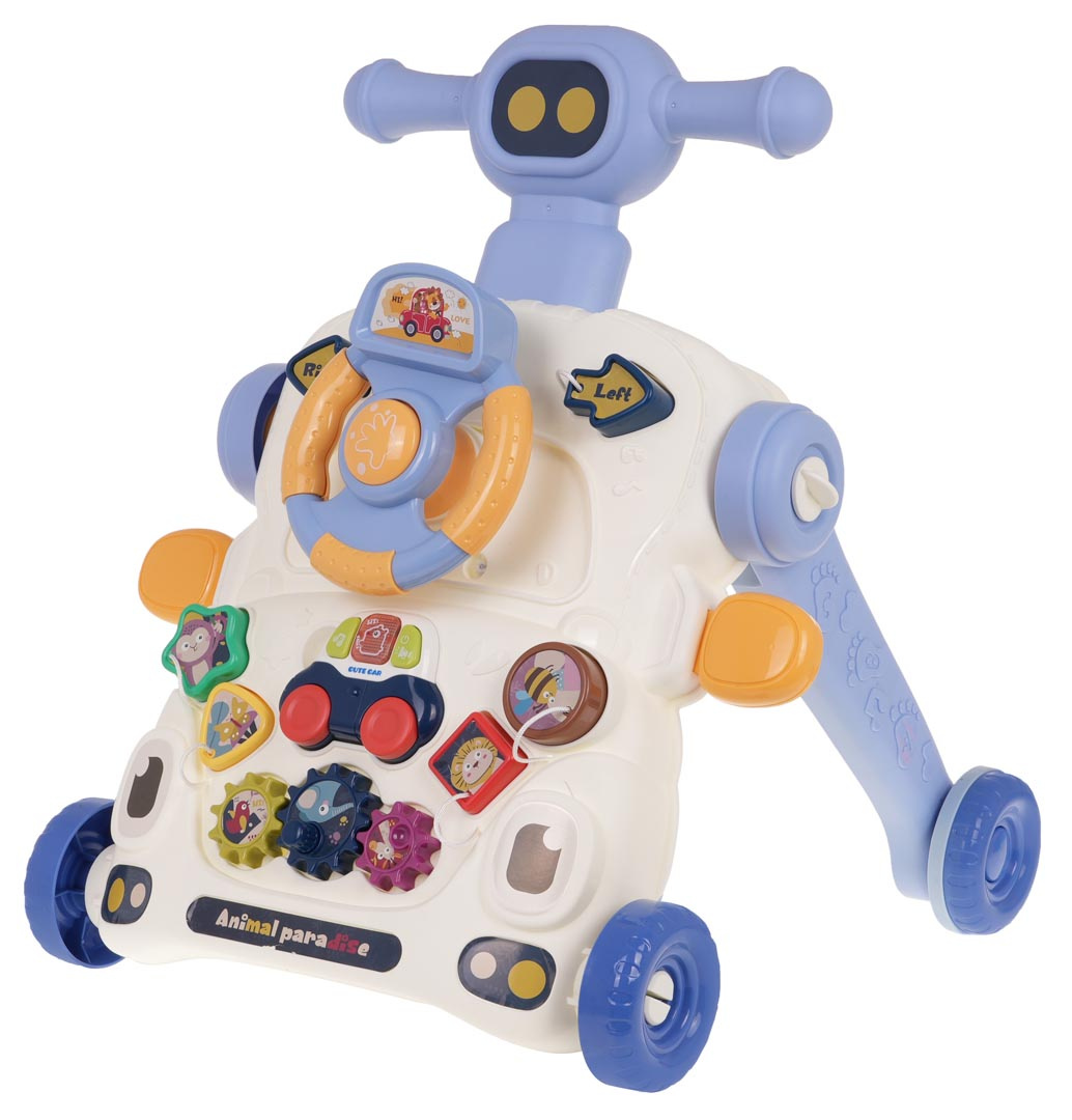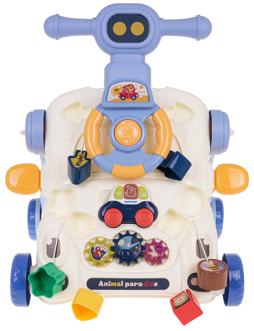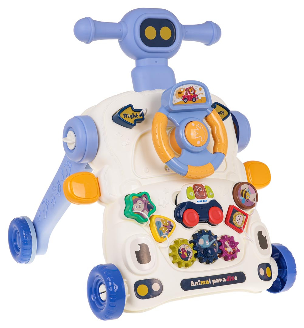 Vzdělávací chodítko, interaktivní stolek 2 v 1 pro děti od 12 měsíců. Barevná, multifunkční hračka stimuluje rozvoj dítěte v různých oblastech. Pchací stolek lze rychle přeměnit na multifunkční stolek. Odnímatelný, barevný panel má mnoho pohyblivých prvků, které lze otáčet, posouvat, stlačovat. Dále může dítě z panelu také vyjmout malé interaktivní autíčko a vzít si ho všude s sebou. Autíčko má zvukové a světelné efekty a je napájeno bateriemi typu 2 x AAA 1,5 V (nejsou součástí balení).
