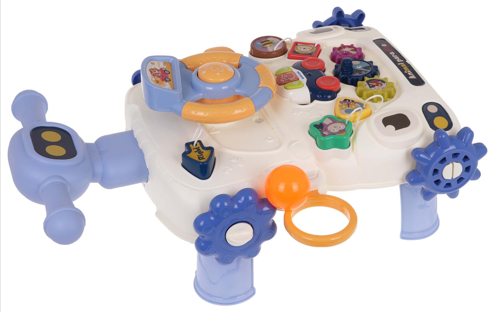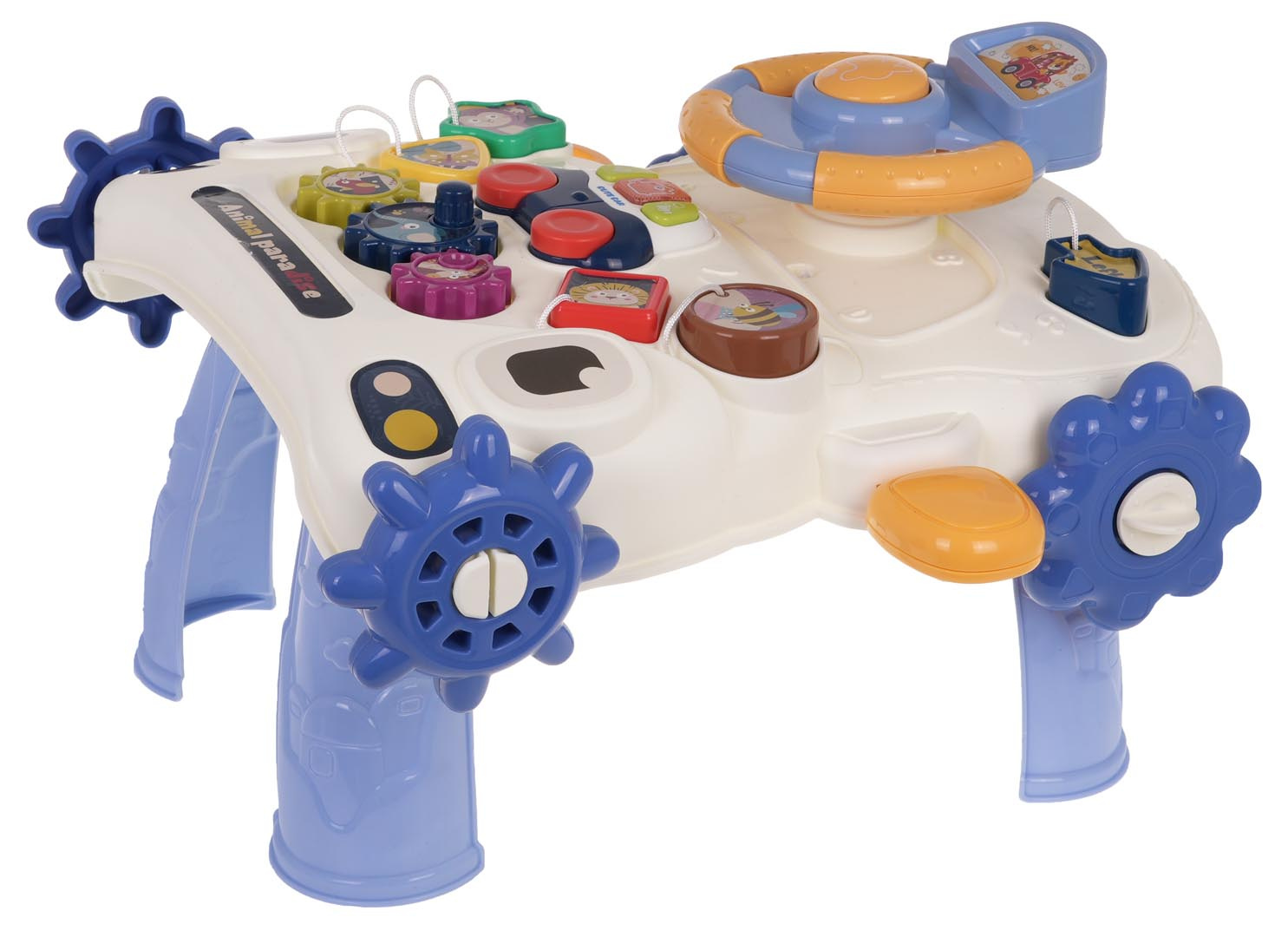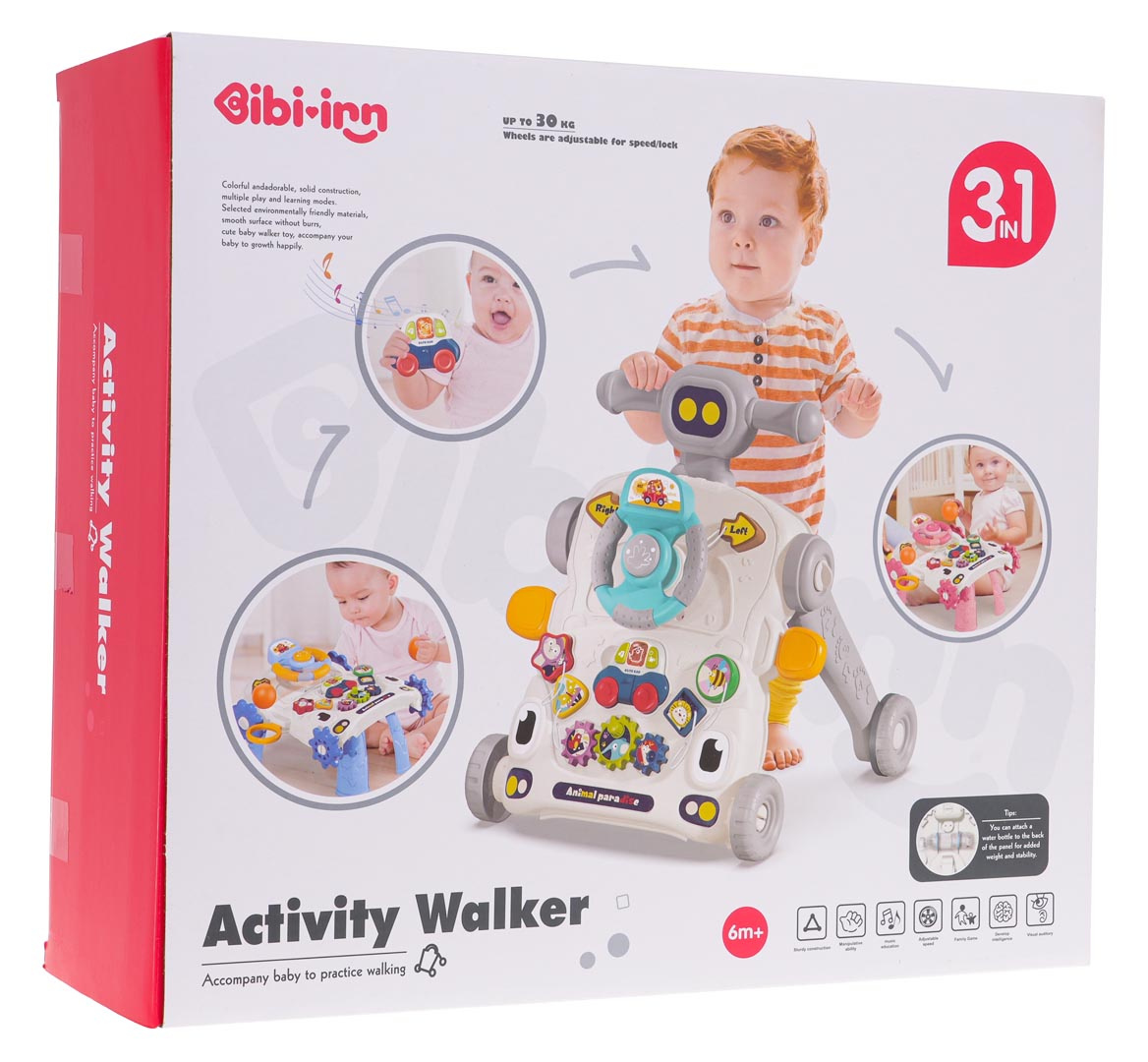 Vzdělávací chodítko, interaktivní stolek 2 v 1 pro děti od 12 měsíců. Barevná, multifunkční hračka stimuluje rozvoj dítěte v různých oblastech. Pchací stolek lze rychle přeměnit na multifunkční stolek. Odnímatelný, barevný panel má mnoho pohyblivých prvků, které lze otáčet, posouvat, stlačovat. Dále může dítě z panelu také vyjmout malé interaktivní autíčko a vzít si ho všude s sebou. Autíčko má zvukové a světelné efekty a je napájeno bateriemi typu 2 x AAA 1,5 V (nejsou součástí balení).