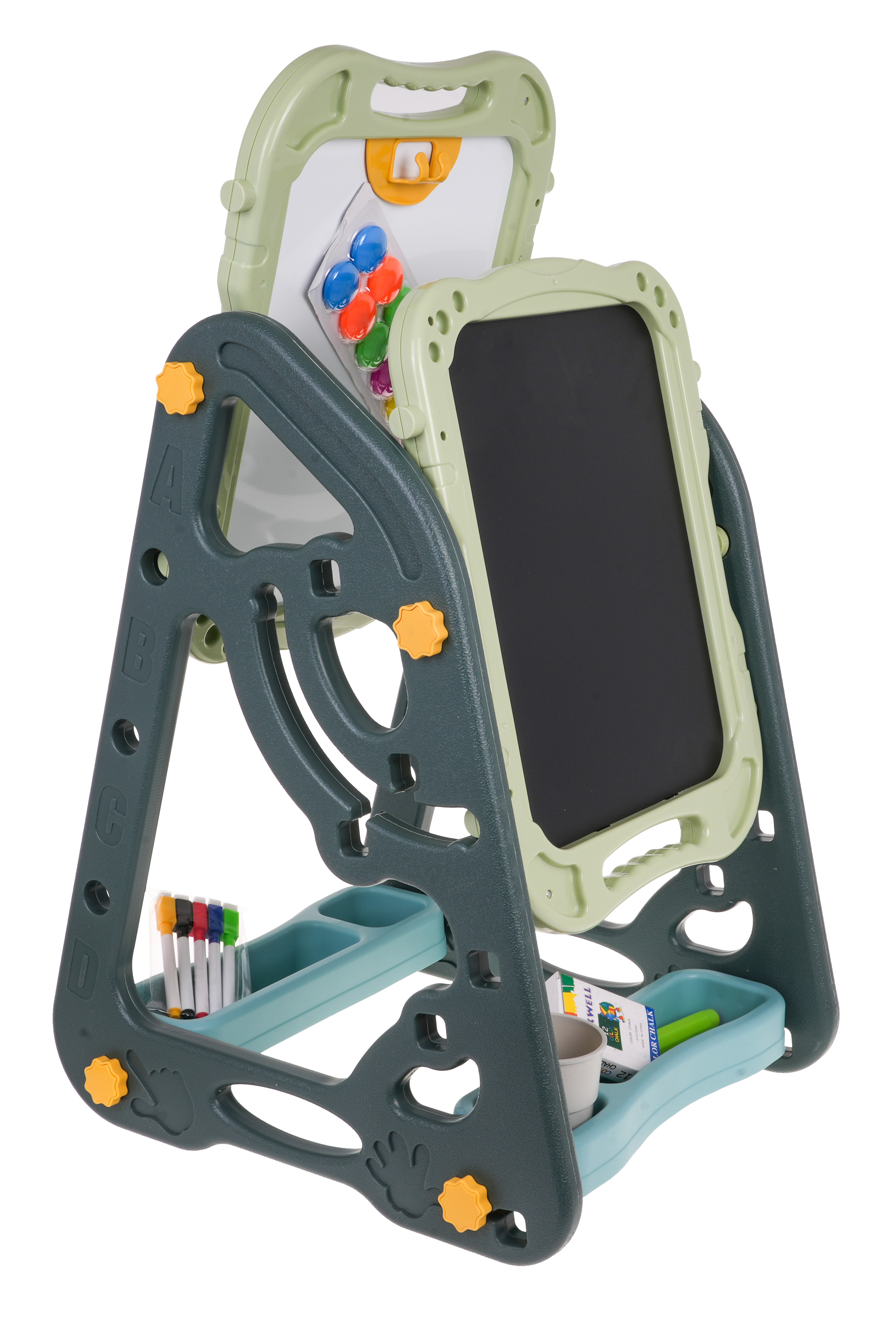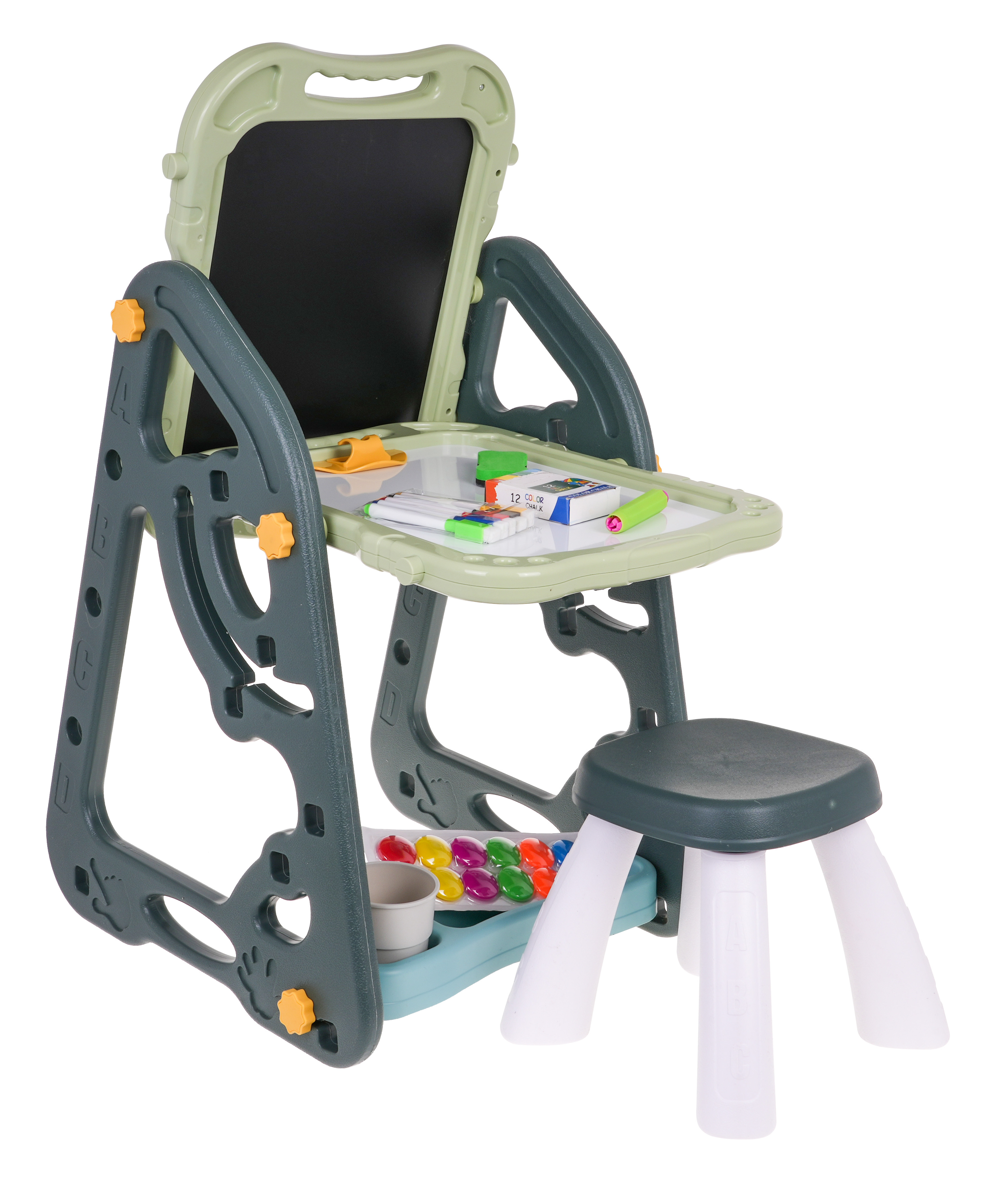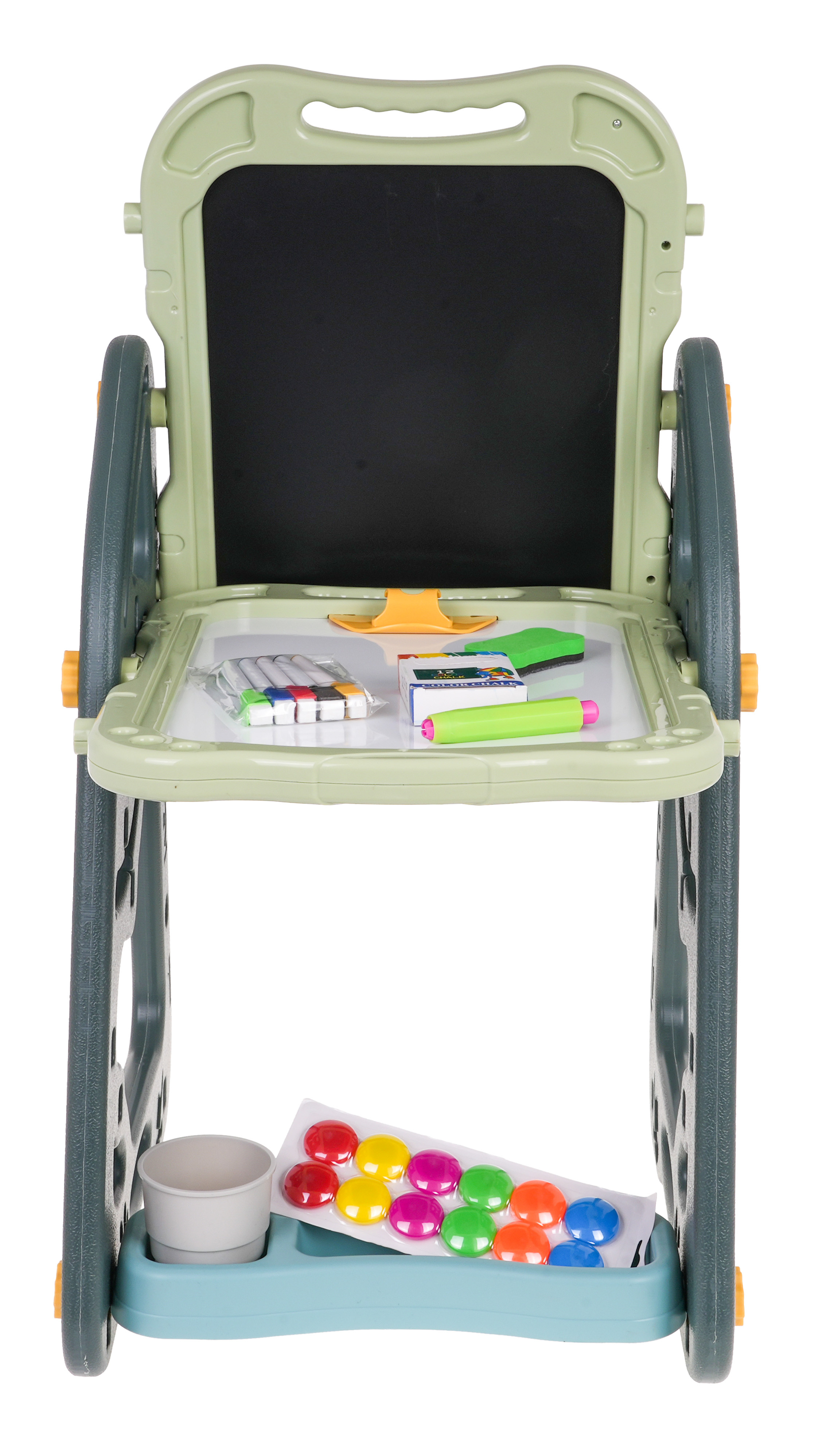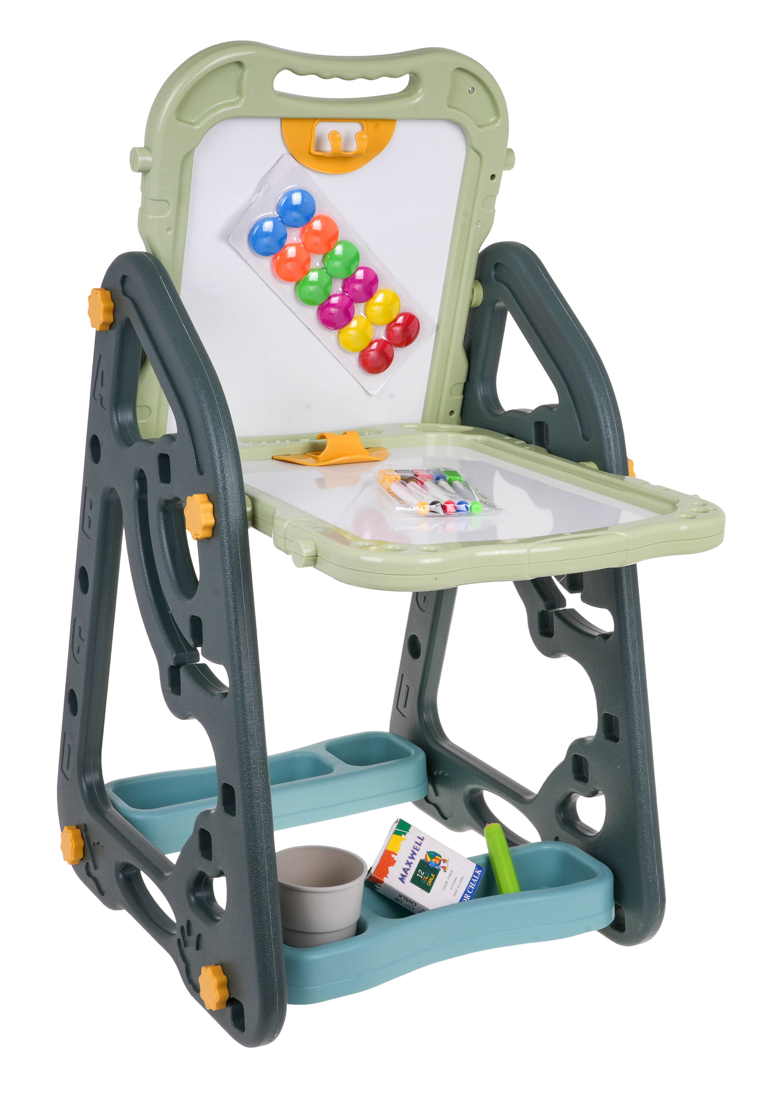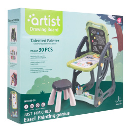 Velká multifunkční sada skládající se ze dvou tabulí: křídové a magnetické, a židle je určena pro děti od 3 let. Stojan na tabule lze nastavit ve dvou variantách. V první variantě budeme mít na jedné straně magnetickou tabuli a na druhé křídovou tabuli. Můžeme také nastavit výšku desek. Ve druhé variantě budeme mít stůl, na jehož horní a přilehlé stěně budou dvě desky. Na bílou stranu lze psát fixami nebo na ni lze připevnit barevné magnety. Černou stranu lze namalovat křídou a lze na ni také připevnit barevné magnety.