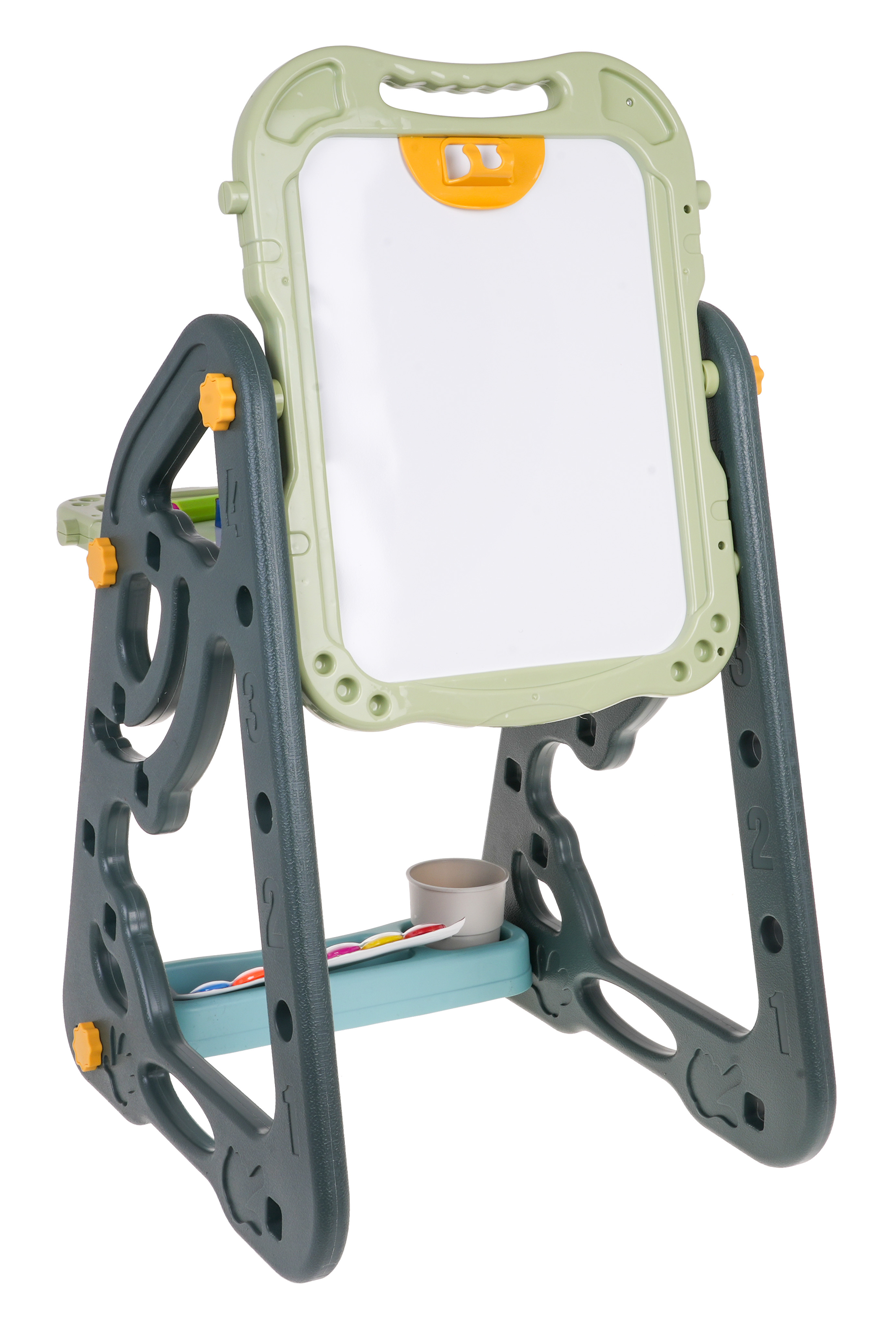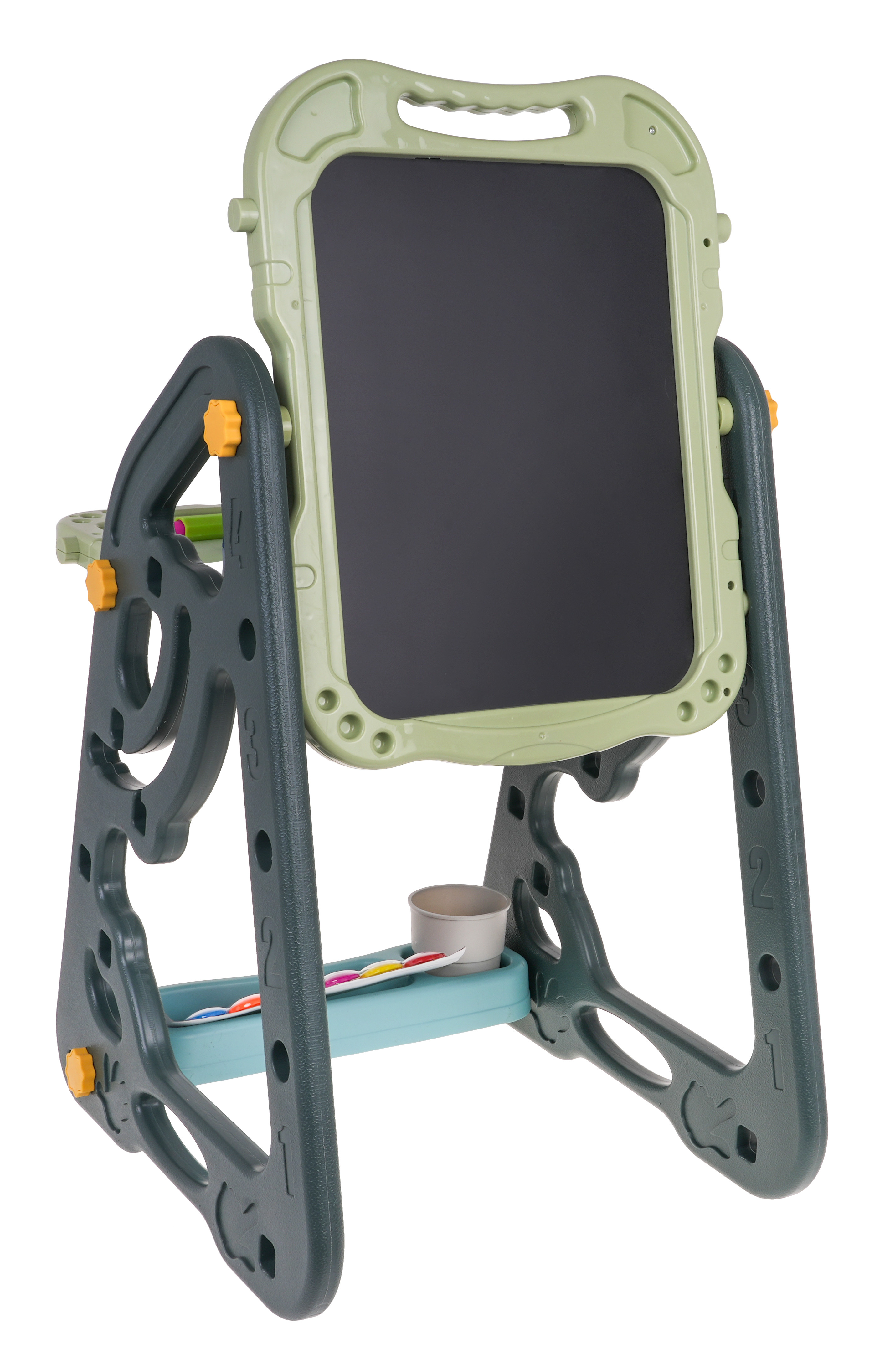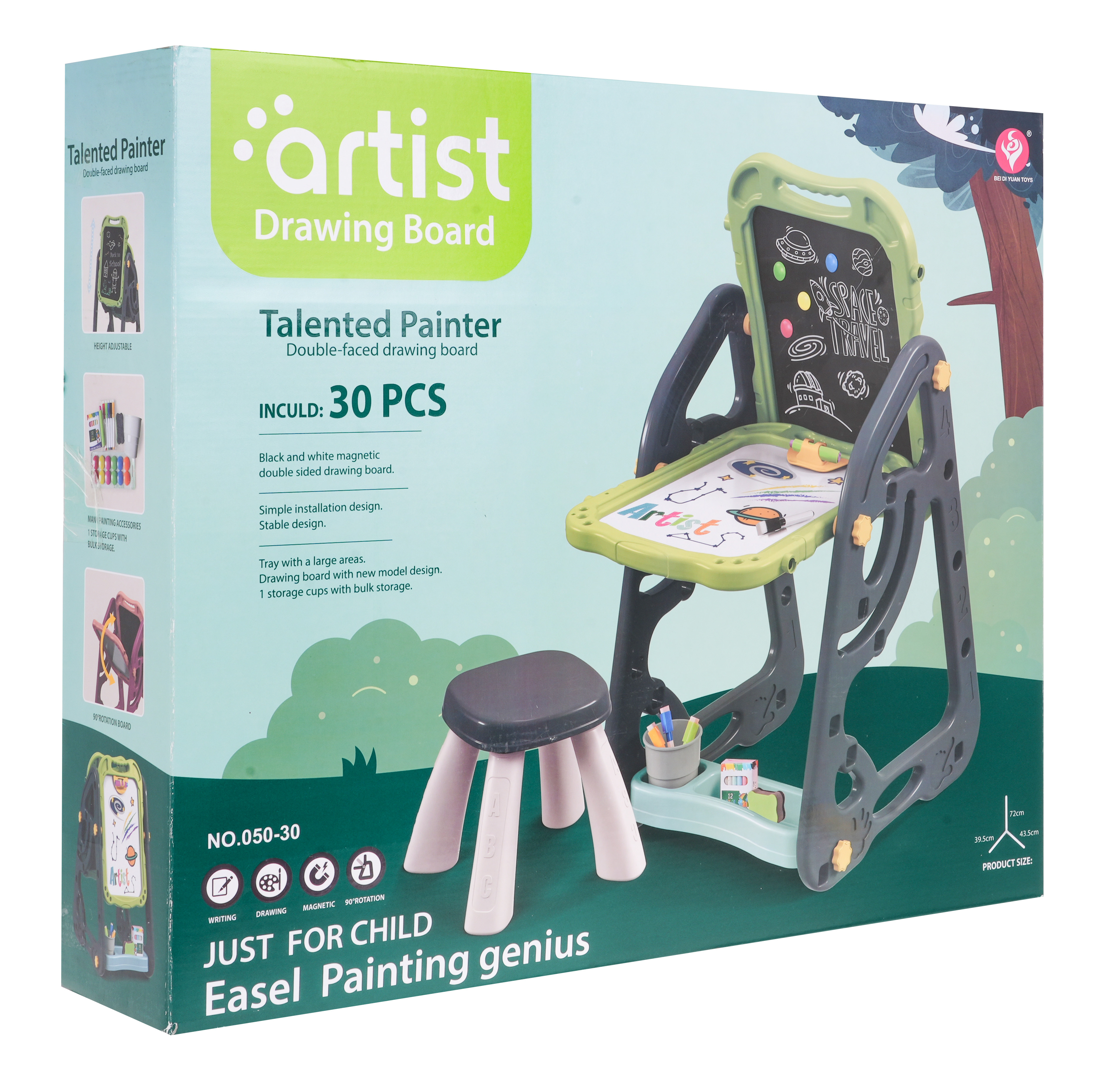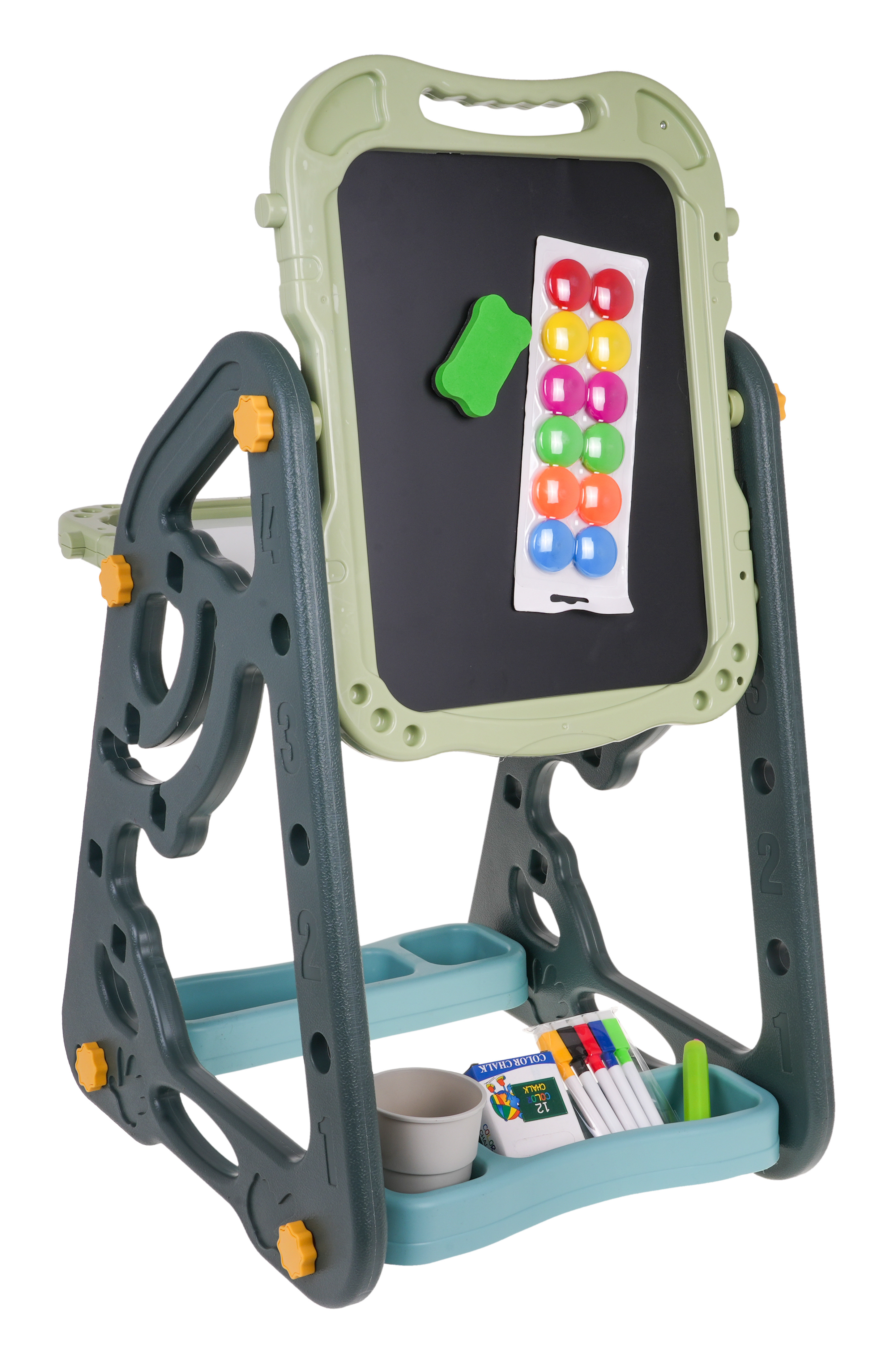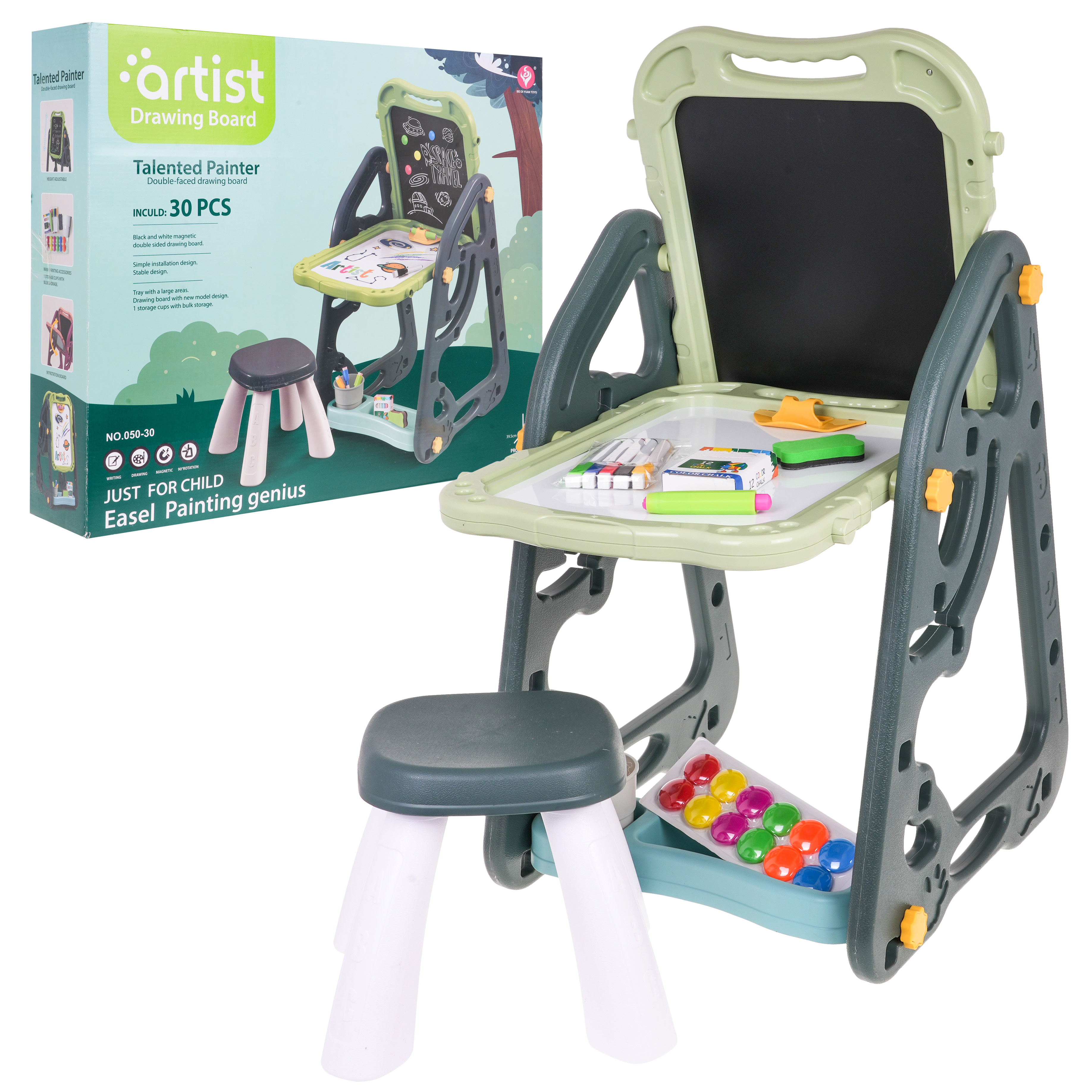 Velká multifunkční sada skládající se ze dvou tabulí: křídové a magnetické, a židle je určena pro děti od 3 let. Stojan na tabule lze nastavit ve dvou variantách. V první variantě budeme mít na jedné straně magnetickou tabuli a na druhé křídovou tabuli. Můžeme také nastavit výšku desek. Ve druhé variantě budeme mít stůl, na jehož horní a přilehlé stěně budou dvě desky. Na bílou stranu lze psát fixami nebo na ni lze připevnit barevné magnety. Černou stranu lze namalovat křídou a lze na ni také připevnit barevné magnety.