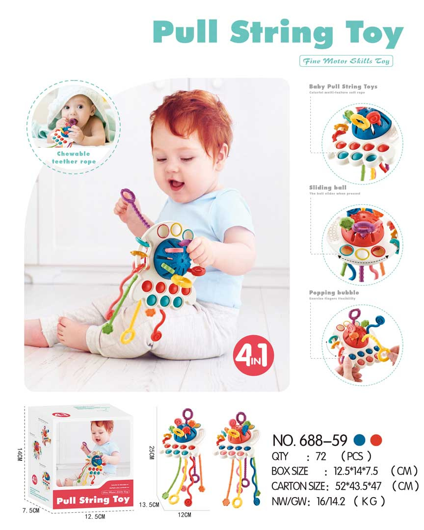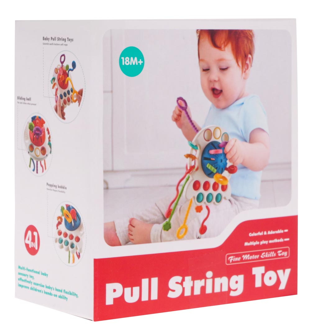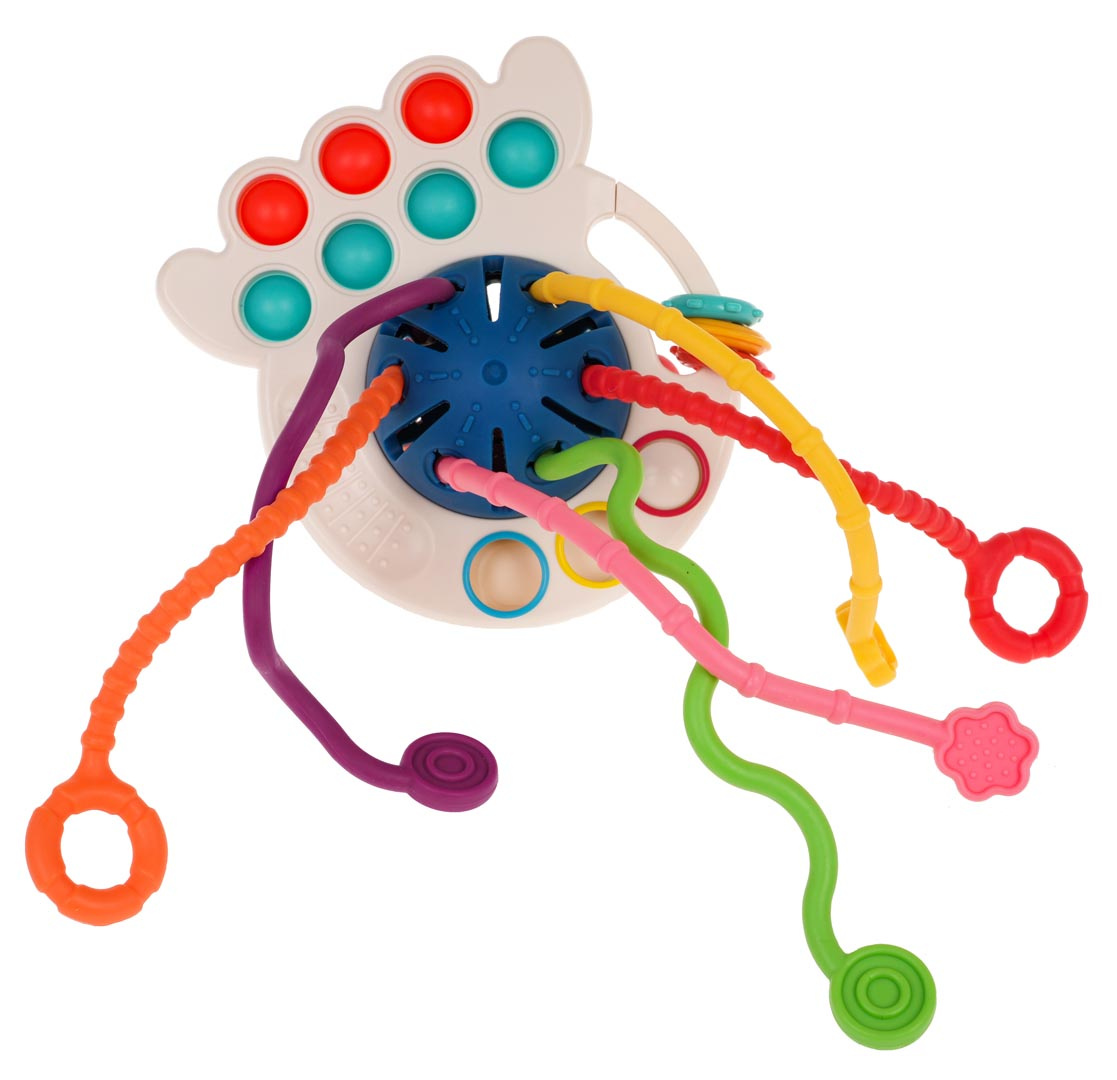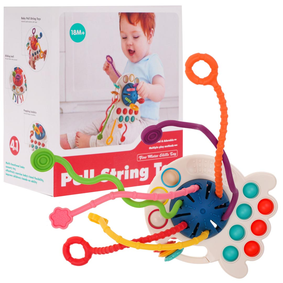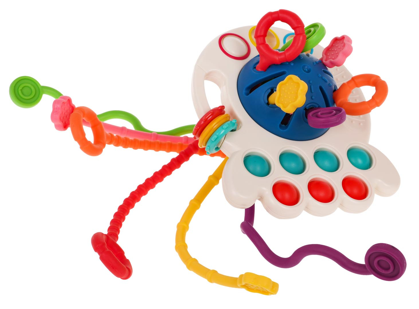 Senzorická hračka 4v1, chobotnice pro děti od 18 měsíců. Hračka byla vyrobena z bezpečných materiálů pro miminko a nemá ostré hrany. Živé barvy povzbuzují dítě ke hře. Hračka může sloužit jako kousátko, miminko může tahat, mačkat, posouvat různé prvky a cvičit koordinaci ruka – oko. Hračku můžeme připevnit k postýlce, kočárku nebo sedadlu během cesty autem.