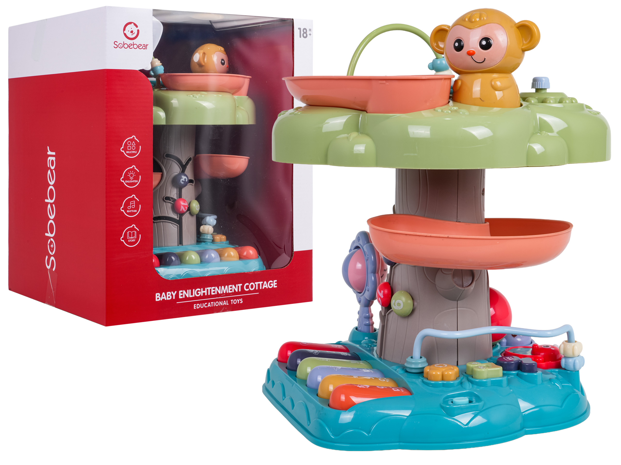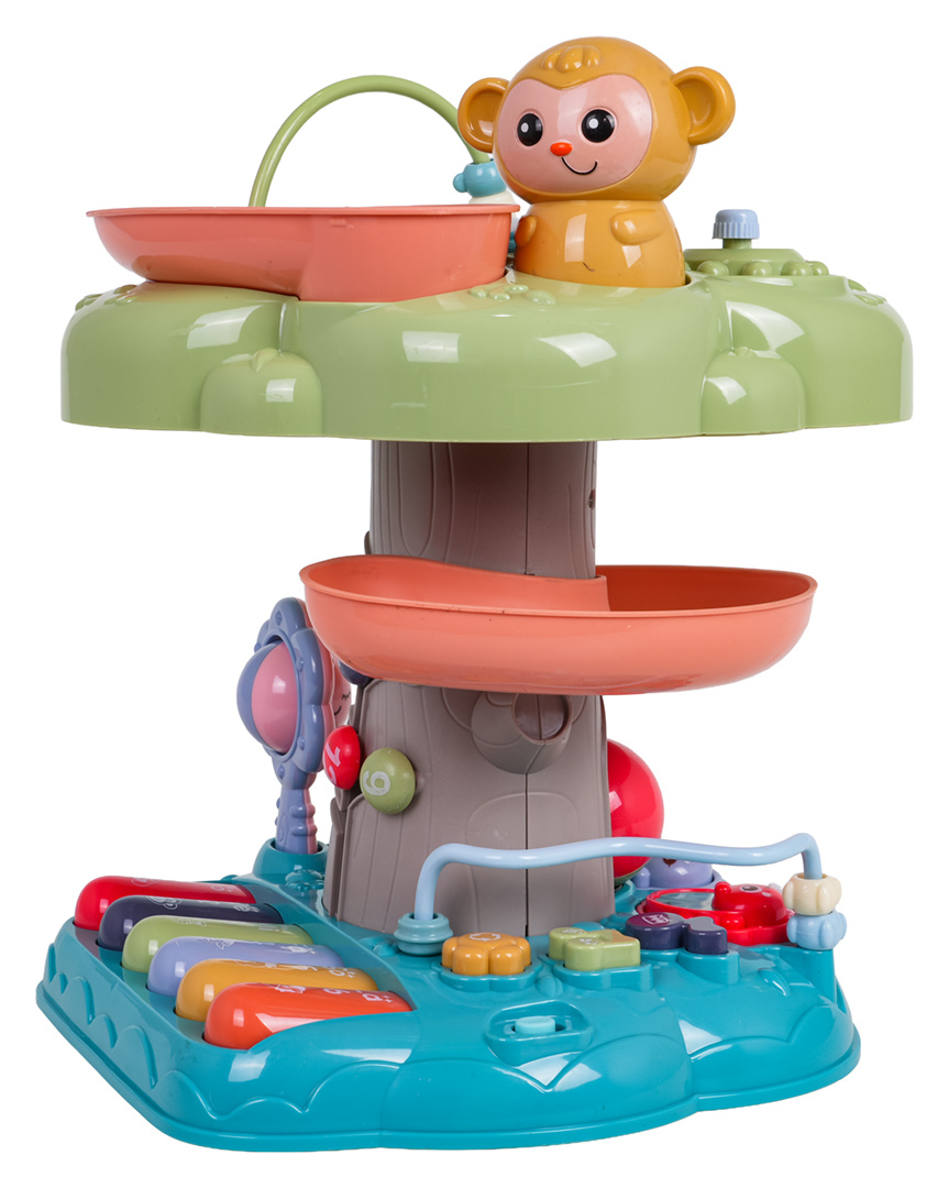 Interaktivní, multifunkční stromeček s funkcí zvuku a světla a manipulačními prvky pro děti od osmnácti měsíců. Sada je vyrobena z nejkvalitnějšího plastu a nemá ostré hrany. Živé barvy, zvukové a světelné prvky stimulují smysly dítěte na mnoha úrovních. Na vrcholu stromečku se nachází hudební bubínek s podsvícením, korálková překládanka, opička, včelka a skluzavka pro míčky. Vhozený míček se kutálí skluzavkou až dolů. Na pařezu stromu a vedle něj se nacházejí skládačky. Na samém spodku máme barevné hudební piánko, tlačítko pro změnu režimů piánka, tlačítko s bubnem, chrastítko a zvířátka na šňůrce k přizpůsobení. Hračka je napájena bateriemi typu 3 x AA 1,5V (nejsou součástí balení).