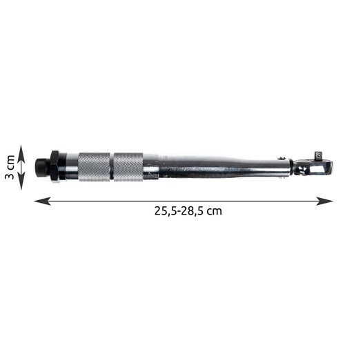 Momentový klíč 1/4", kroutící moment 5-25Nm, materiál chrom-vanadová ocel, nastavení kroutícího momentu pomocí otočné rukojeti, přepínací páčka.