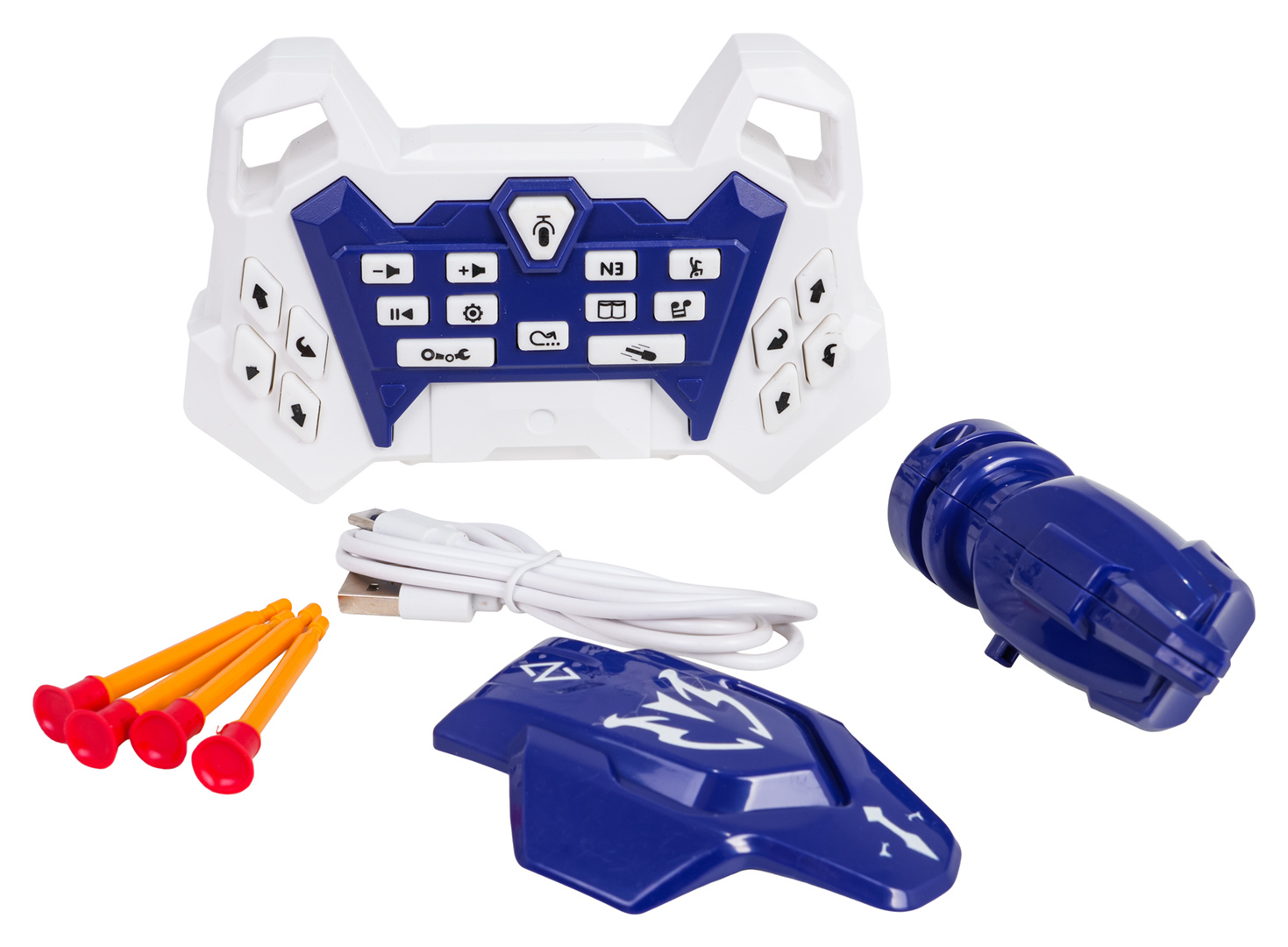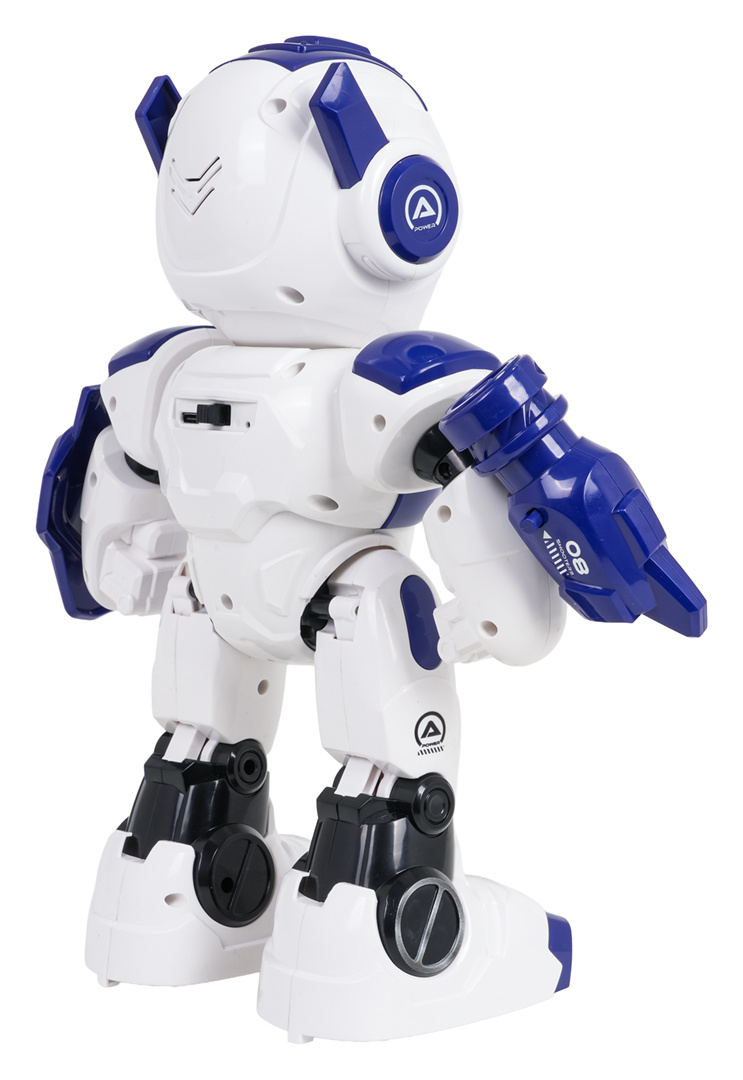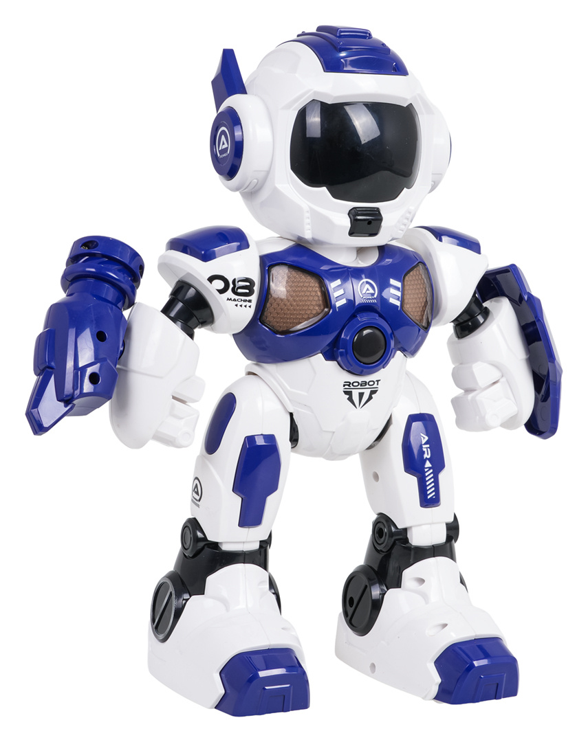 Interaktivní, multifunkční robot A08 s funkcí střílení pro děti od osmi let. Robot je vyroben z nejkvalitnějšího plastu, má podsvícené oči a tlačítko na břiše, pohybuje se dopředu a dozadu a otáčí se doprava a doleva, pohybuje rukama, tančí, přehrává melodie a příběhy. V sadě máme další nástavce na ramena robota: s štítem a vystřelovačem šipek zakončených přísavkami. Střílíme ručně (po stisknutí tlačítka). Robot je napájen akumulátorem typu 3,7V (v sadě), ovladač bateriemi typu 2 x AA 1,5V (nejsou v sadě).