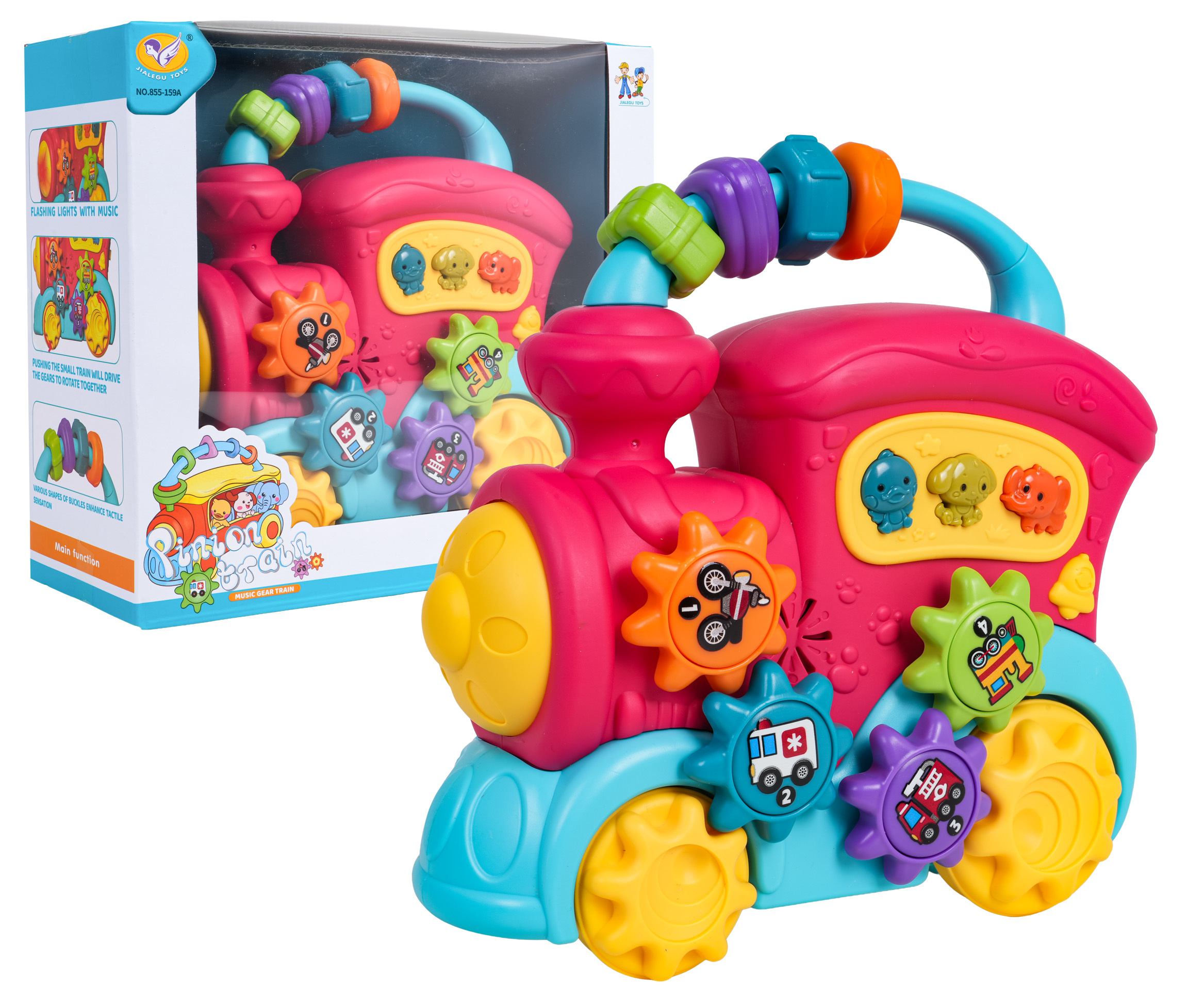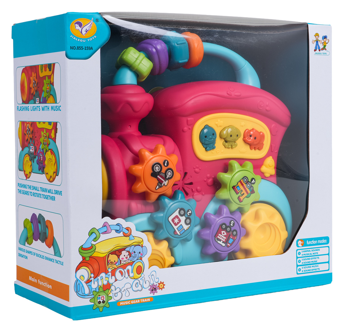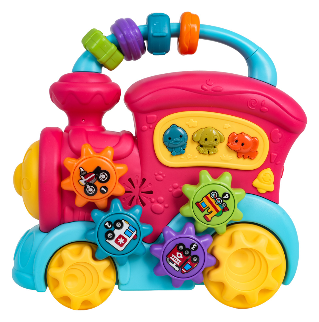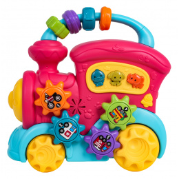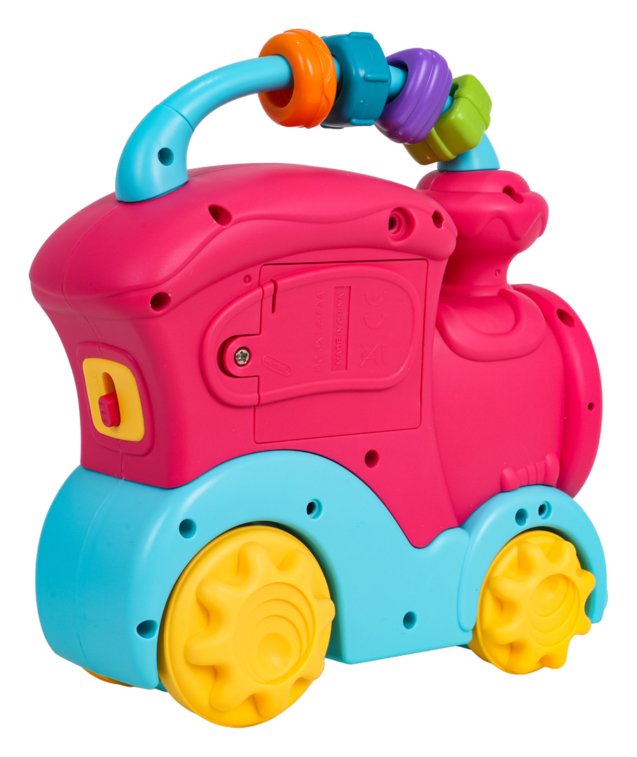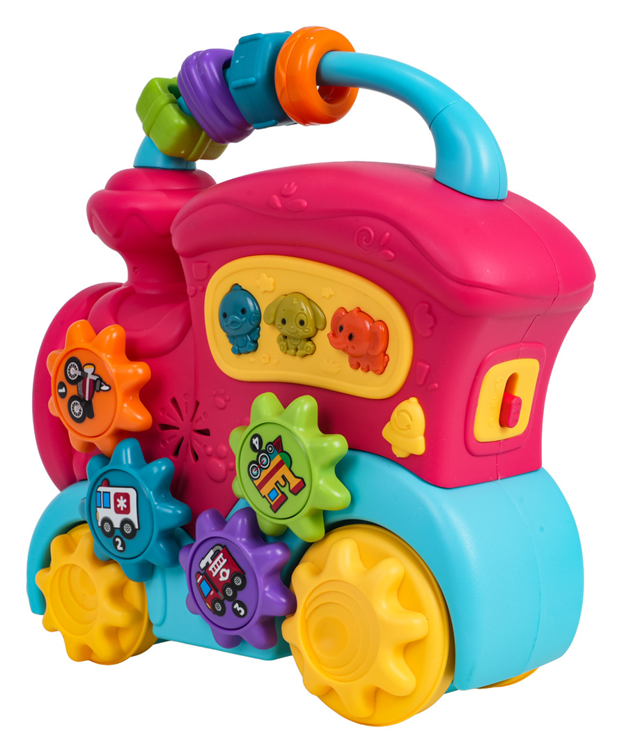 Interaktivní hračka, vlak s funkcí zvuku a světla pro děti od dvanáctého měsíce života. Hračka je vyrobena z nejkvalitnějšího plastu v živých barvách. Je bezpečná pro miminko, nemá ostré hrany. Hračka nabízí mnoho atrakcí a stimuluje dítě na různých úrovních. Na zadní straně vlaku se nachází dvoustupňová regulace hlasitosti, na střeše je posuvná hračka se smyslovými korálky, na boční straně vlaku jsou ozubená kolečka s obrázky vozidel a tlačítka se zvířátky. Při posouvání vlaku po podlaze se spustí mechanismus ozubených kol umístěných na hračce, která se otáčejí a vydávají chrastivý zvuk. Po stisknutí ozubeného kola uslyšíme zvuk noty. Tlačítka se zvířátky spouštějí zvuky kachny, psa nebo slona, a také různé zvonky či melodie, v závislosti na nastaveném režimu (tlačítko se zvonečkem). Hračka vláček má podsvícený reflektor a je napájena bateriemi typu 3 x AA 1,5V (baterie nejsou součástí balení).