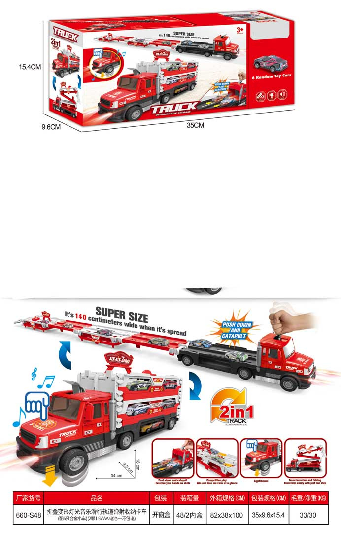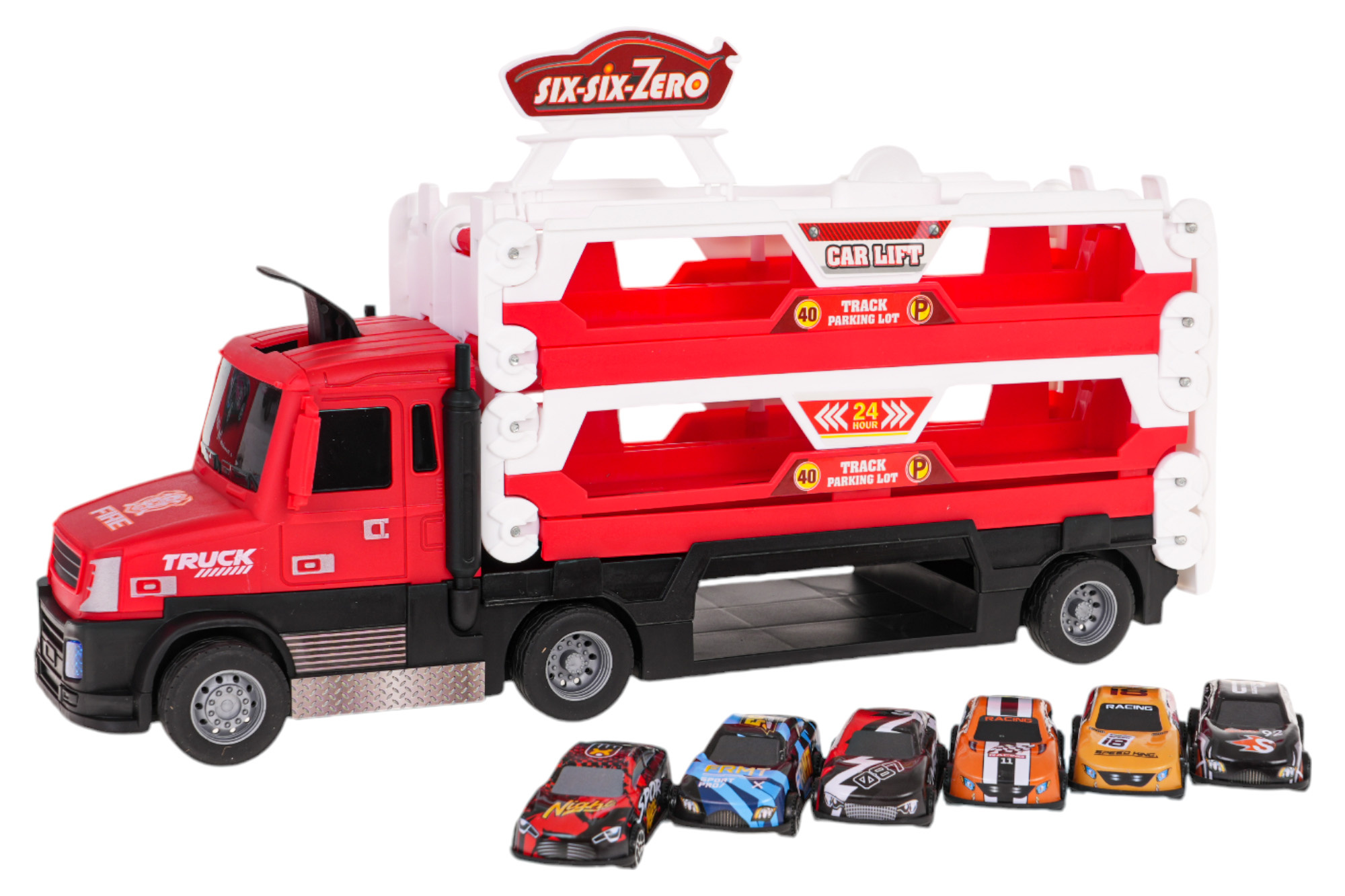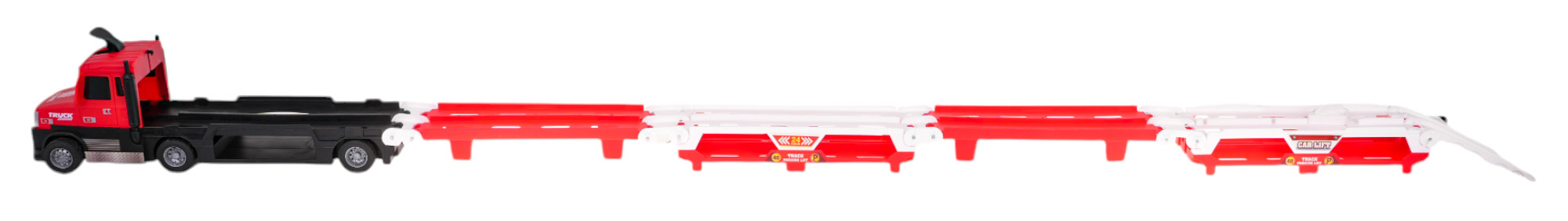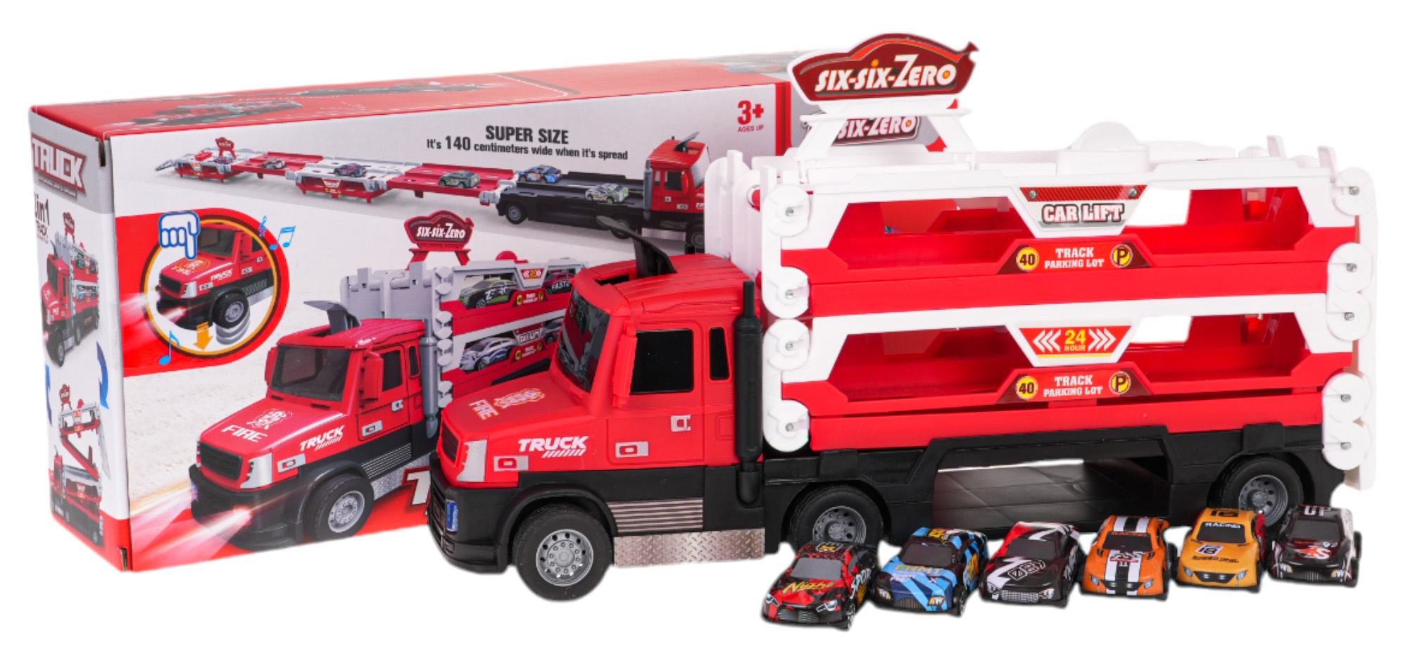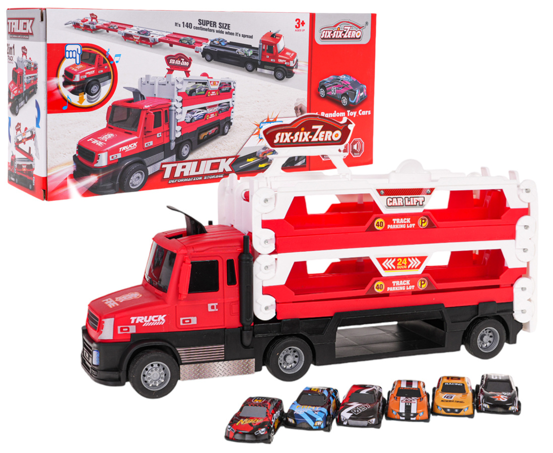 Interaktivní, tříúrovňový náklaďák s katapultou pro děti od 3 let. Truck má kolečka s gumovými pneumatikami, díky čemuž dokonale drží na povrchu. Hračka má tři úrovně, na kterých lze uložit velké množství autíček (v sadě je šest autíček s kovovou karoserií). Po rozložení úrovní vznikne velká dráha pro autíčka o délce až 140 cm. Truck má katapultu pro vozidla, stačí umístit vozidlo na nejnižší úroveň a stisknout páku umístěnou na střeše trucku. Autíčko vystřelí dopředu a pojede po rozkládací dráze. Hračka je napájena bateriemi typu 2 x AA 1,5V (nejsou součástí balení). Po stisknutí přední části nákladního auta se spustí zvukové efekty, zvuk motoru a brzdění a také světelné efekty v podobě blikajících předních světel.