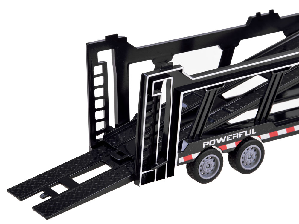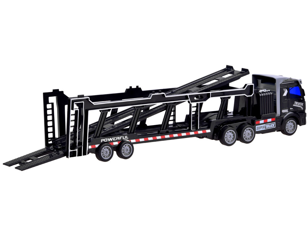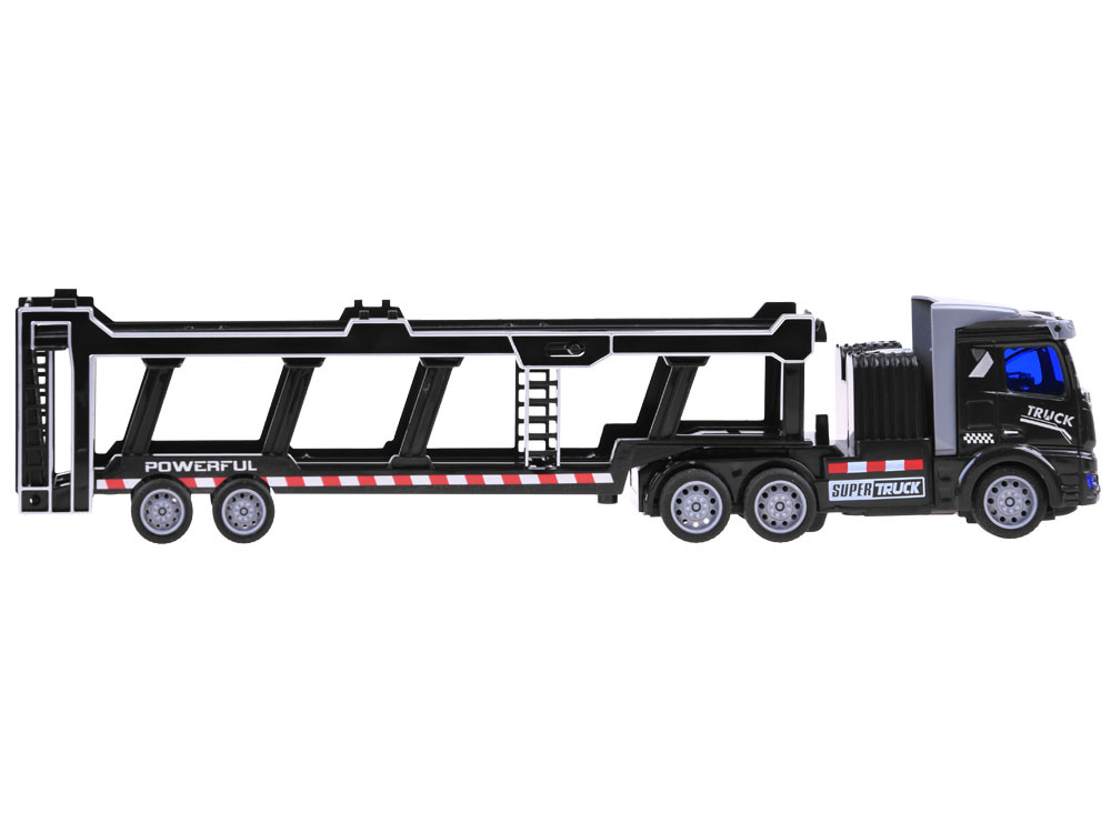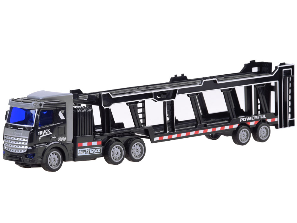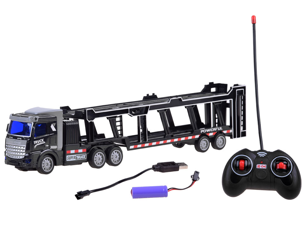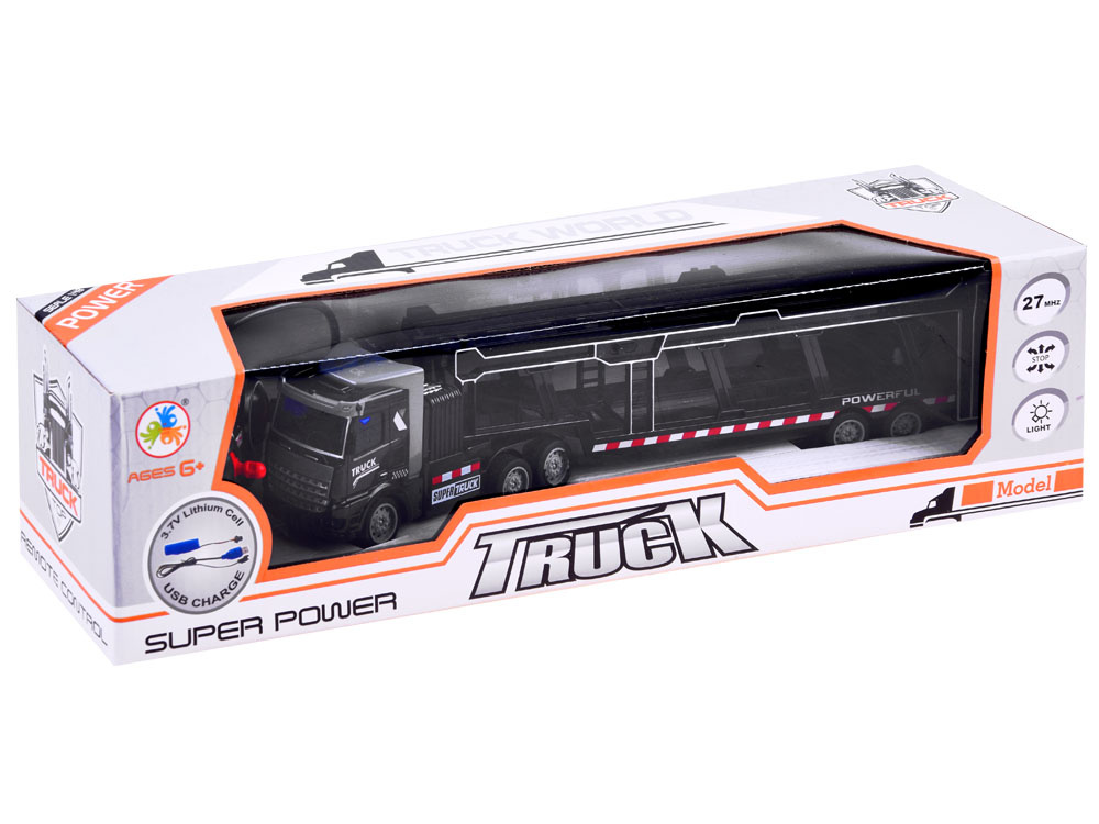 Nákladní auto s přívěsem na dálkové ovládání je hračka, se kterou se nelze nudit. Barevné provedení vozu připomíná vozidla na skutečných silnicích. Vůz se ovládá dálkovým ovladačem s frekvencí 27 MHz. Praktické dálkové ovládání s anténou padne do každé ruky, umožňuje jízdu vpřed a vzad, zatáčení doprava a doleva. Díky chytré konstrukci se přívěs nákladního vozu "láme" jako u skutečného automobilu. Vůz proto zaparkuje na jakémkoli parkovišti. Zadní dveře přívěsu lze otevřít, jeho horní podlahu lze spustit, aby se přepravovaná vozidla mohla odvalit, a celý přívěs lze odpojit od tahače.