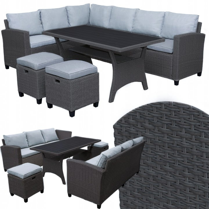 Díky technorattanu PE odolnému proti povětrnostním vlivům a vodě se sada snadno čistí, je odolná a vhodná pro každodenní použití. Jeho silné ocelové součásti jsou mimořádně odolné. Nohy nábytku jsou vyrobeny z plastu imitujícího dřevo a roh je modulární a lehký, takže jej lze libovolně přestavovat a přizpůsobit jakémukoli prostředí.Silné polštáře a robustní pufy zaručují pohodlné používání. Nosnost pufu 80 kg Nosnost rohu 600 kg Můžete jej použít jako roh s pufy nebo jej rozložit - získáte dvě pohovky a dva pufy. PODROBNOSTI - mají význam Dávejte pozor na: správně tvarované opěradlo, stínování, precizní výběr barev, imitaci barevného tření - vytváří efekt přírodního ratanu mimořádně silné polštáře zaručují jedinečnou relaxaci, vysoce kvalitní výplet. DBEJTE NA KVALITU TECHNORATTANU! Nepoužíváme plochý technorattan, ale polokruhově strukturovaný, který krásně imituje přírodní ratan. POVLAKY NA POLŠTÁŘE NA ZIP! Můžete je sundat a vyprat.