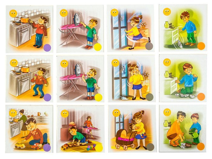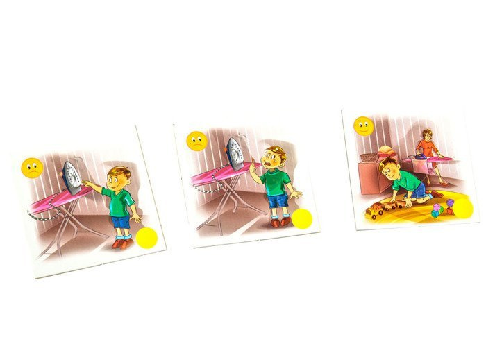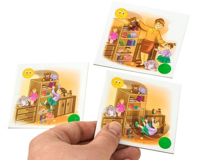 Každé dítě dostane jeden čtverec. Ostatní obrázky uspořádejte tak, aby byly vidět směrem nahoru.Děti se snaží vybrat odpovídající obrázky k příběhu a seřadit je do správného pořadí: příčina - následek - správné chování. Kdo to udělá první, vyhrává. Na konci každé batole vypráví svůj příběh.