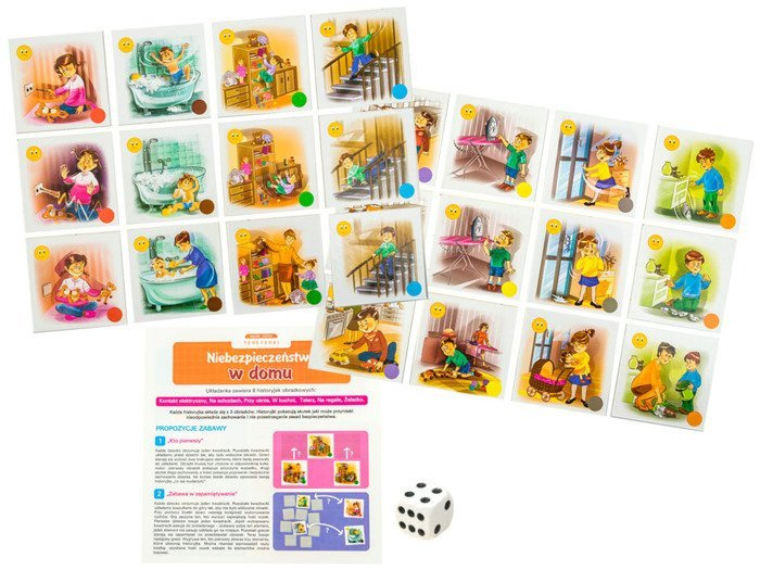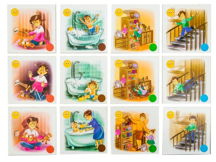Skládačka obsahuje 8 obrázkových příběhů: V koupelně, Elektrický kontakt, Na schodech, U okna, V kuchyni, Talíř, Na polici, Žehlička. Každý příběh se skládá ze 3 obrázků. Příběhy ukazují, jaký dopad může mít nesprávné chování a nedodržování bezpečnostních pravidel a jak se správně chovat. Ze všech obrázků je třeba vybrat tři odpovídající, které budou znázorňovat příběh: příčinu nehody, následek špatného chování a správné a bezpečné chování dítěte.
