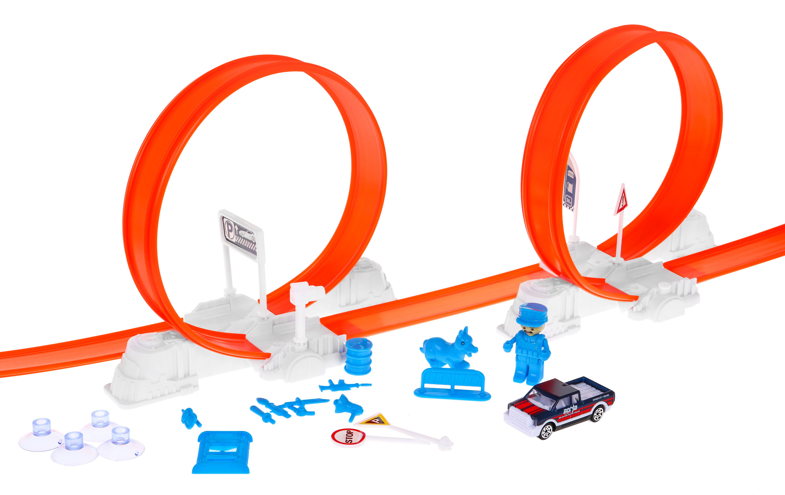 Extrémní, pevně postavená závodní dráha se dvěma smyčkami a autíčky v ceně je určena pro děti od tří let. Hračka nevyžaduje baterie. Sada obsahuje dvě vozidla, velký náklaďák s vystřelovačem a vozidlo, které po namočení vodou změní barvu. Pro zpestření zábavy byly na závodní dráze umístěny dvě velké smyčky s možností otáčení vozidla o 360 stupňů a různé překážky. Celá sada obsahuje 62 dílů pro vlastní sestavení.
