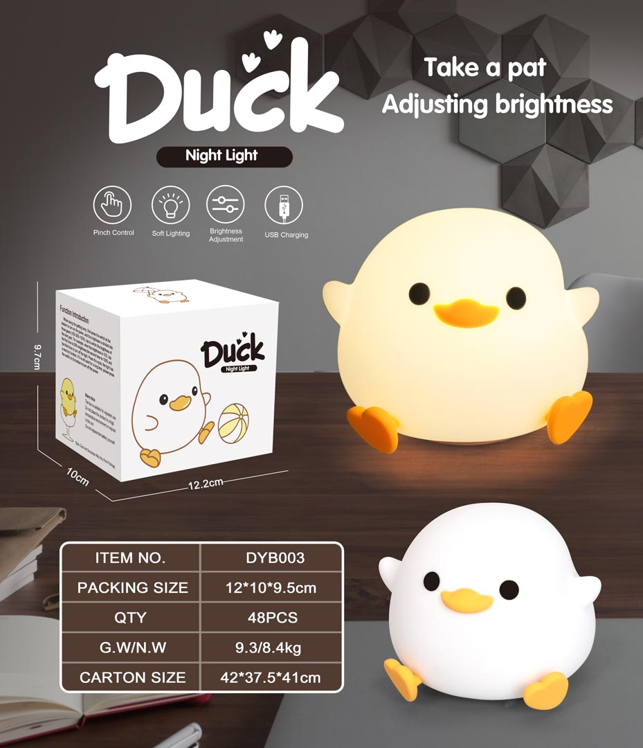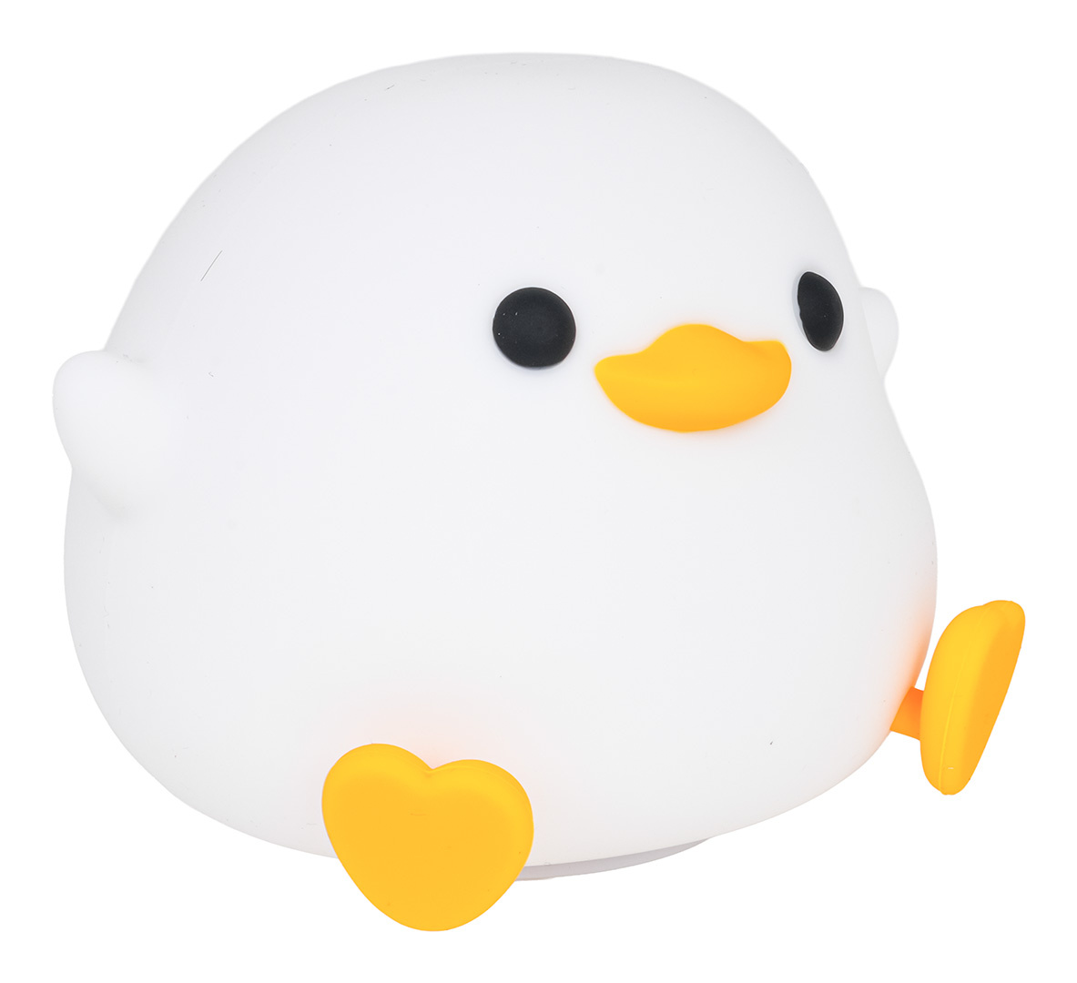 Noční lampička, kačenka pro děti od tří let. Lampička byla vyrobena ze silikonu bez BPA, měkkého a pohodlného. Dává teplé a jemné světlo, vytváří útulné a bezpečné prostředí. Nabízí tři úrovně regulace jasu (10 %, 50 %, 100 %). Lampička má vestavěnou baterii typu 3,7V, nabíjenou pomocí kabelu USB typu C. Díky dotykovému senzoru můžeš lampu zapínat nebo vypínat, a také regulovat intenzitu světla dotykem na jakémkoli místě.
