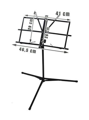 Kovový hudební stojan s práškovým nástřikem. Má základnu stativu a nastavitelnou výšku. Pracovní plocha je skládací. Stativ je doporučen jak pro profesionály, tak pro amatéry.