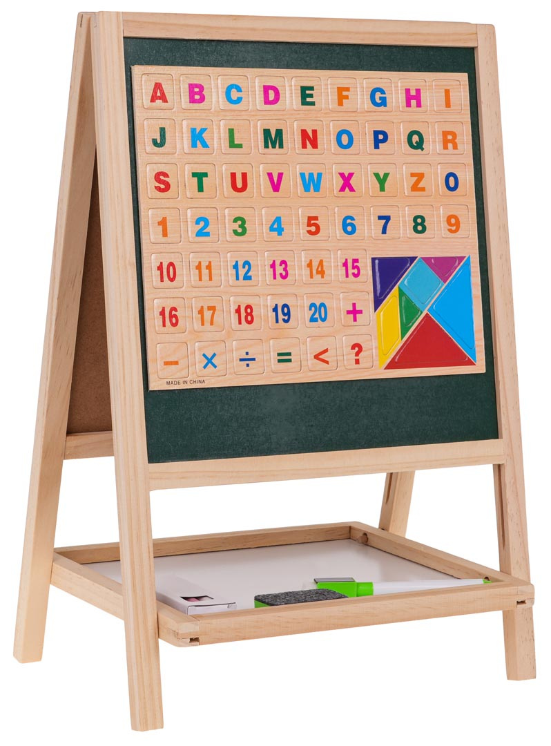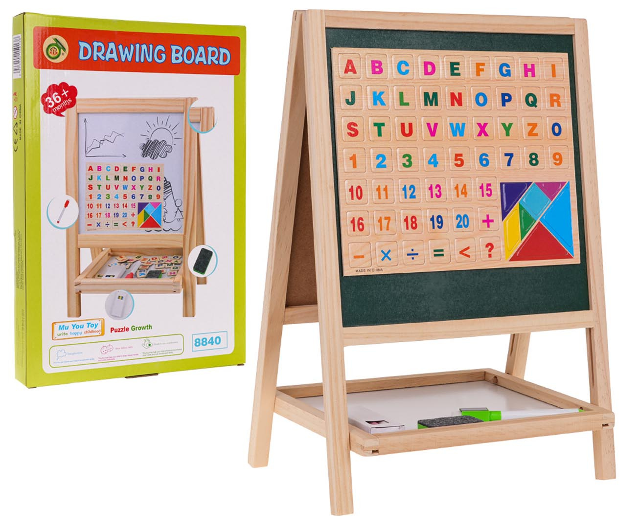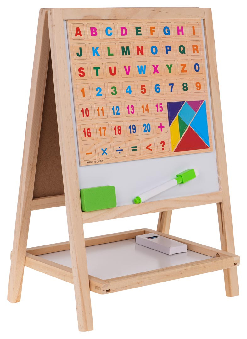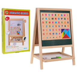 Dřevěná oboustranná tabule s příslušenstvím pro děti od 3 let. Tabule je z jedné strany bílá a slouží k malování fixem přiloženým k sadě, z druhé strany je křídová, k malování křídou přiloženou k sadě. Jak na bílé, tak na křídové straně můžeme připevňovat magnety. K sadě byly přiloženy magnety s písmenky, číslicemi, matematickými operacemi a prostorovými tvary. Sada je vybavena praktickou poličkou dole, která pojme veškeré příslušenství.