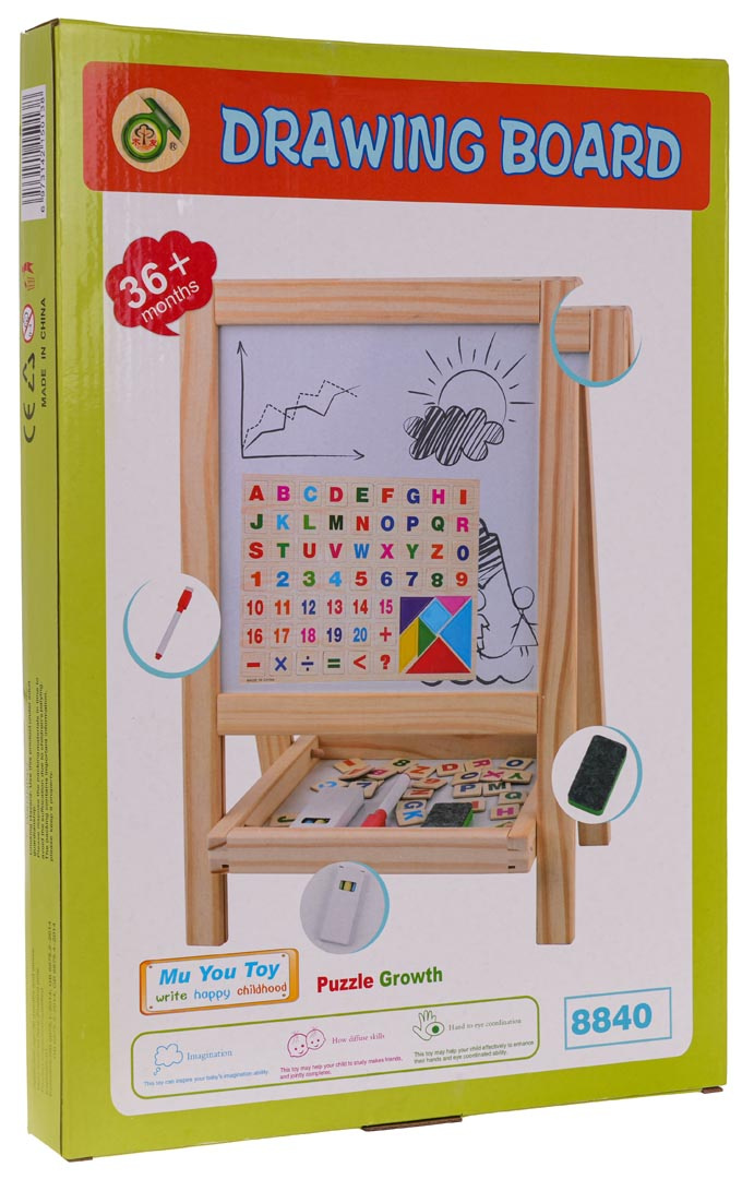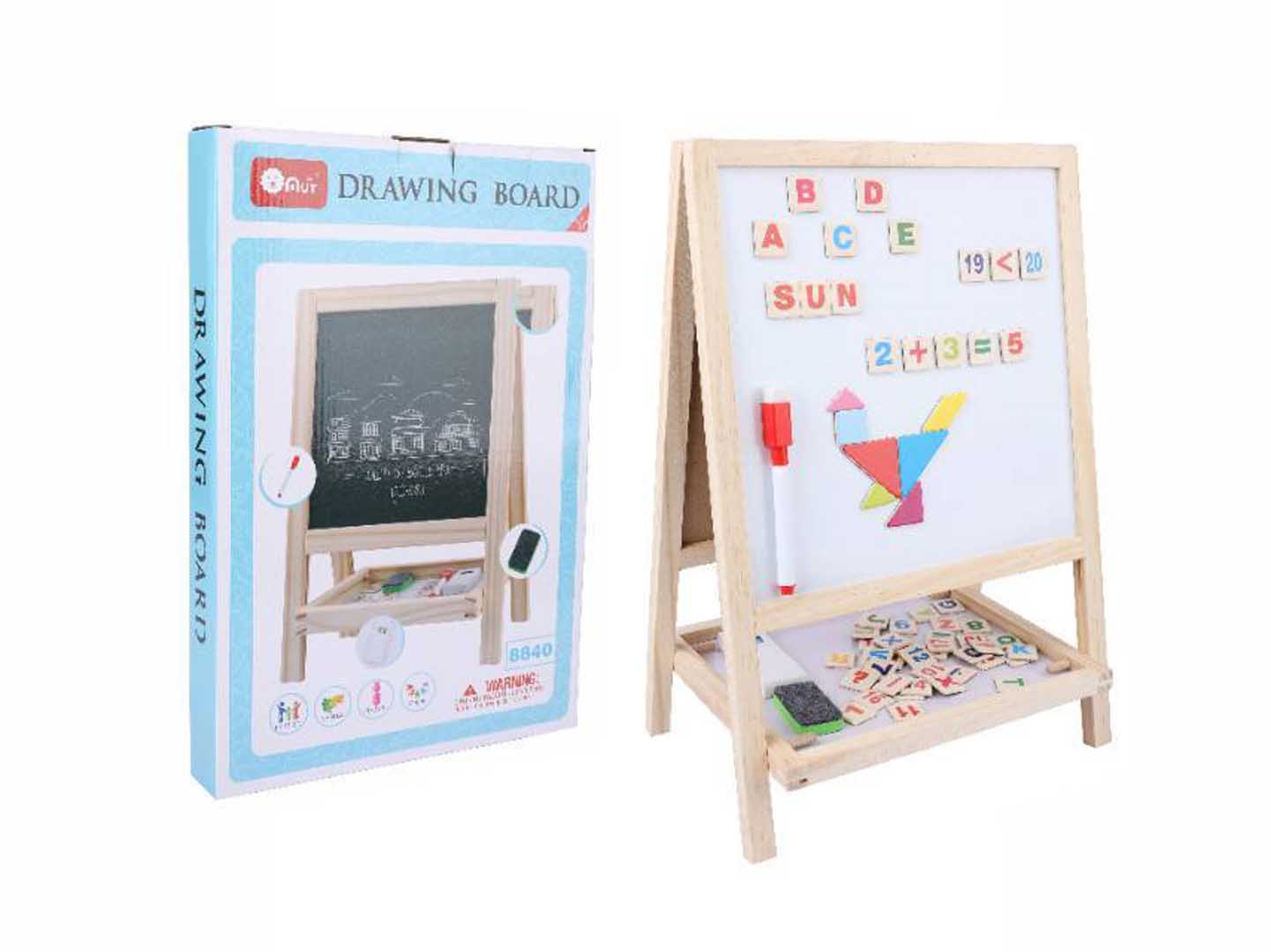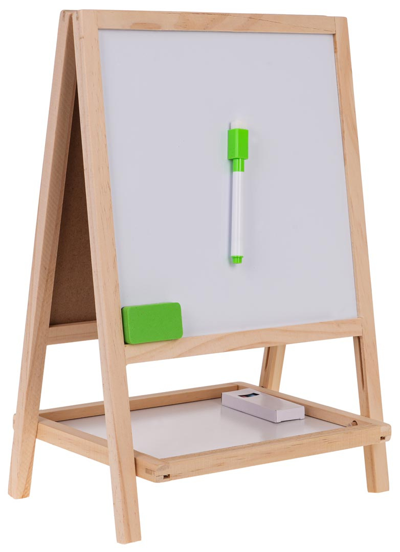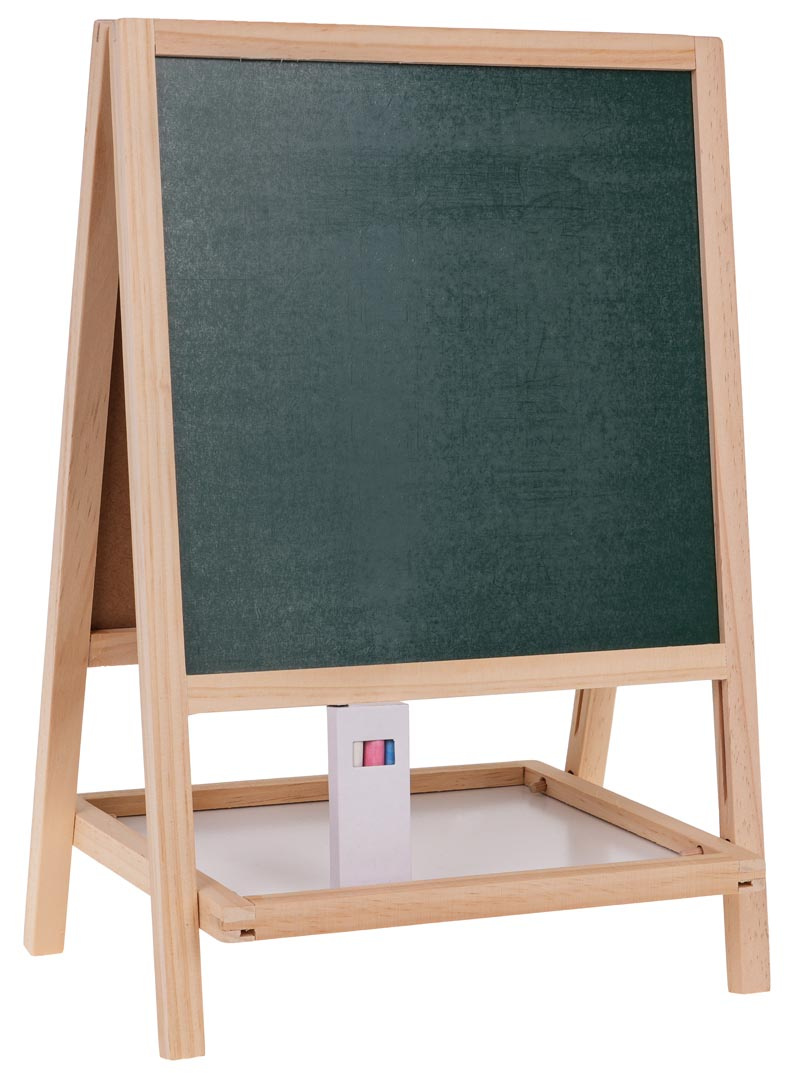 Dřevěná oboustranná tabule s příslušenstvím pro děti od 3 let. Tabule je z jedné strany bílá a slouží k malování fixem přiloženým k sadě, z druhé strany je křídová, k malování křídou přiloženou k sadě. Jak na bílé, tak na křídové straně můžeme připevňovat magnety. K sadě byly přiloženy magnety s písmenky, číslicemi, matematickými operacemi a prostorovými tvary. Sada je vybavena praktickou poličkou dole, která pojme veškeré příslušenství.