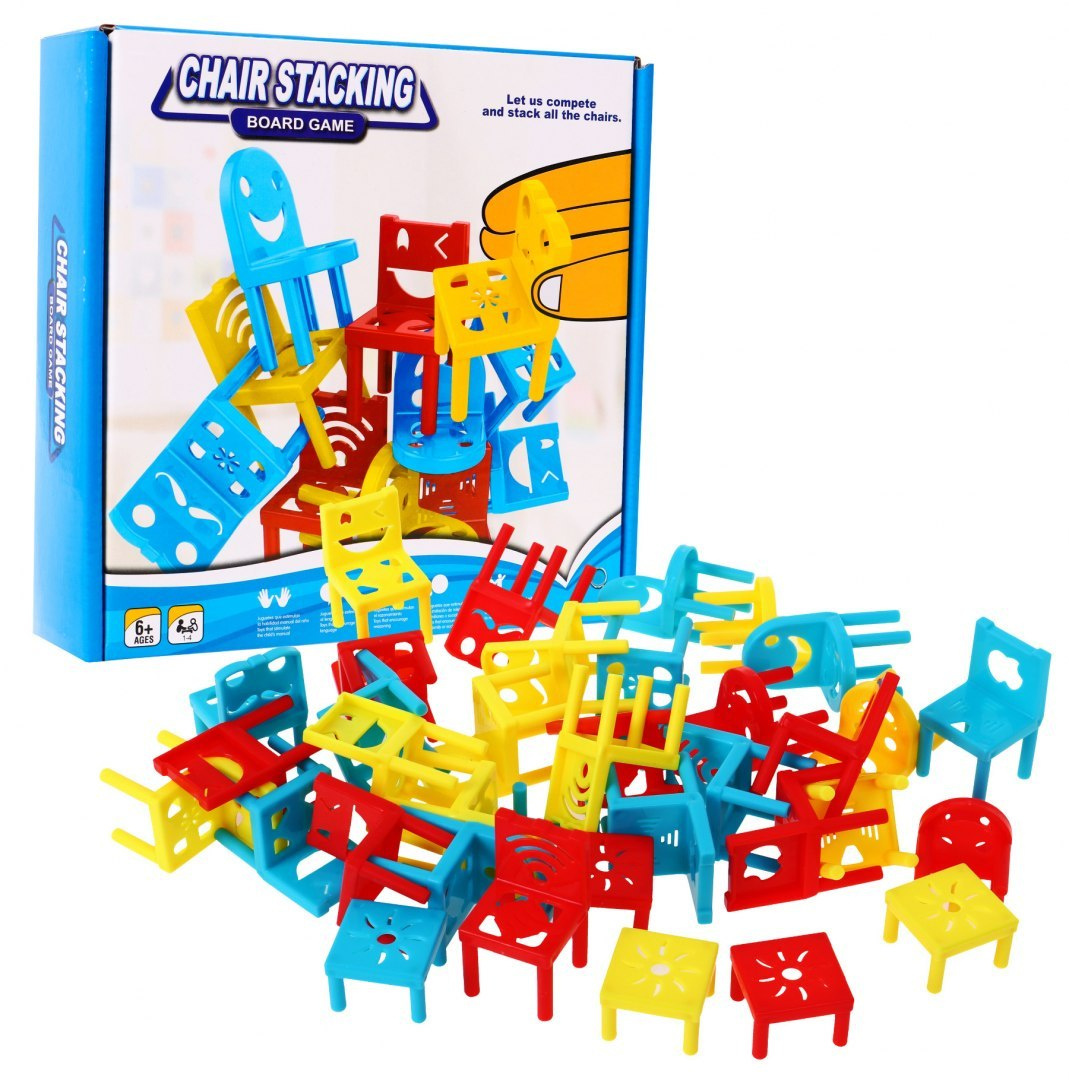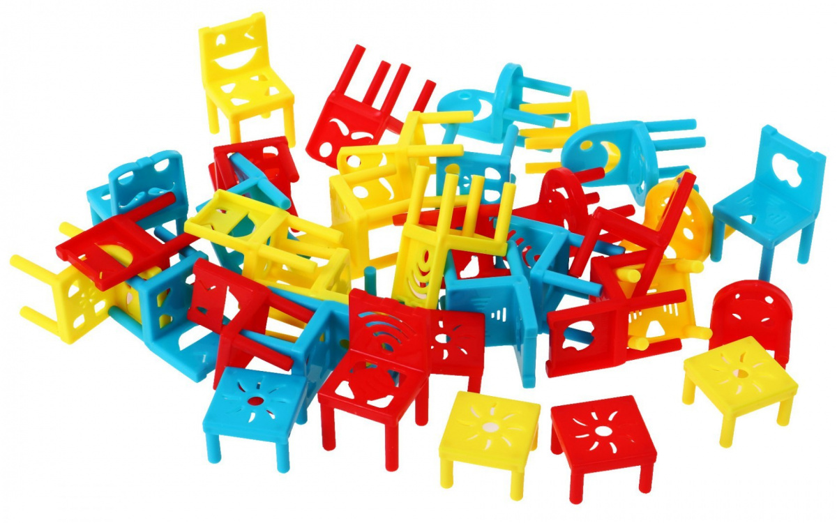 Hráči na sebe skládají židle různých barev, čím vyšší, tím lepší.