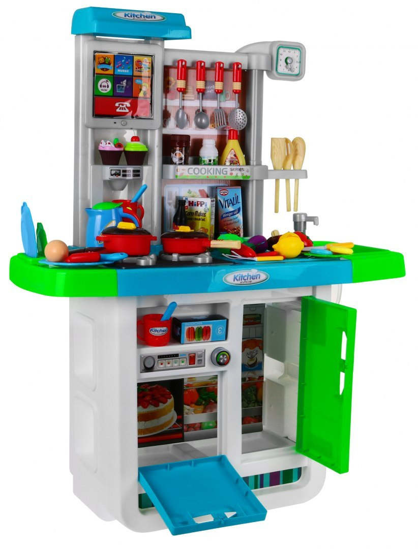 V kuchyni je otevírací trouba a lednice, 2 hořáky se zvuky a světly a dřez s kohoutkem, z něhož teče skutečná voda.