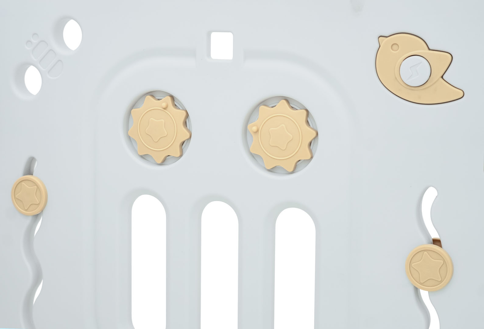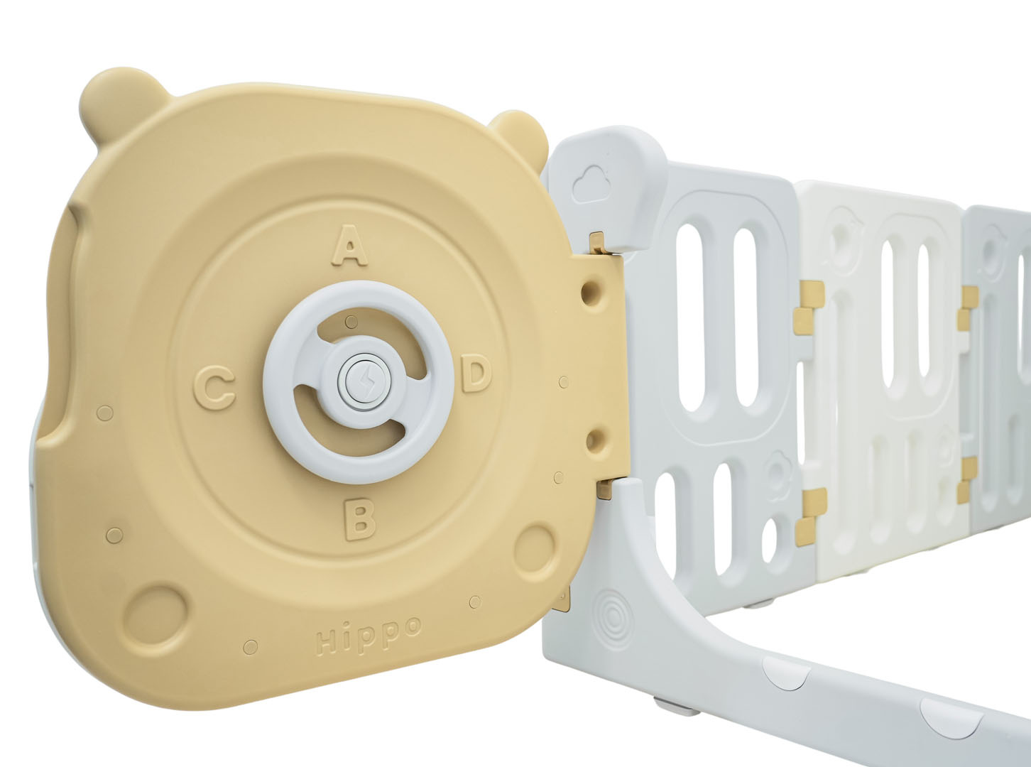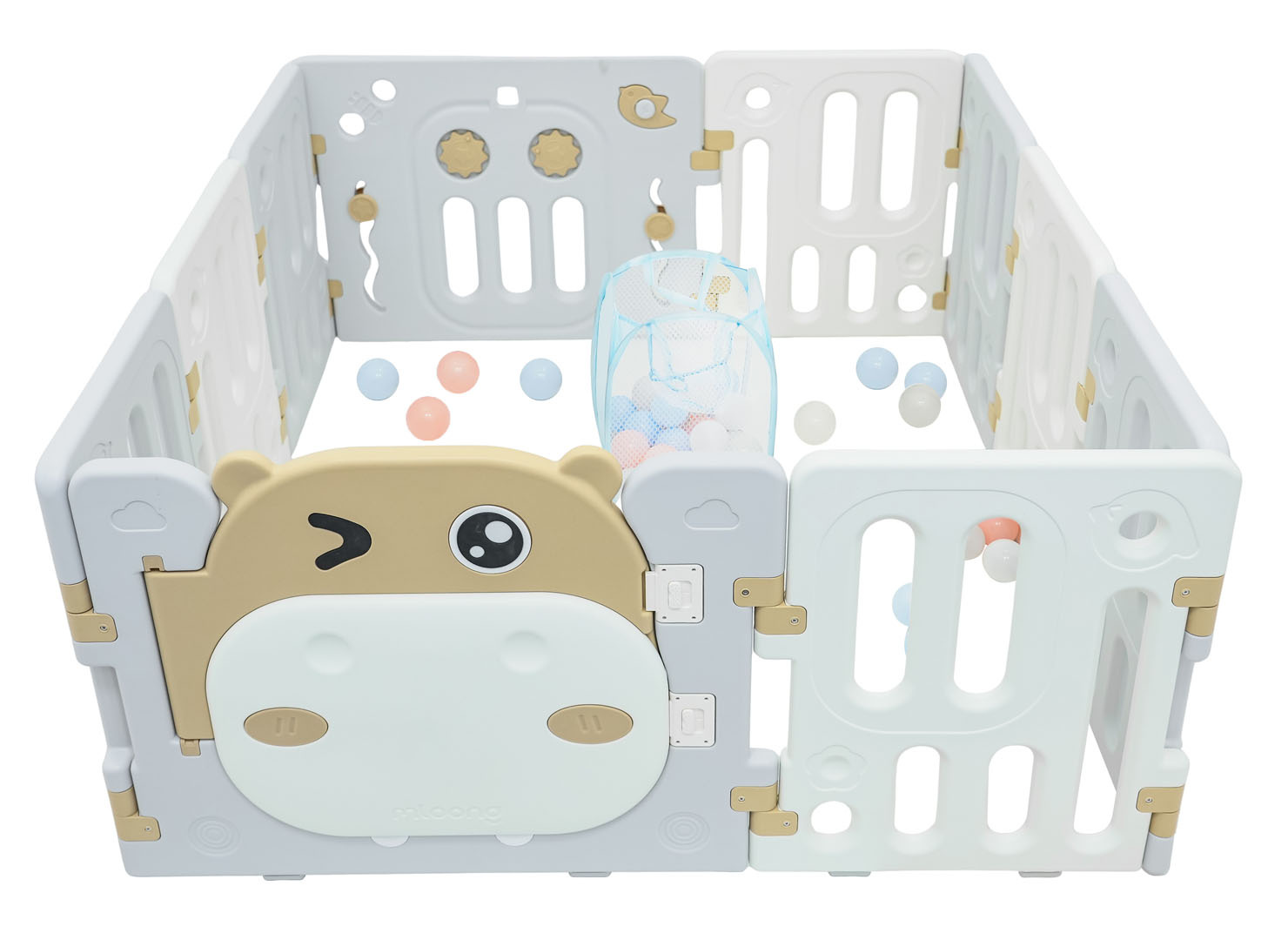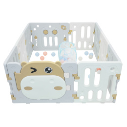 Velká, praktická, skládací modulární ohrádka pro dítě od 6. měsíce života. Z ohrádky můžeme postavit libovolnou konstrukci podle vlastních představ, velmi snadno se skládá a rozkládá, je stabilní a má hladké hrany. Vnitřek ohrádky je vybaven manipulačními prvky, jako jsou posuvné kolečko, ozubená kola, pískátko nebo volant. Sada je vyrobena z odolných a netoxických materiálů, skládá se z 10 panelů. Panel dveří se blokuje zvenku, což znemožňuje otevření dveří dítětem. Protiskluzové nožky zabraňují posouvání ohrádky. V ohrádce bude mít vaše děťátko dostatek prostoru pro volný pohyb a zároveň bude v bezpečí. V sadě se také nachází koš na míčky a 40 míčků.