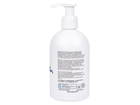 Výrobek italské značky Bubble&CO , která v retro stylu obnovuje a posiluje tradice tím, že nabízí hygienické a pečující výrobky pro dítě a celou rodinu založené na přírodních certifikovaných surovinách, výhradně z ekologického zemědělství. Výrobky jsou navrženy tak, aby vyhovovaly potřebám pleti všech věkových kategorií, od narození až do 100 let.
