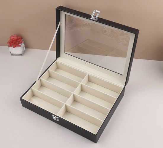 BEZPEČNÉ UVNITŘ - vnitřek organizéru je vystlán měkkým materiálem, uložené brýle jsou chráněny proti poškrábání. Přihrádky jsou od sebe odděleny vyššími stěnami, což chrání uložené sklenice před nežádoucím kontaktem, který by mohl mít za následek poškození.
