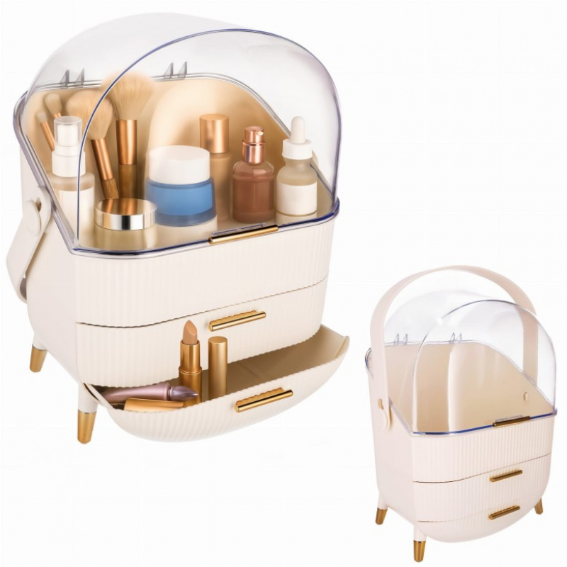 Víceúrovňová konstrukce – horní část s místem na lahve + spodní šuplíky na drobnostiOtevírací vršek – snadný přístup ke kosmeticeUniverzální design – skvěle se hodí jak do koupelny, tak na elegantní toaletní stolek Úspora místa – kompaktní, ale prostornýOdolnost proti vlhkosti – ideální pro použití v koupelněOdolný materiál – pevný plast, snadno se čistíEstetické provedení – skvěle vypadá a vystavuje kosmetiku