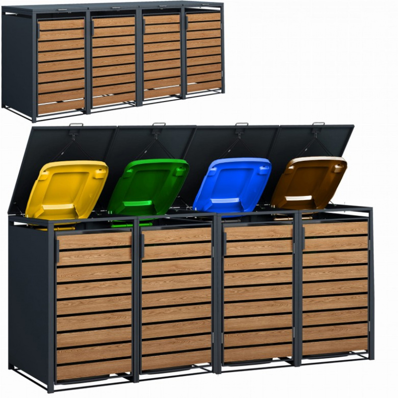 Kryt navržený pro 4 koše o objemu 240 litrů Dvoukřídlé dveře vybavené úchyty. Spojovací prvky, závěsy, uzávěry Konstrukce má přední dveře pro vjezd kontejnerem a zvedací horní víko s blokací výšky. Materiály odolné vůči proměnlivým povětrnostním podmínkám, trvanlivé a nevyžadující údržbu. Moderní, estetický vzhled vestavby. Lehká a zároveň pevná konstrukce umožňuje přenesení vestavby dvěma osobami. Vestavba má otevírací horní víko, které umožňuje snadný přístup k nádobám na odpadky. K hornímu víku je připevněna vhodně zvolená plynová pružina, která usnadňuje jeho otevírání a udržení v horní poloze pod optimálním úhlem. S ohledem na ochranu konstrukce při zavírání víka jsou použity speciální nárazníky tlumící nárazy. ✅ PLYNOVÁ PRUŽINA - připevněná k hornímu víku, usnadňující jeho otevírání a zastavení v odpovídající výšce ✅ TLUMICÍ NÁRAZNÍKY - systém pomalého klesání, který zajišťuje ochranu konstrukce ✅ OTEVÍRATELNÉ HORNÍ VÍKO - umožňující snadný přístup k odpadkovým nádobám a držák, ke kterému lze přivázat víko koše, takže se bude otevírat spolu s krytem ✅ MAGNETICKÝ ZÁMEK - zajišťující dveře proti otevření