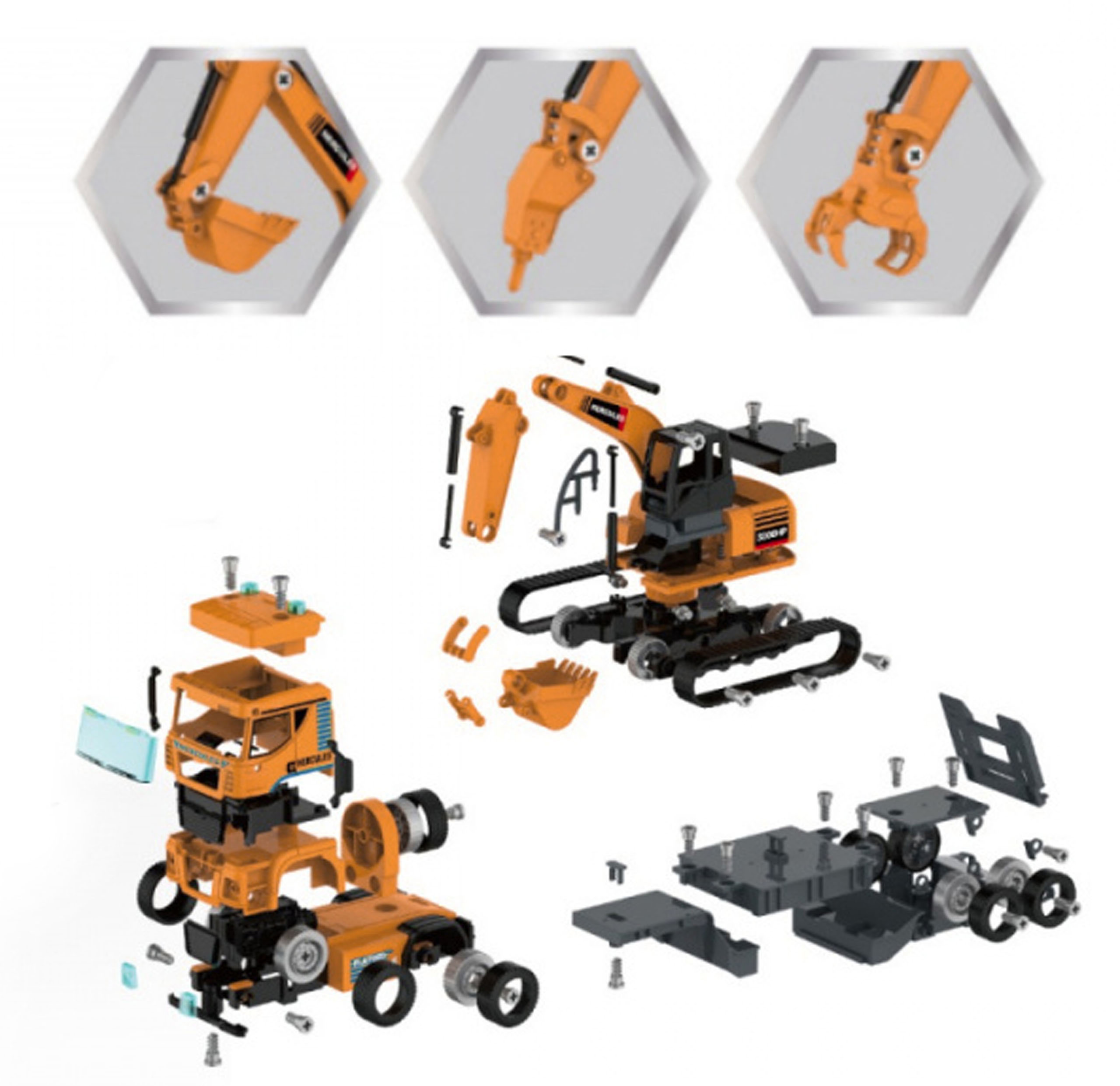 Velká, nádherně zpracovaná sada náklaďáku a bagru pro kutily je vhodná pro děti od tří let. Soubor se skládá ze 185 prvků. Hračka má zvukové a světelné efekty. Na střeše vozu blikají světla a ozývají se zvuky zapalování, couvání a klaksonu.kabina kamionu se nakloní dopředu. Šroubovák při vrtání nebo šroubování vydává zvuky a rozsvítí se modrá LED dioda. Kabina rypadla se otáčí o 360 stupňů a rameno se lžící se zvedá nahoru a dolů a provádí nabírací a vyklápěcí manévry. Sada obsahuje 3 vyměnitelné bity pro bagr: lžíci, vrták a drapák.vůz má gumové pneumatiky a zvládne jízdu v různém terénu. Hračka je napájena 3 x 1 baterií.5 AG13 (dodává se), šroubovák s 3 x AA bateriemi 1.5V (není součástí dodávky).