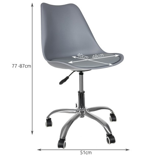 SPECIFIKACE - barva: černá + chrom; materiál: polypropylen + polštář z eko kůže; kola: gumová;mechanismus: páka; maximální zatížení 150 kg; rozměry polštáře (délka / šířka): 44 x 38 cm; rozměry sedáku (délka / šířka): 48 x 40 cm; rozměry opěradla (šířka / délka): horní 30 - spodní 47 x 40 cm; nastavení výšky židle: 77-87cm;hmotnost křesla: 5,15 kg; hmotnost s obalem: 7,16 kg.