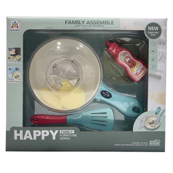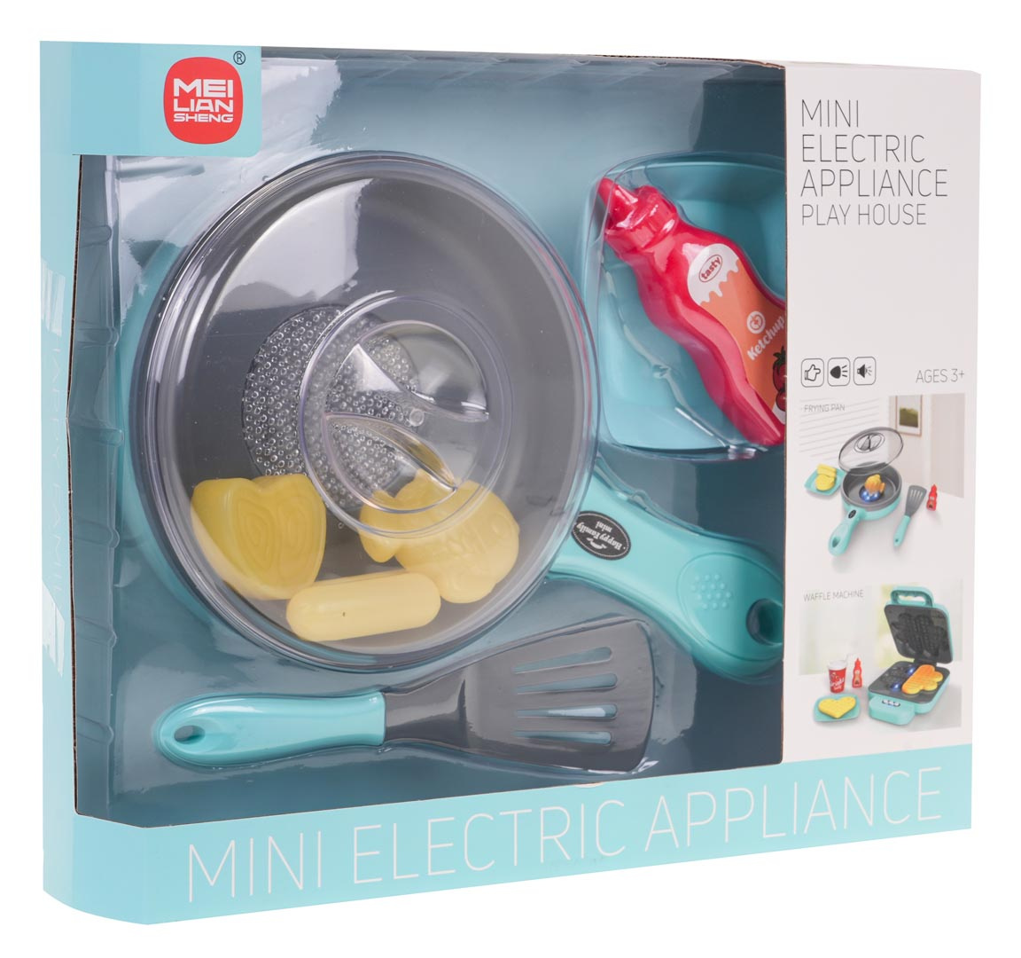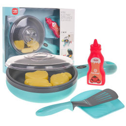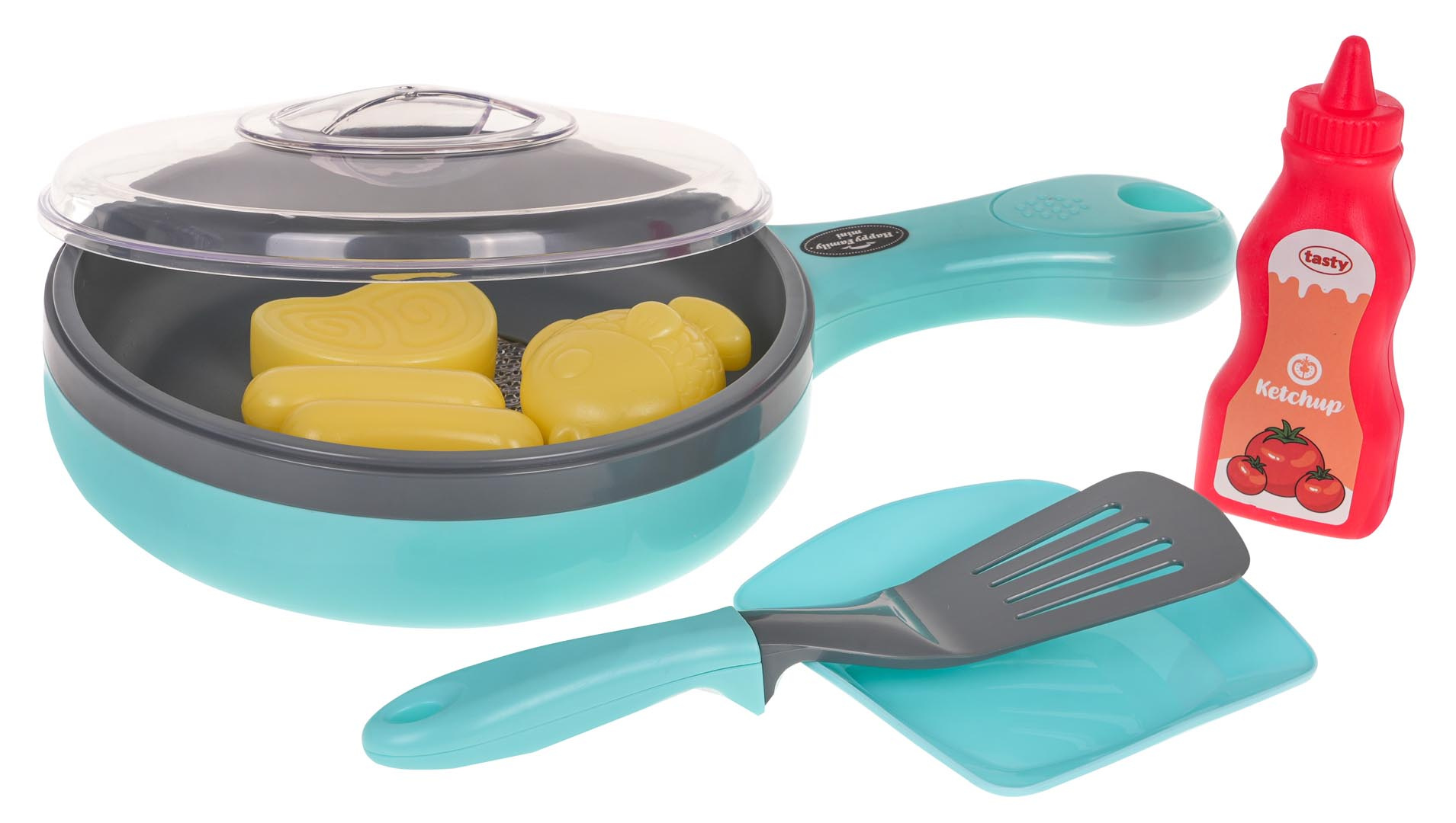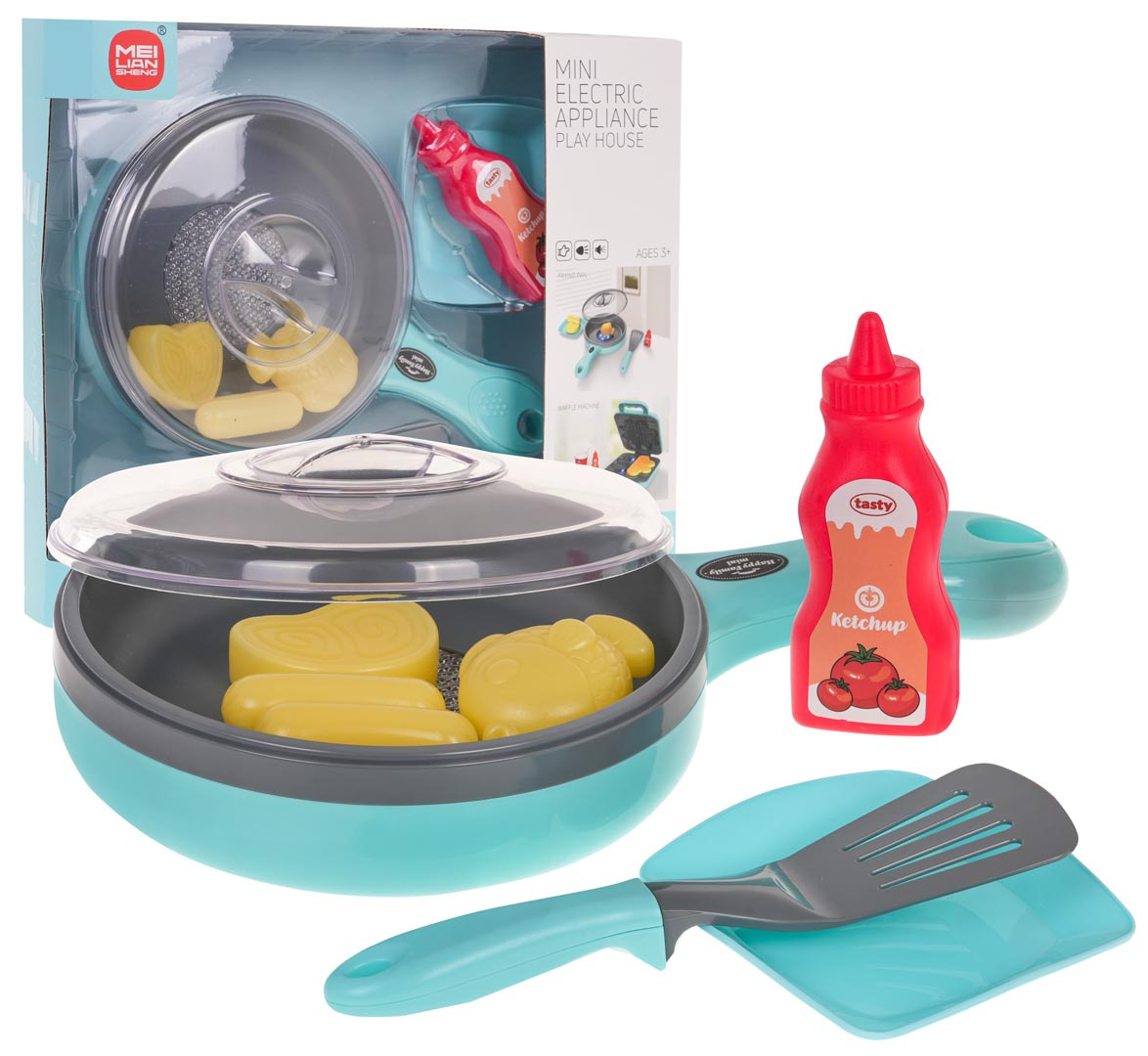 Interaktivní pánev s funkcí zvuku a světla pro děti od 3 let. V sadě najdeme pánev s pokličkou, obracečku, talířek, kečup, rybičku, klobásky a steak. Pánev je napájena bateriemi typu 2 x AAA 1,5 V (nejsou součástí balení). Po vložení baterií a zapnutí hračky je slyšet zvuky smažení a uvnitř pánve se rozsvítí světla. 3 diody, které jsou odpovědné za ohřívání produktů, a díky tomu produkty mění barvu a vypadají upečeně.